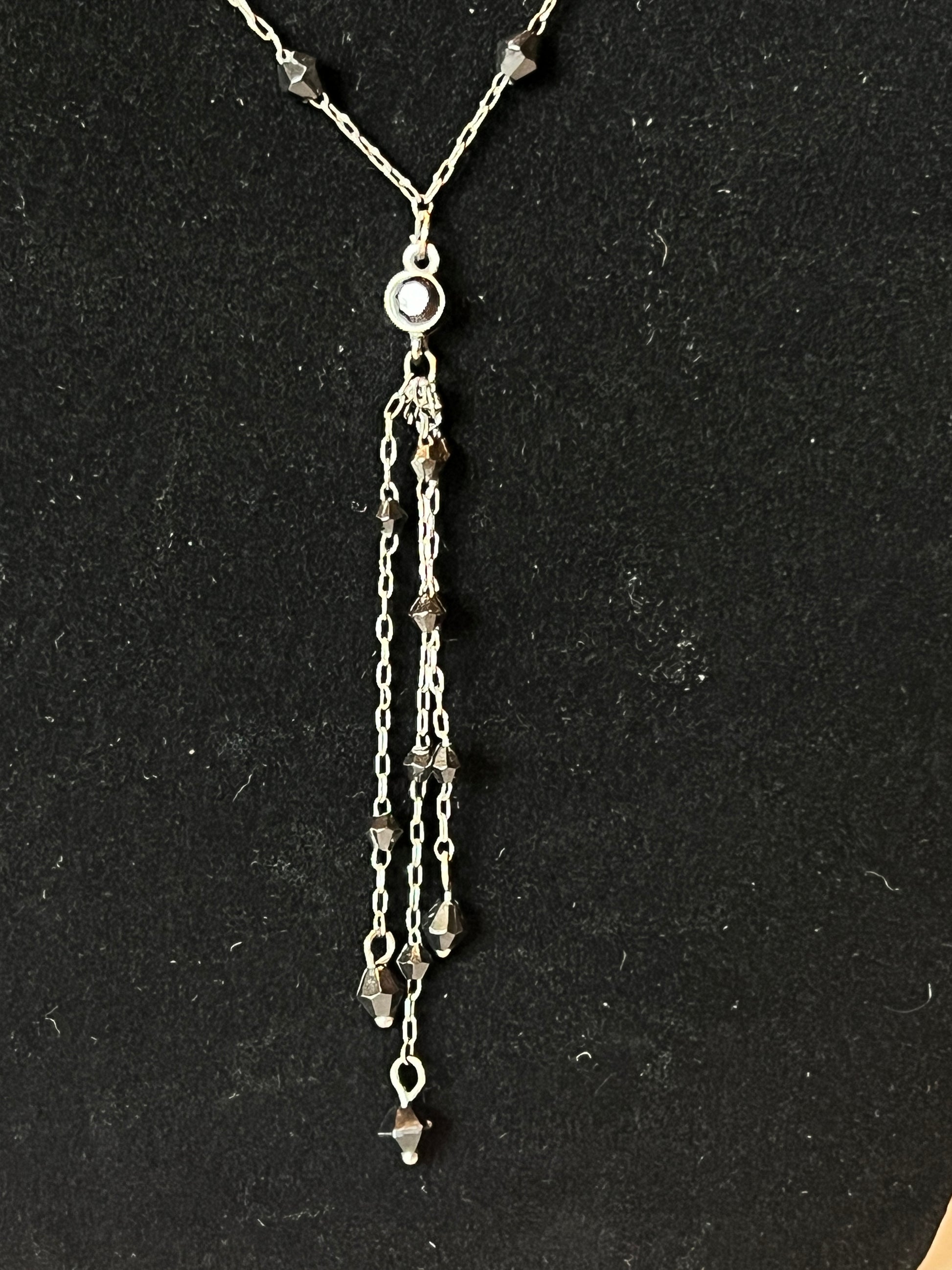 Stylish and eclectic, this art deco inspired piece is a mix of black chain and jet colored beads. The dangle "Y" has 3 chains.