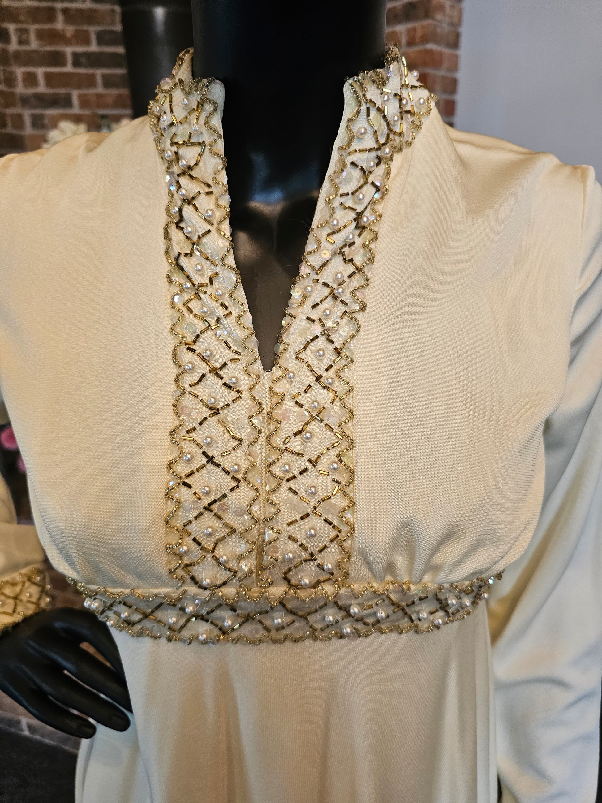 This amazing vintage gown has style and class. The ivory rayon jersey fabric has weight to it and flows beautifully through the sweep train. The high collar v-neck is detailed with gold beaded edging and and flattering empire waistline. The fitted long sleeves end with more beaded details at the wrist.