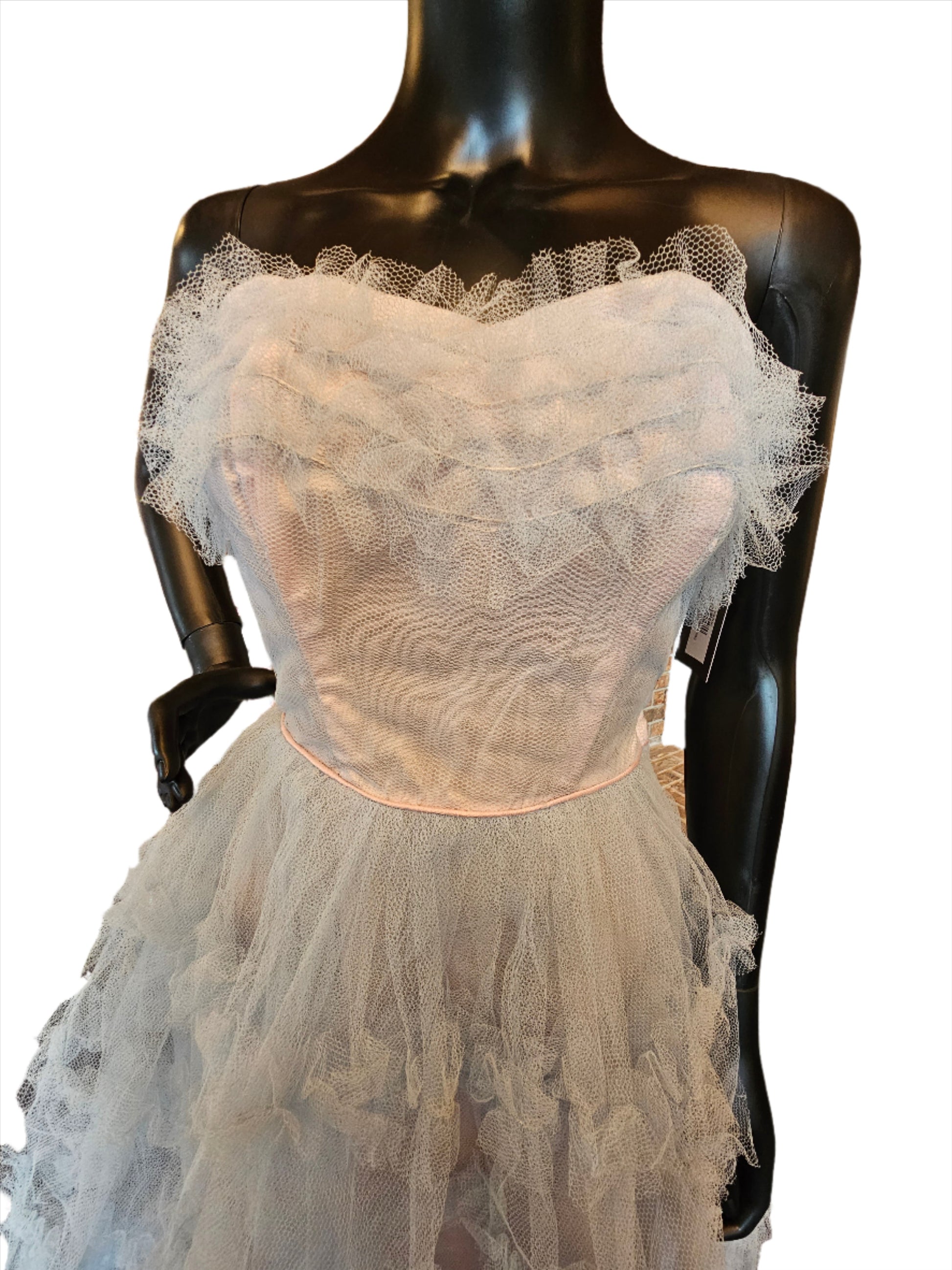 This classic 50's gown is fun and gorgeous. The layers of fluffy tulle make this dress stand out and accentuates the fitted waist. The strapless bust design is covered in matching tulle for a well-rounded look. Draw in some vintage to your next prom or special occasion.