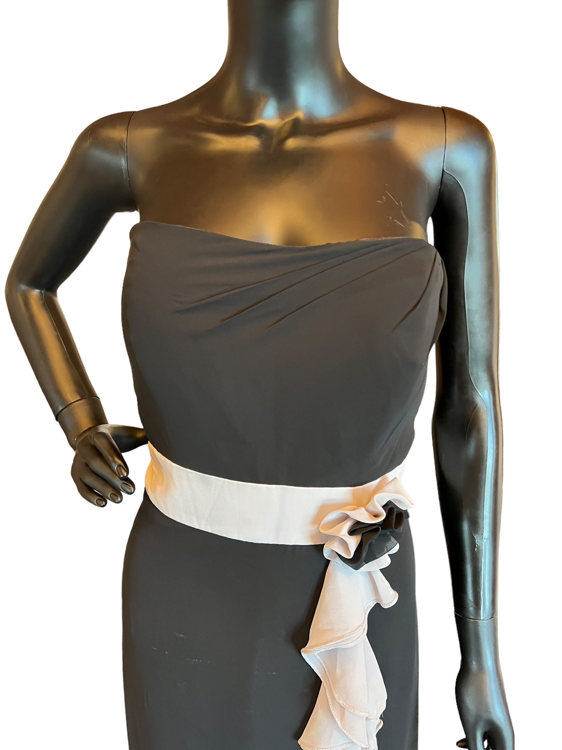 Special Attributes: White belt tied with a white/black flower, white fluttered fabric down the side