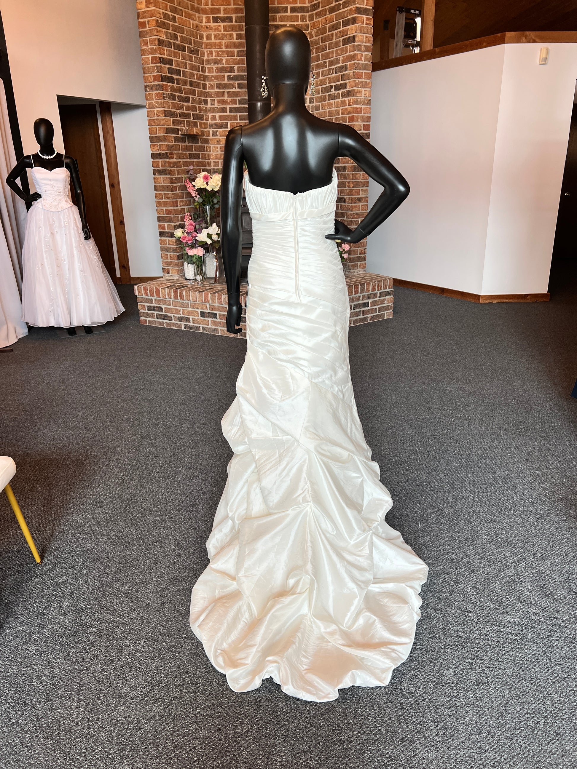 Simple and pretty! This ivory taffeta gown has lots of detail but it's all in intricate folds and tucks. The straight strapless bodice features some crystal beading along an empire waist but is fitted through the waist and hips and flares out into a modified mermaid silhouette.