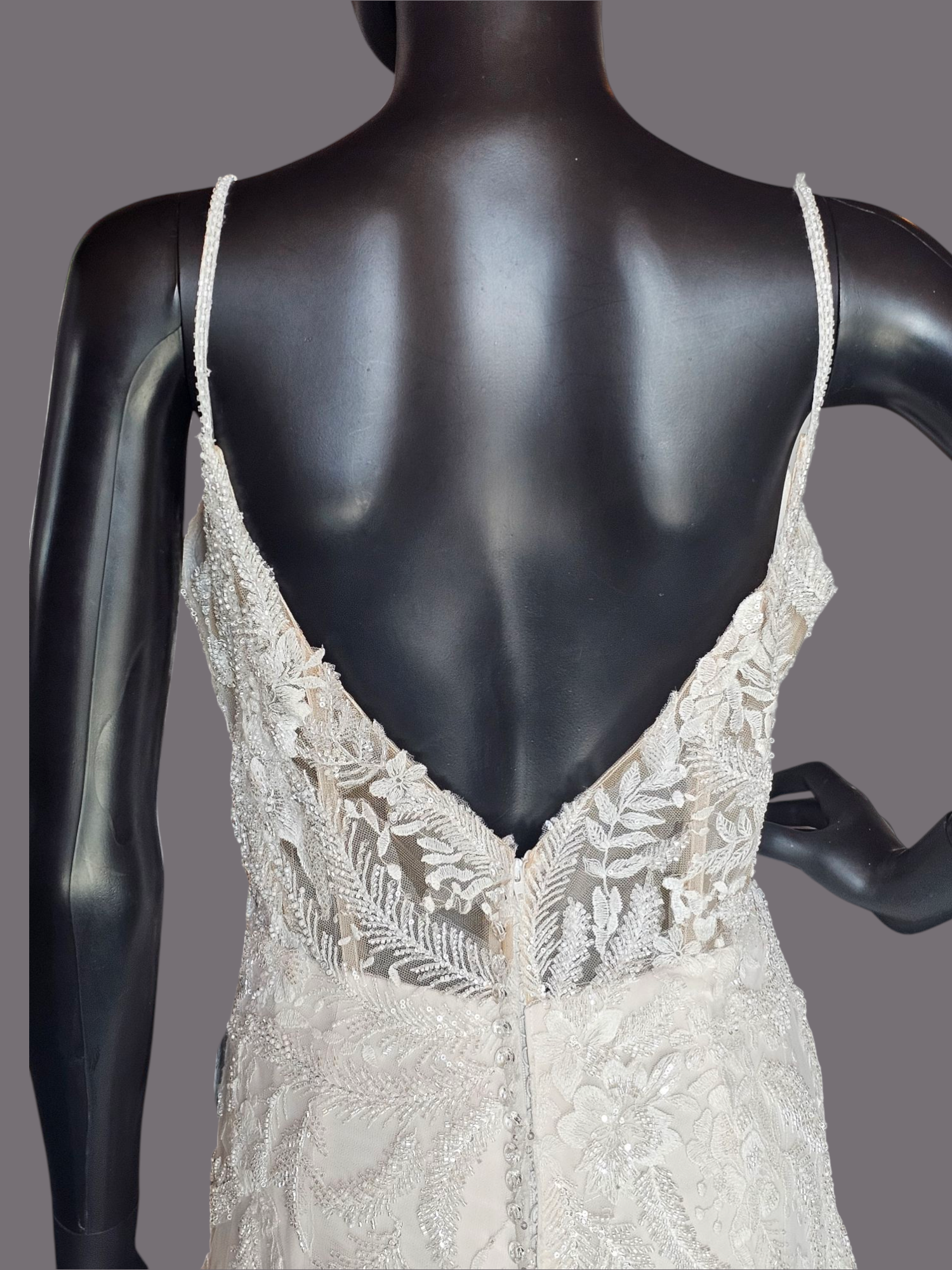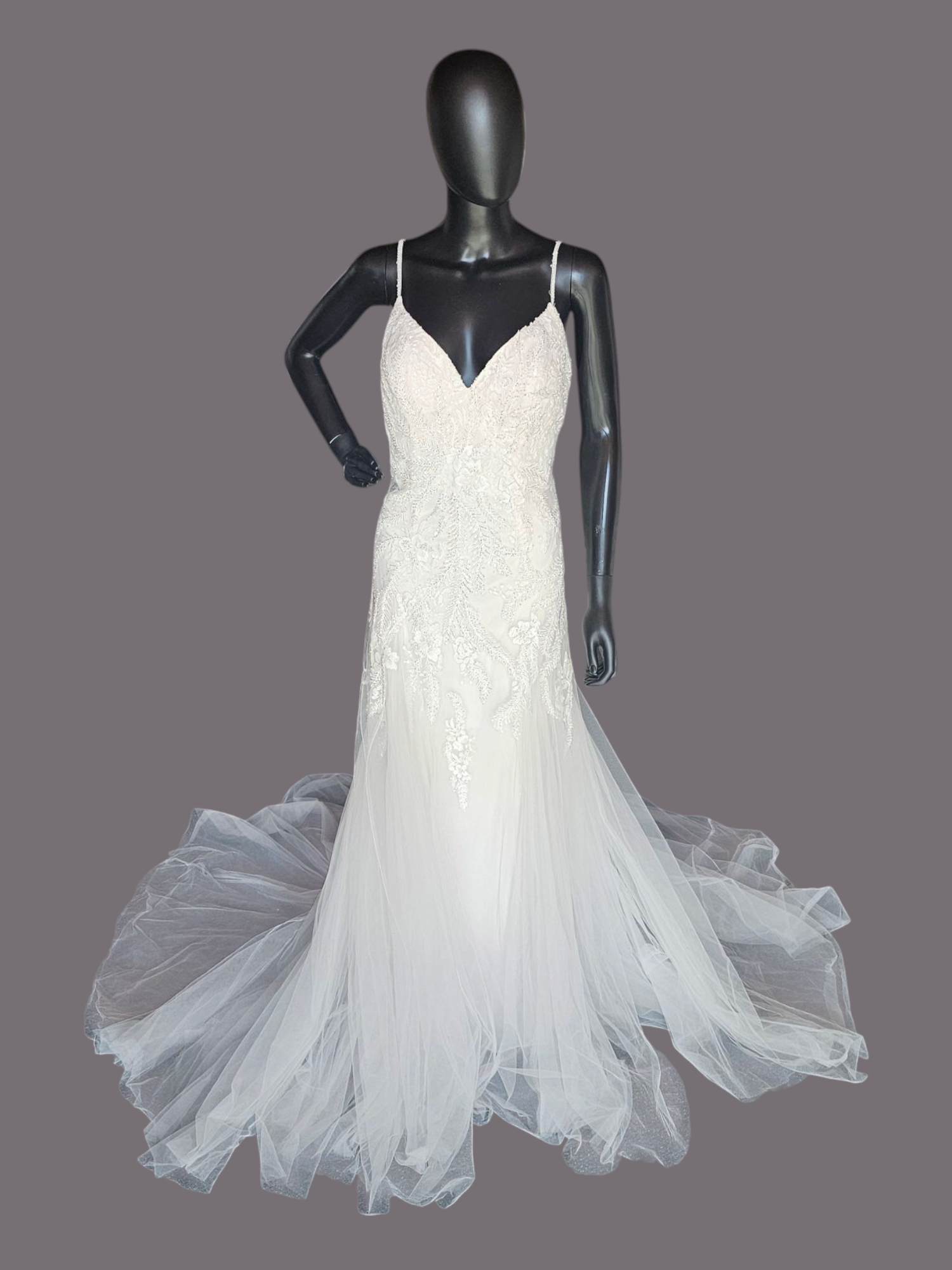 Step into a world of elegance and romance with our Beaded Fit/Flare Illusion Wedding Gown from Allure NWT. The fit and flare silhouette enhances your curves, while the sweetheart neckline and spaghetti straps add a touch of femininity. The illusion back and intricate beaded leaf/ivy details bring a subtle shimmer, and the tulle overlay train completes this stunning gown.