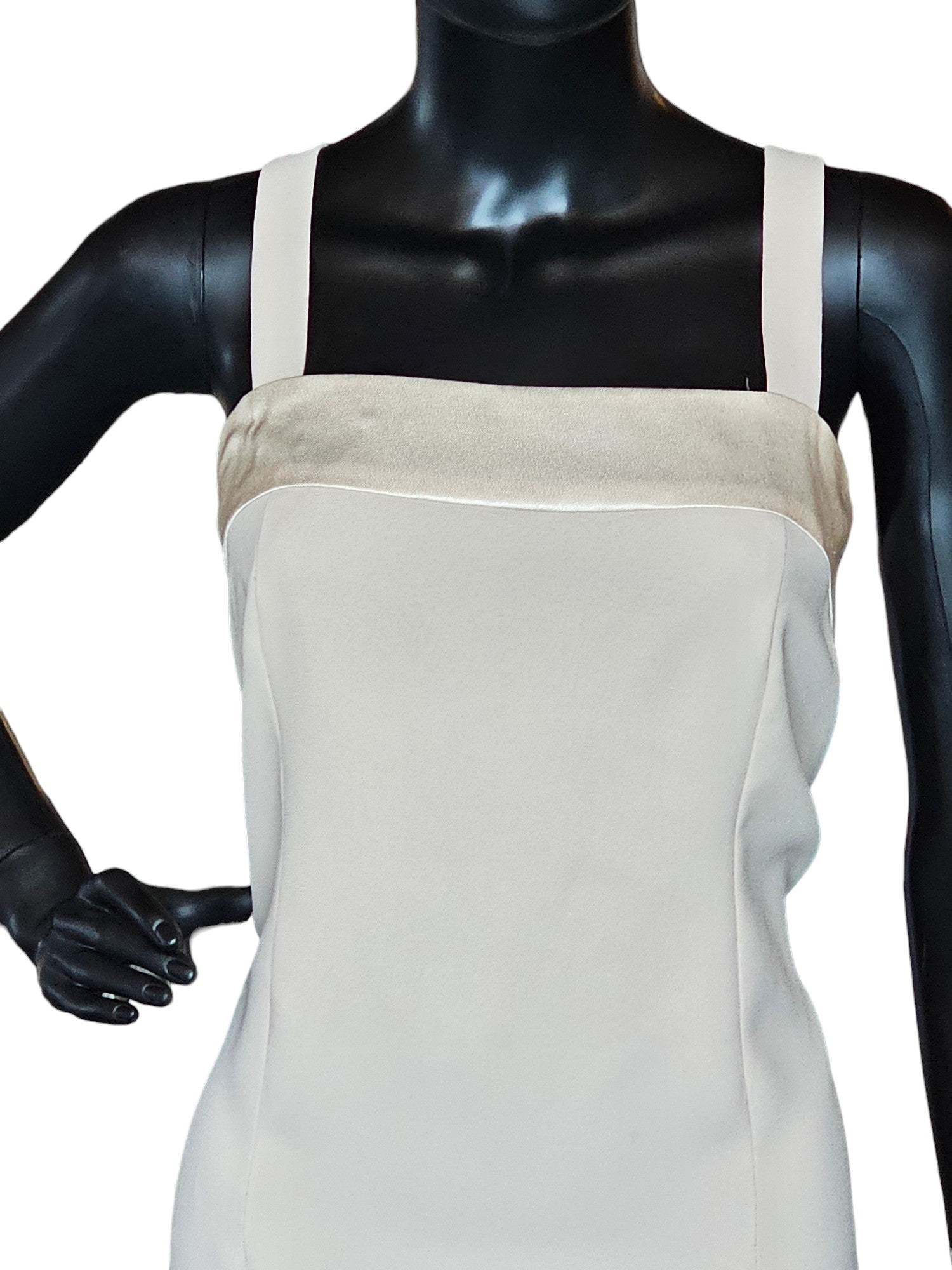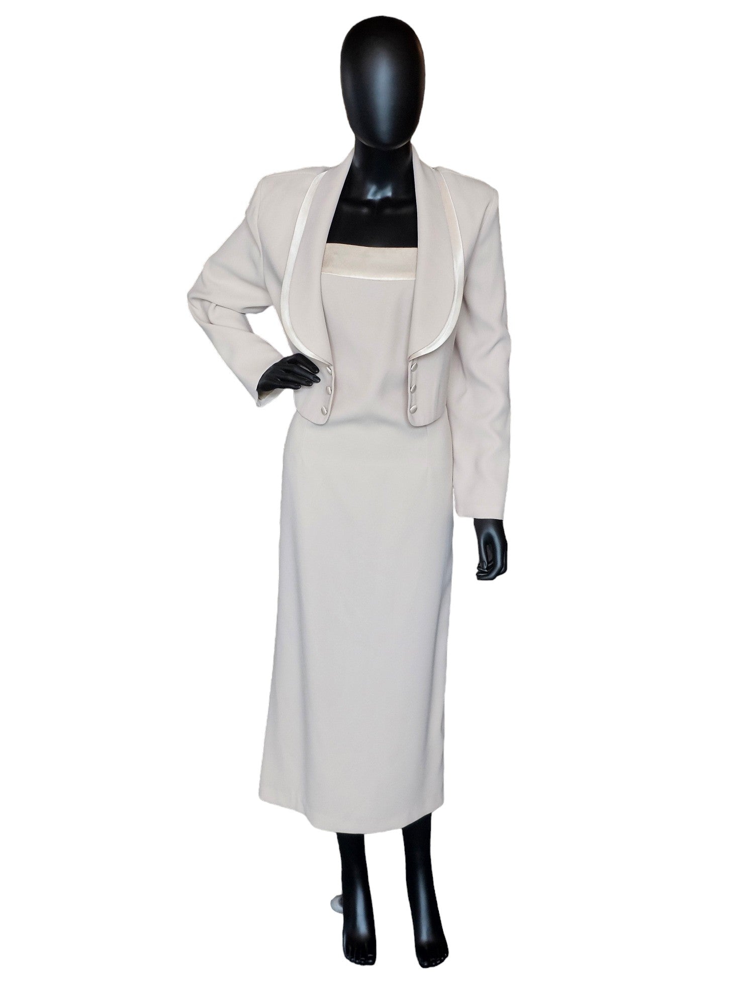 This gorgeous evening suit is chic and elegant. This would be great for a mother of the bride/groom but could also double as a non-traditional wedding dress or as part of a wedding trousseau. The biscuit colored crepe ankle length straight cut dress features a square neckline and wide shoulder straps. The neckline is edged in a creamy satin of the same color for just a hint of shimmer. The matching cropped jacket is beautifully tailored with a double shawl lapel, one in crepe and one in satin and button details. Stunning!