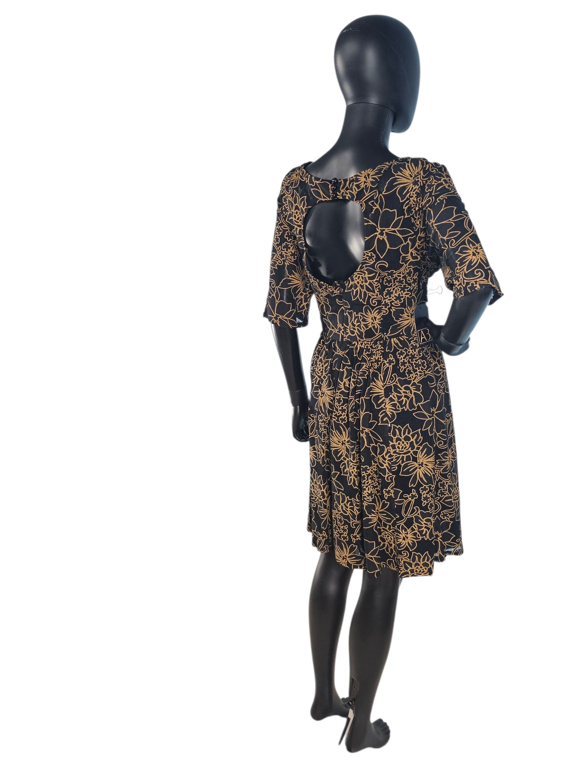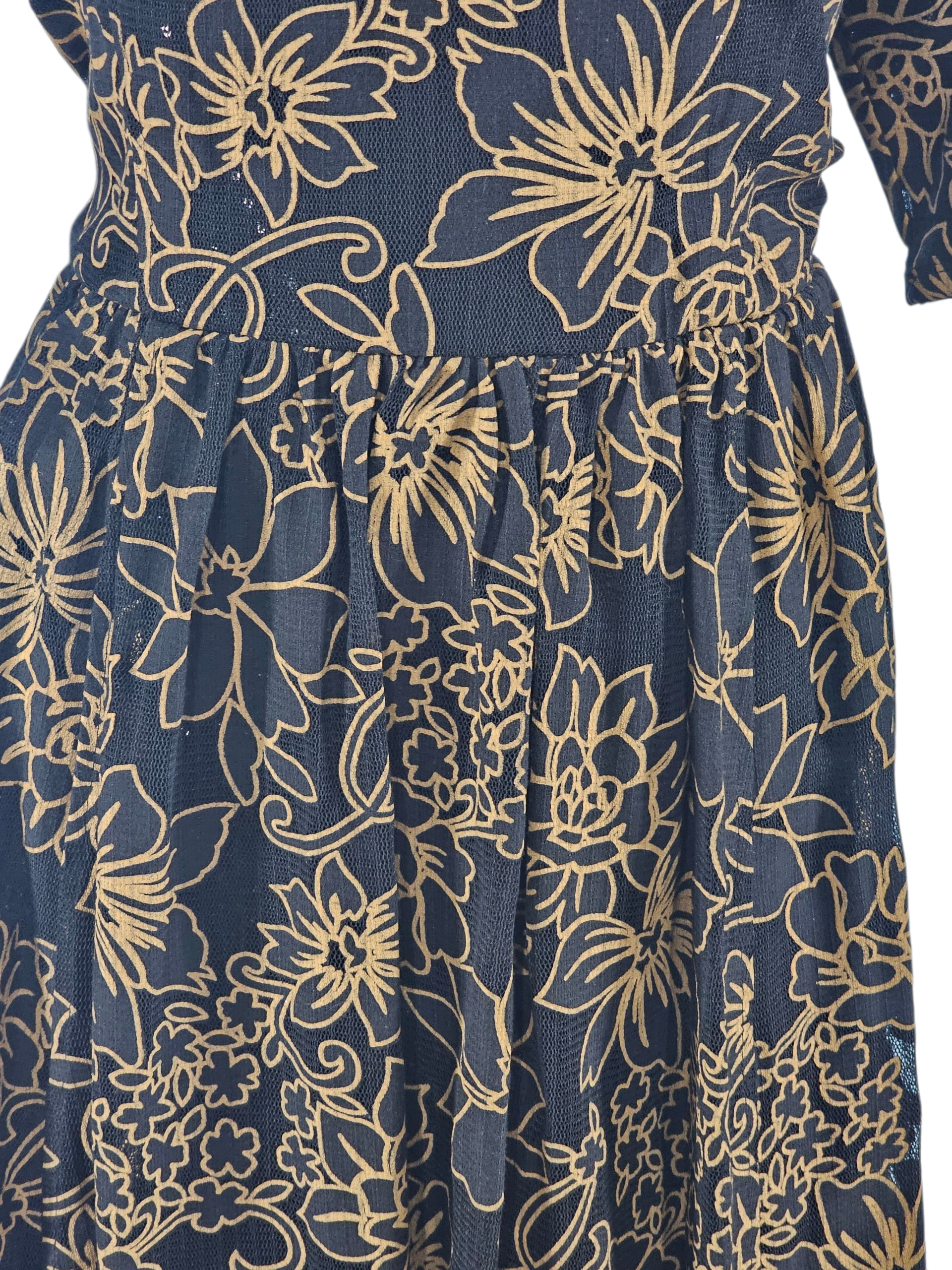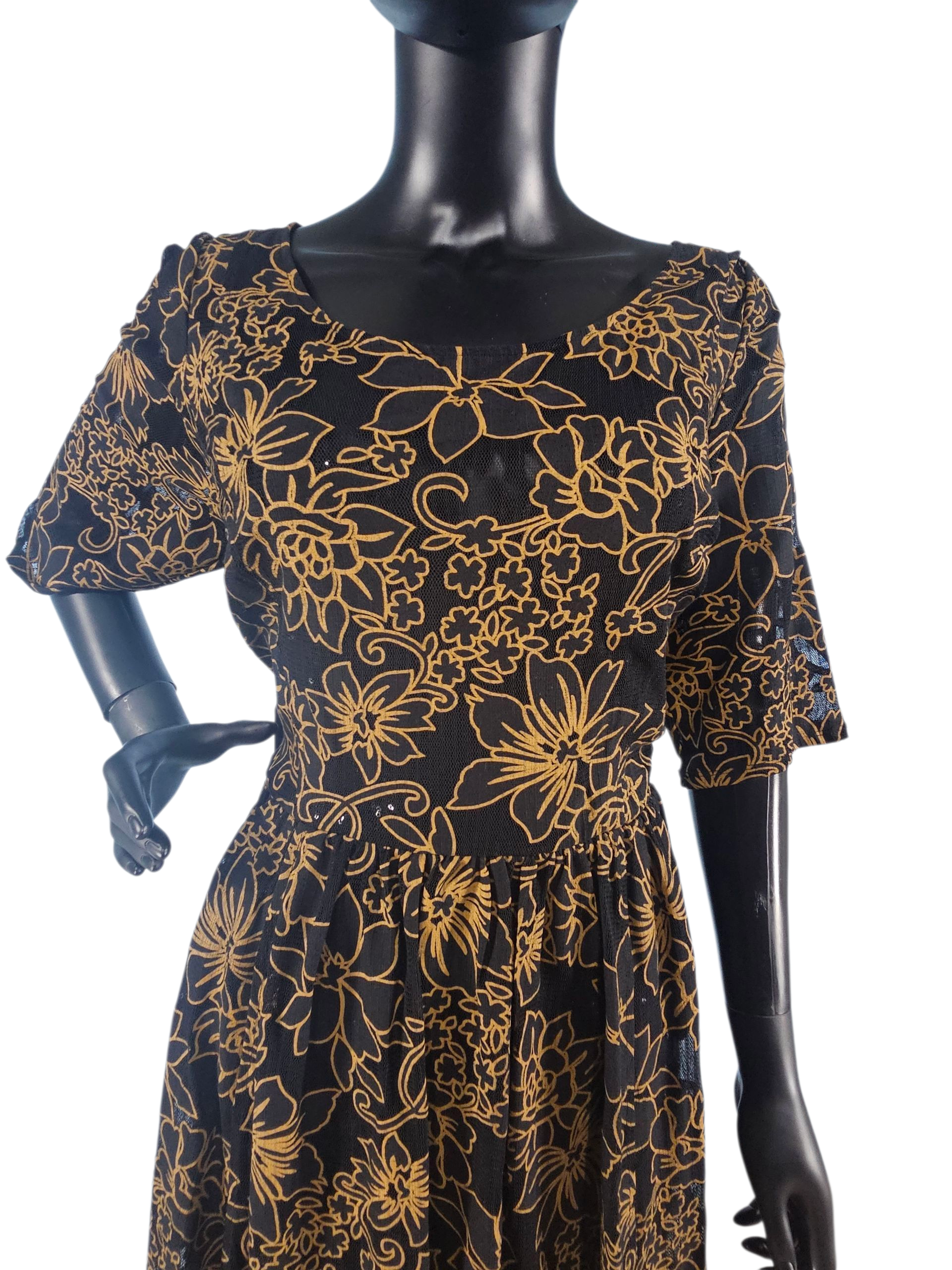This casual dress has a few hidden exciting design elements. The gold floral pattern has an underlay of black sequins which gives this cute little dress a subtle shimmer.