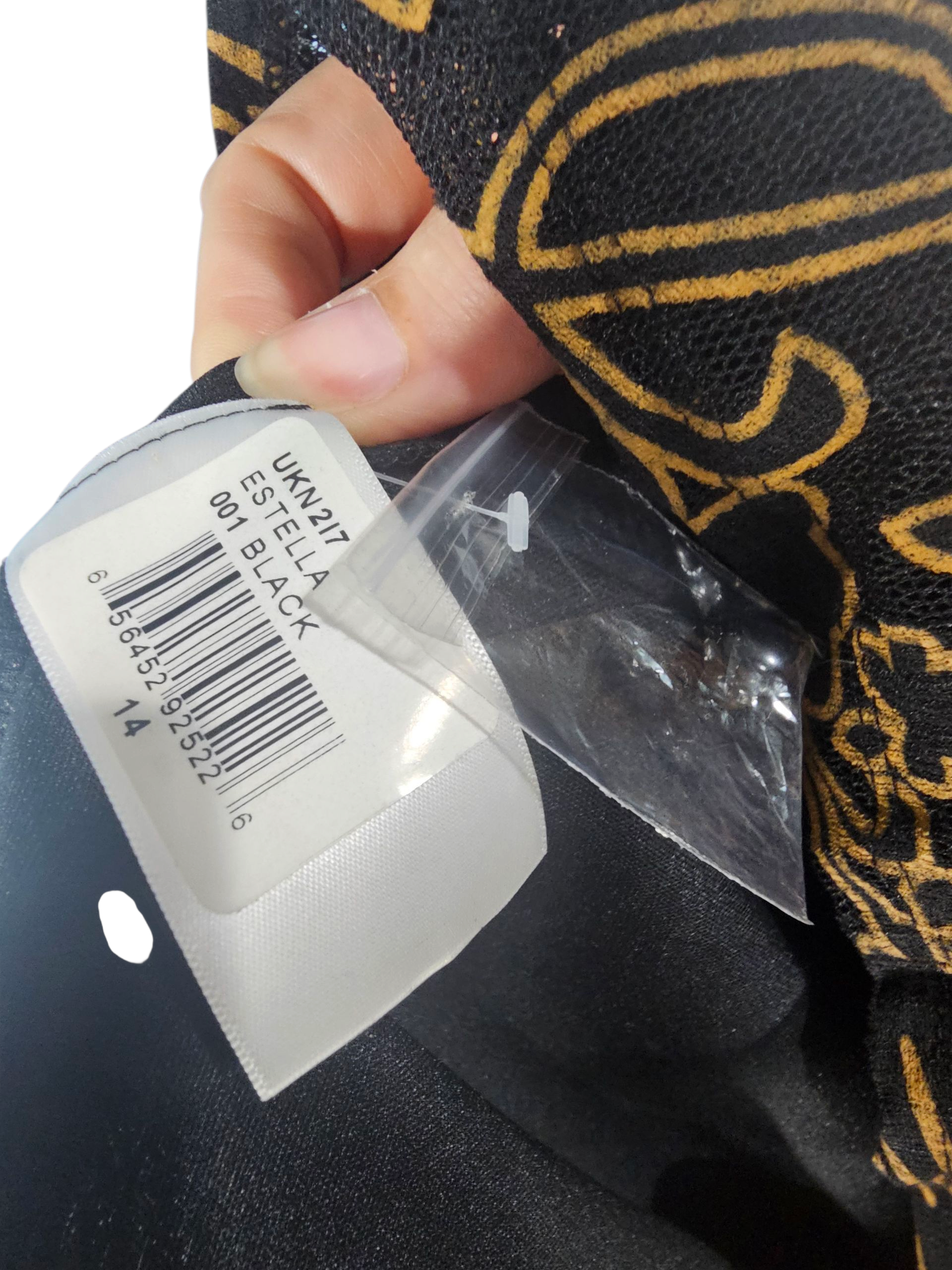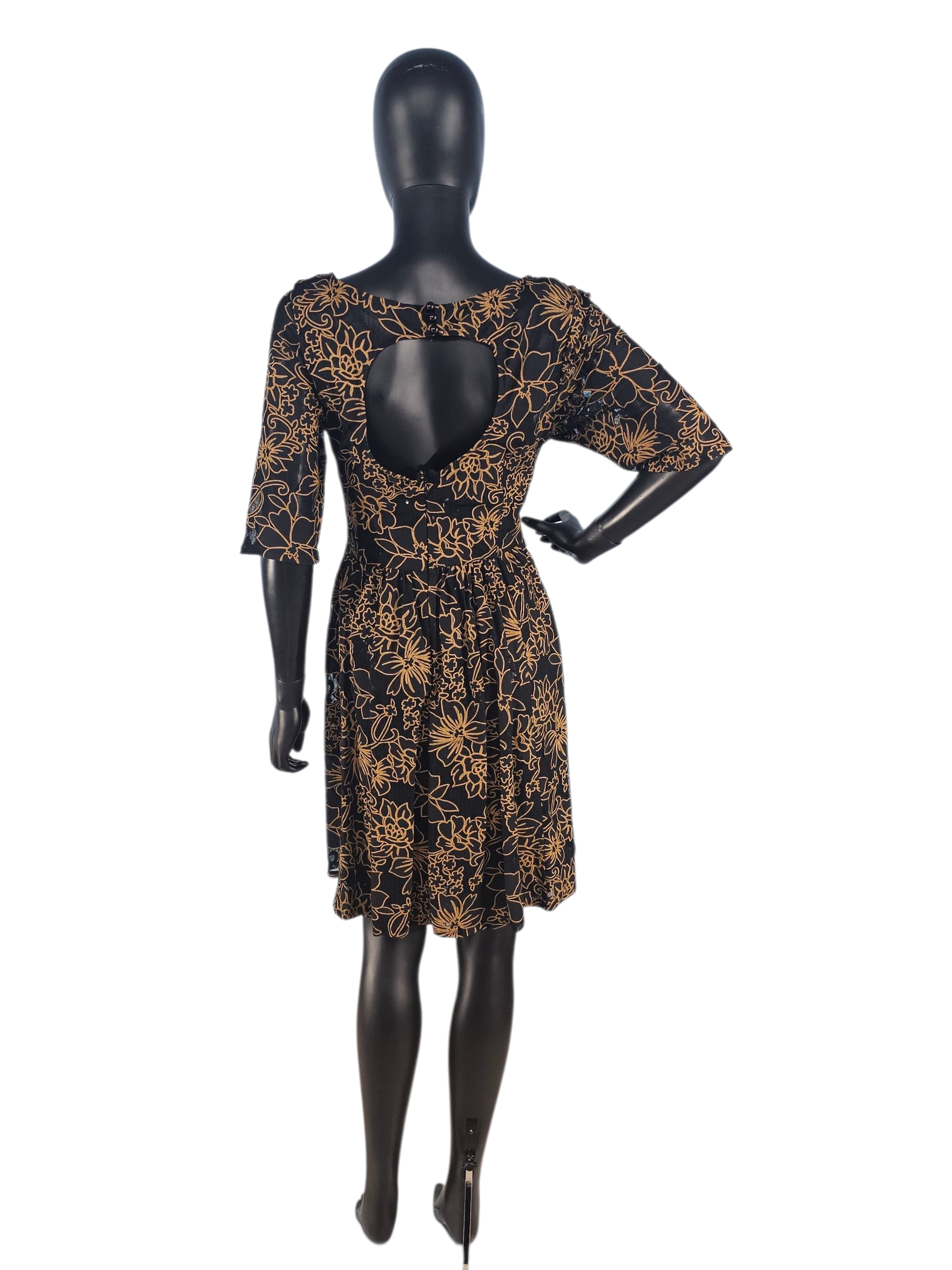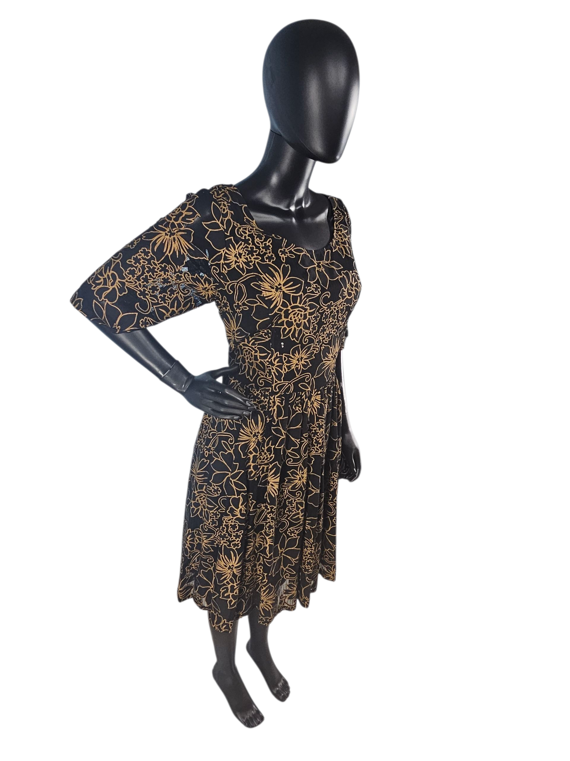 This casual dress has a few hidden exciting design elements. The gold floral pattern has an underlay of black sequins which gives this cute little dress a subtle shimmer.