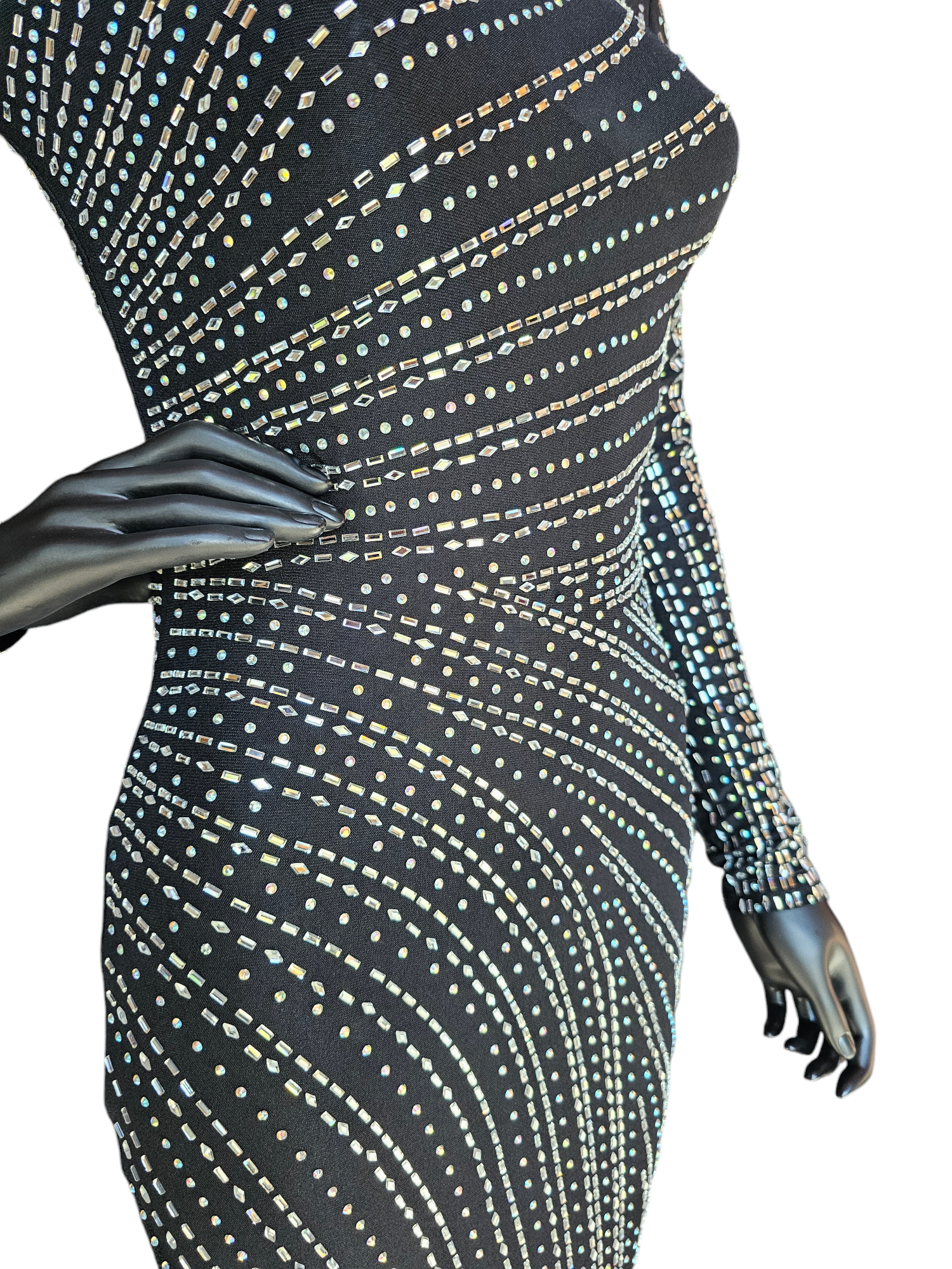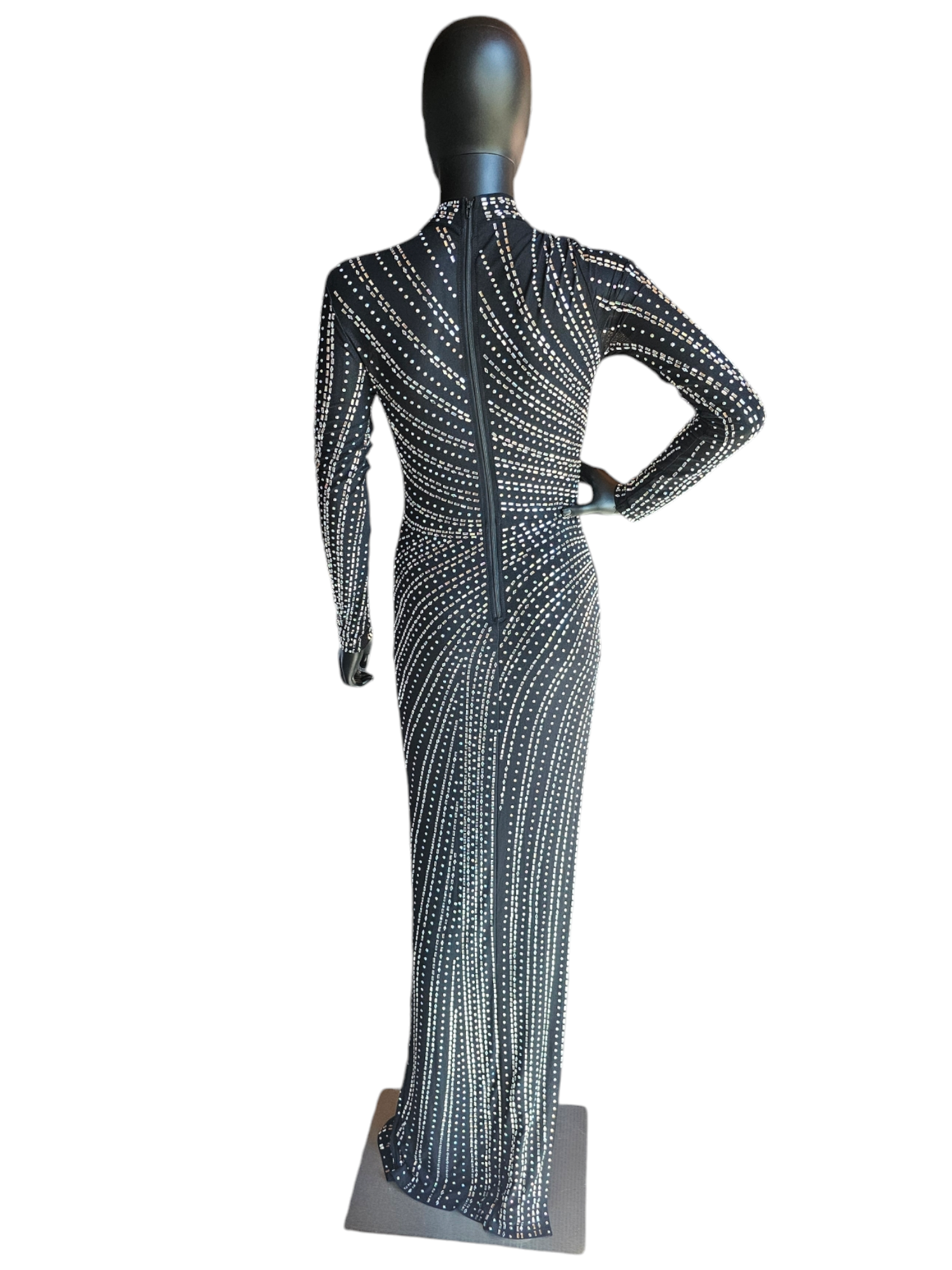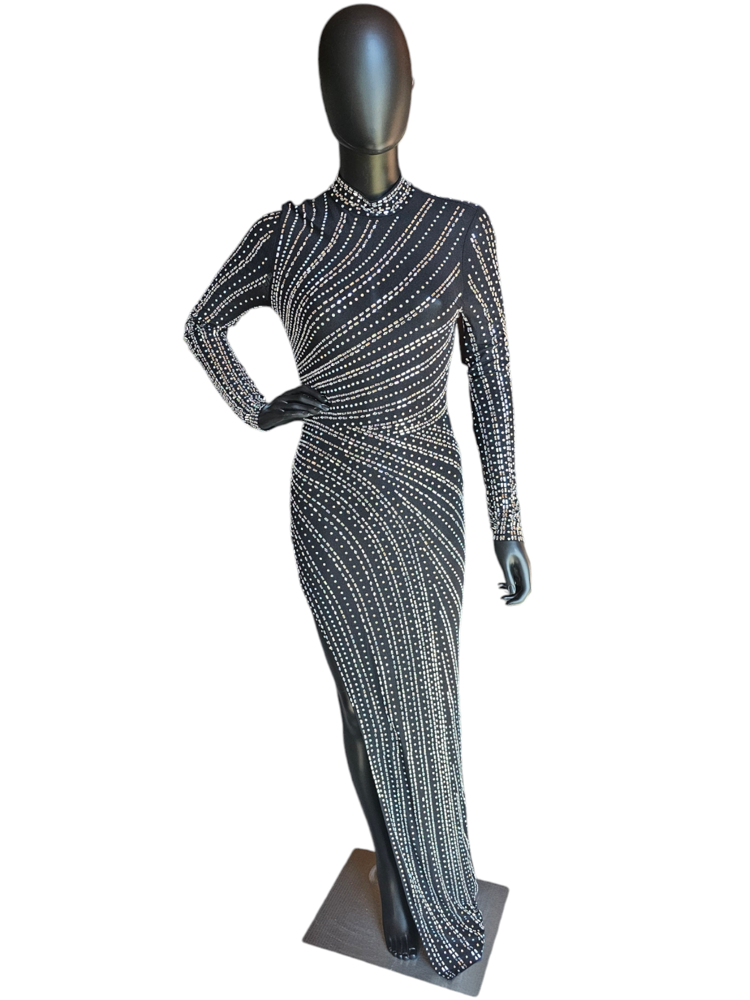 Elevate your formal attire with our Black/Crystal High Collar Long Sleeve gown. Featuring stunning details and a mesmerizing illusion bodice, this dress is crafted from black stretch netting for a figure-flattering fit. Adorned with high-shine silver crystal beads in a linear pattern, with a thigh-high side slit for added allure. Make a statement at any event.Black/Crystal High Collar Long Sleeve Formal