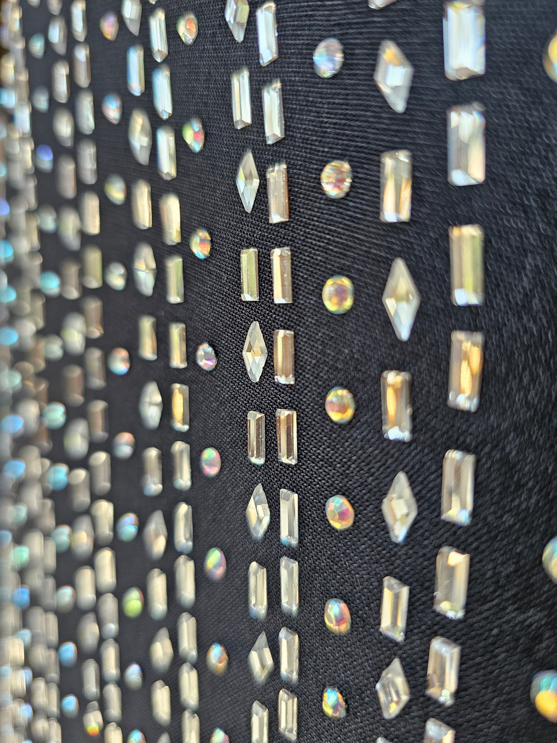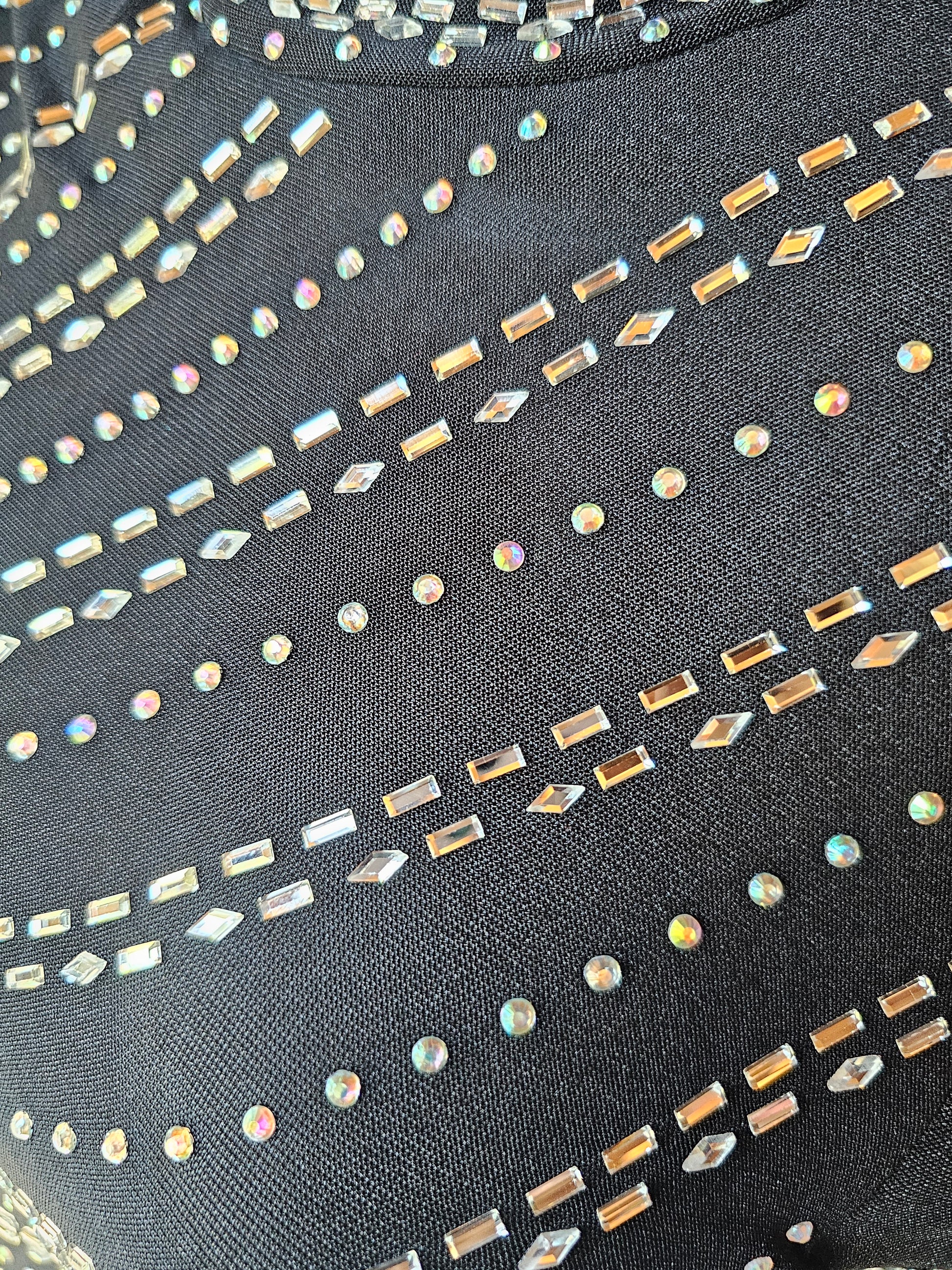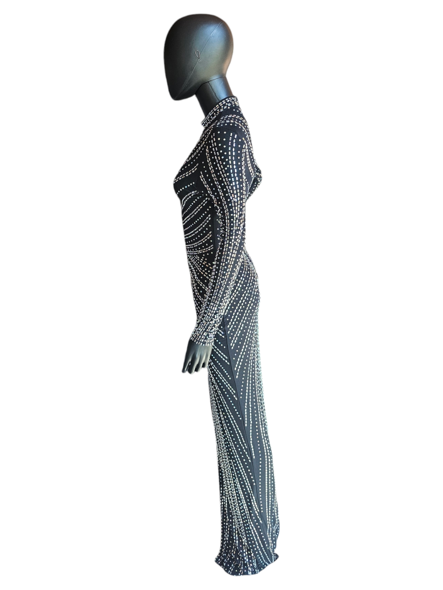 Elevate your formal attire with our Black/Crystal High Collar Long Sleeve gown. Featuring stunning details and a mesmerizing illusion bodice, this dress is crafted from black stretch netting for a figure-flattering fit. Adorned with high-shine silver crystal beads in a linear pattern, with a thigh-high side slit for added allure. Make a statement at any event.Black/Crystal High Collar Long Sleeve Formal