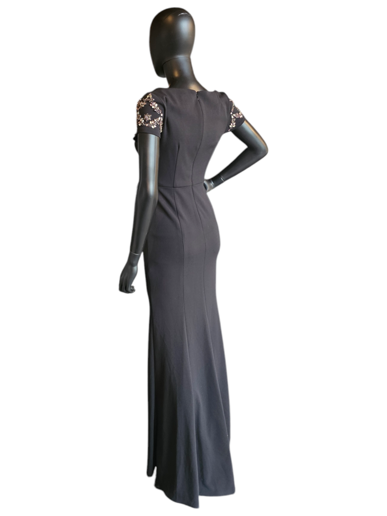 Stretch Crepe Black Fitted Sheath Jewel Cap Sleeve Formal Gown - Adrianna Papell