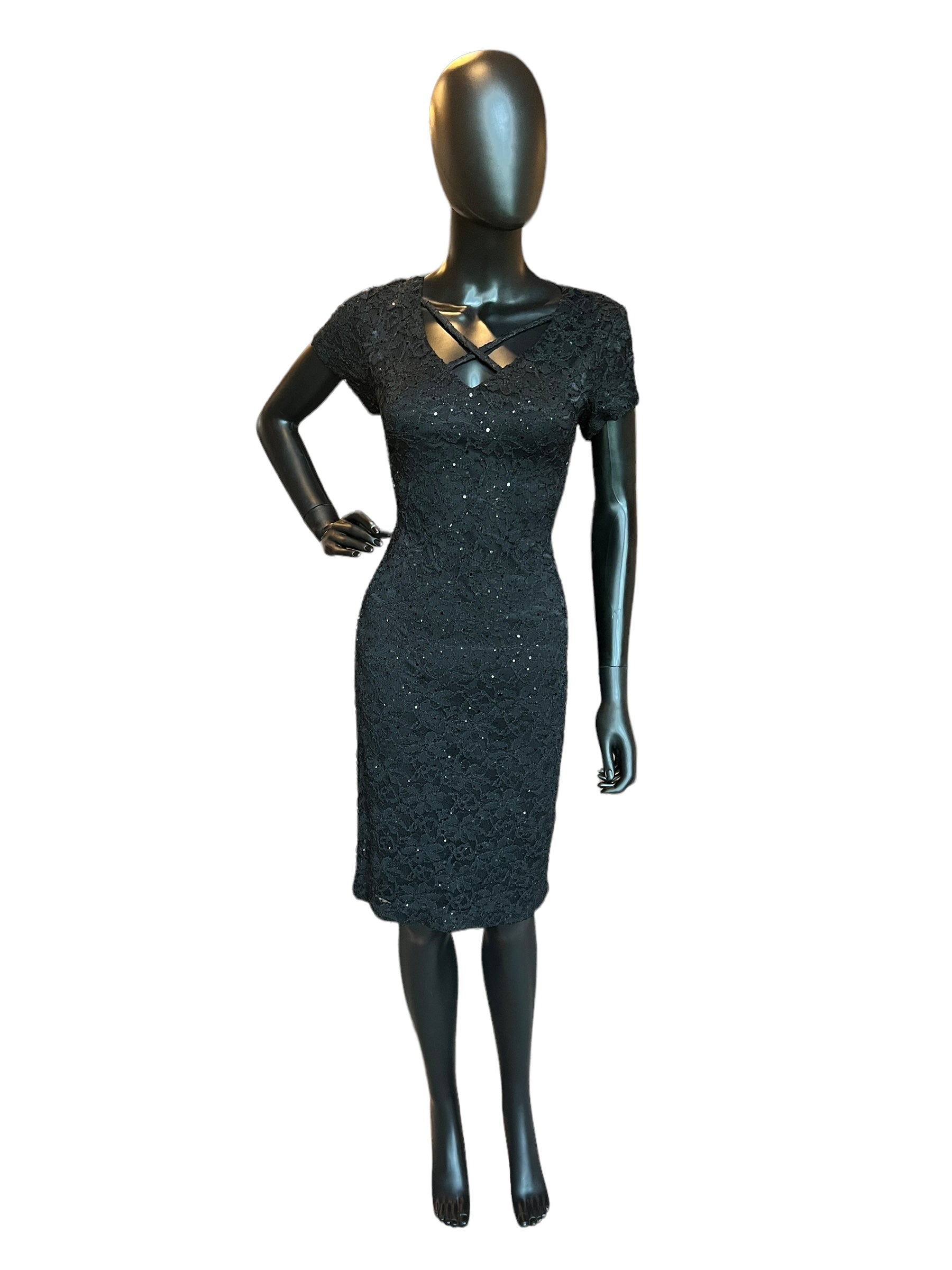 Indulge in the perfect blend of elegance and glamour with our Black Lace Sleeve Sequin Cocktail Dress! The cocktail length and v-neckline with criss-cross detail add a touch of sophistication, while the black lace and sparkle elevate the look. The fitted silhouette and short sleeves ensure a flattering and comfortable fit. Get ready to turn heads at any special occasion!