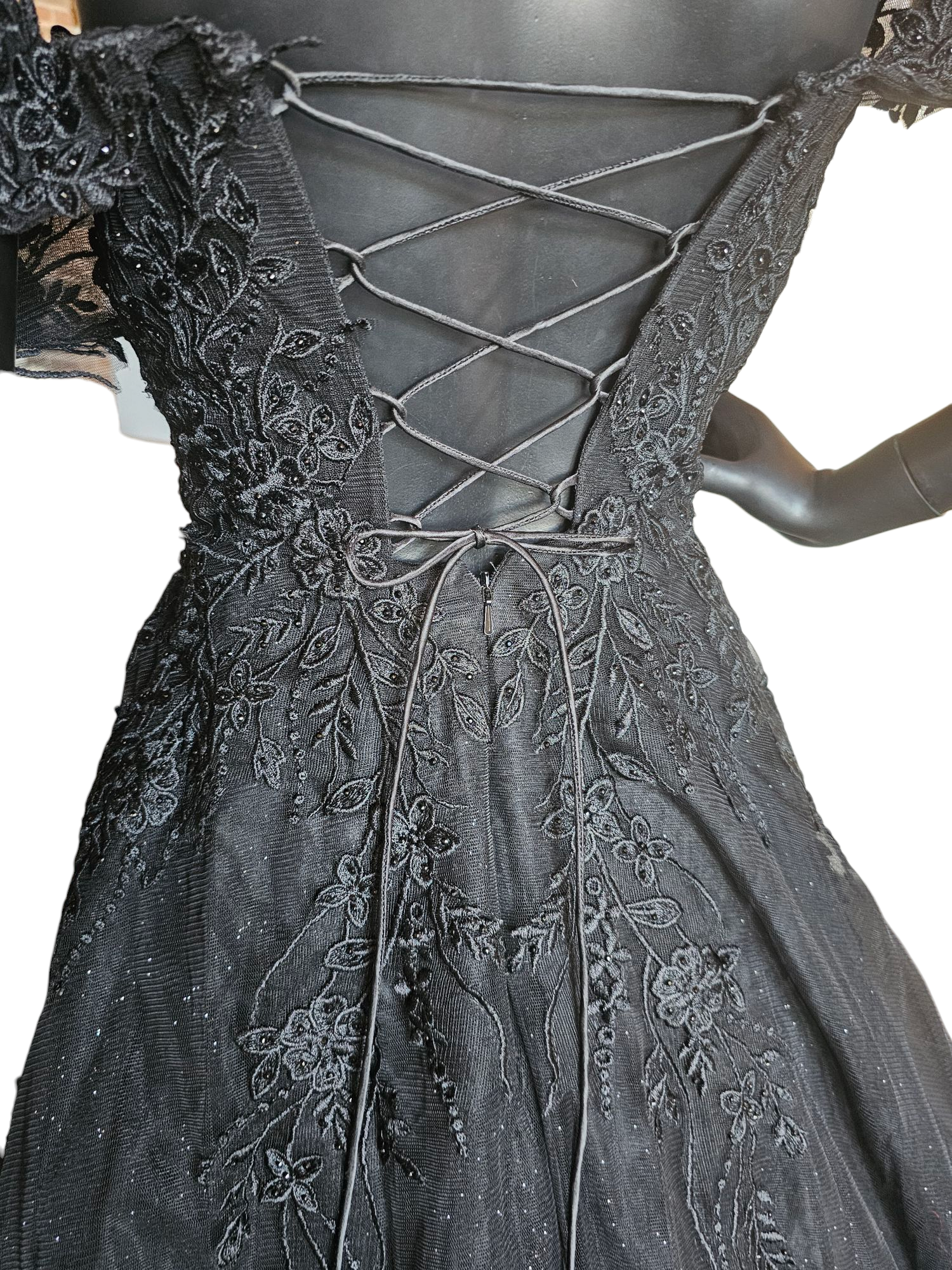 This Nox NWT Black Off Shoulder Sparkle Wedding Gown exudes fabulous gothic glam style. The see-through illusion bodice features an open corset tie back and delicate floral applique details, while the sweetheart neckline and off shoulder straps add a touch of romance. The full a-line skirt adds a hint of sparkle, completing this stunning wedding gown.
