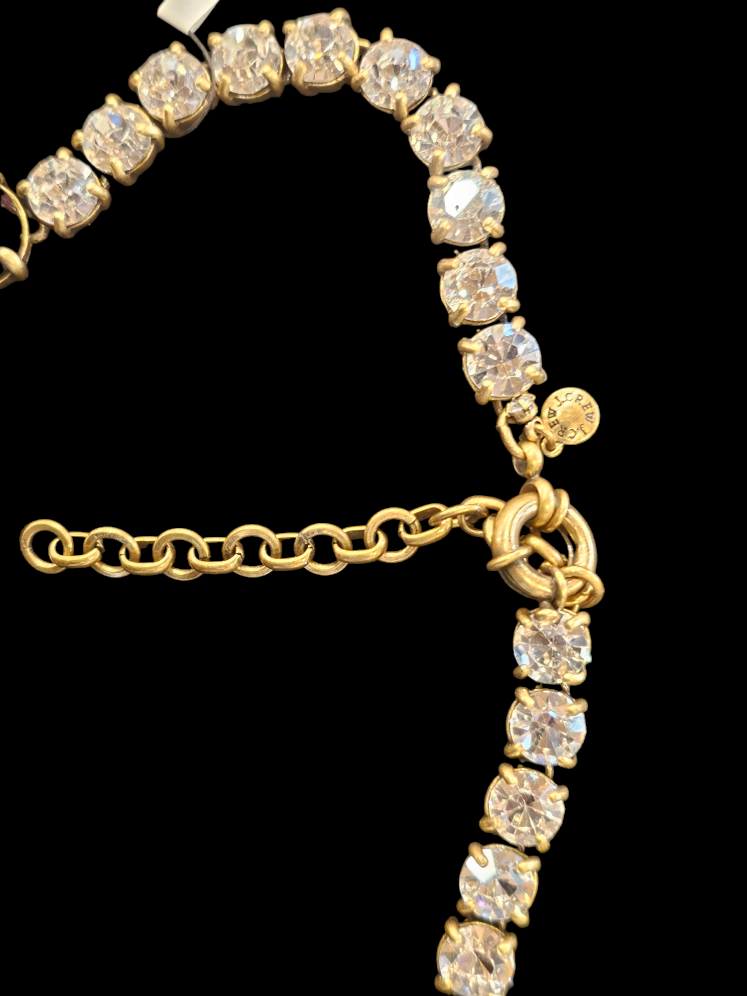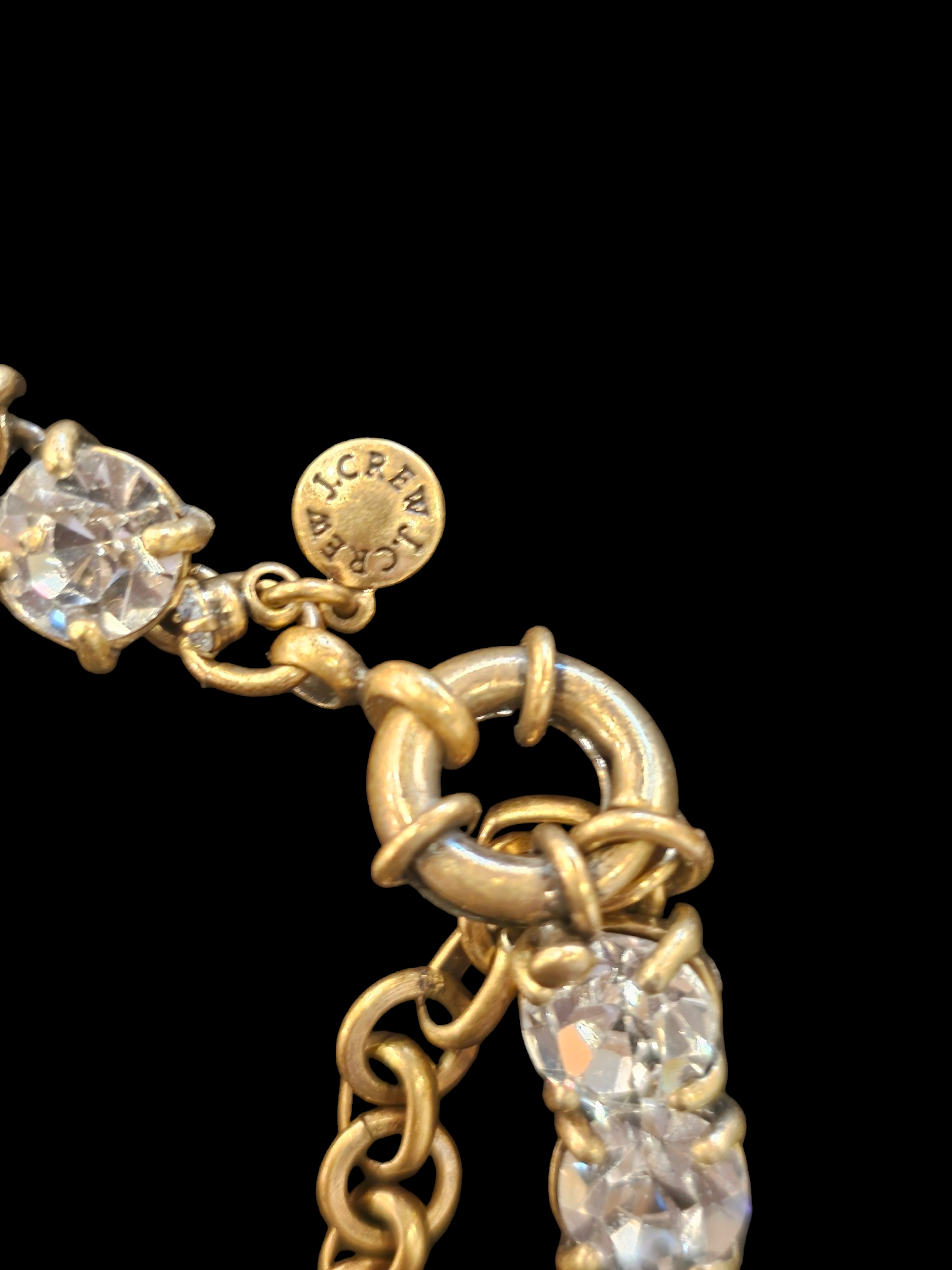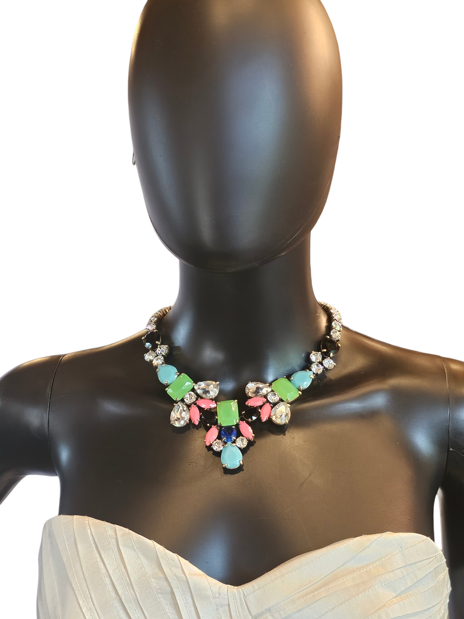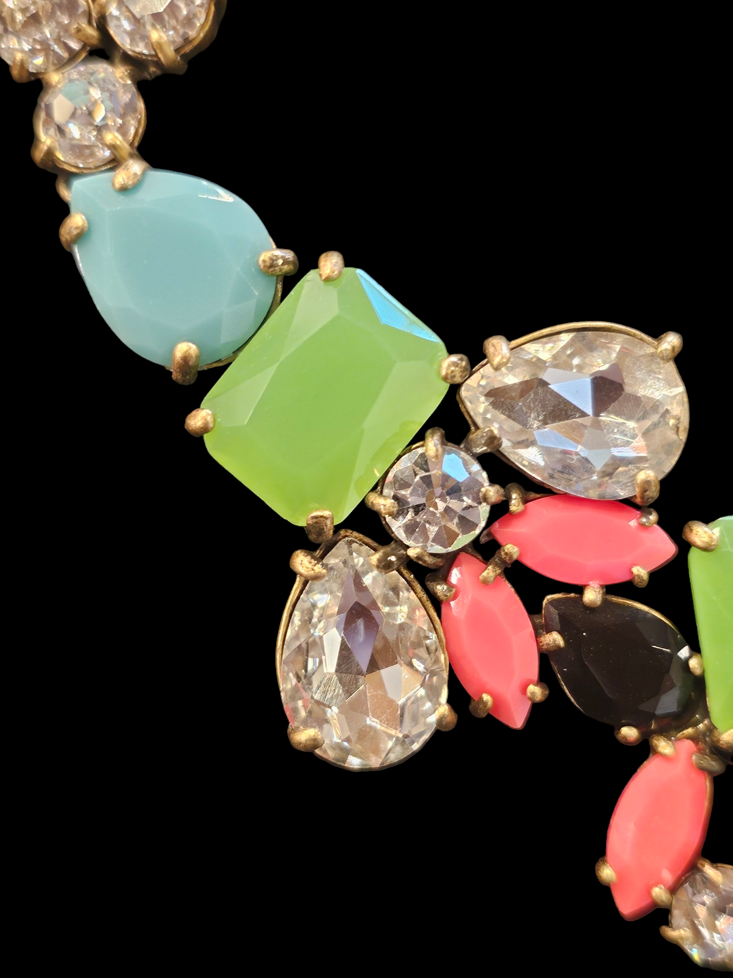 Gold casing, large clear crystals with black, turquois, lime green and pink accent crystals.