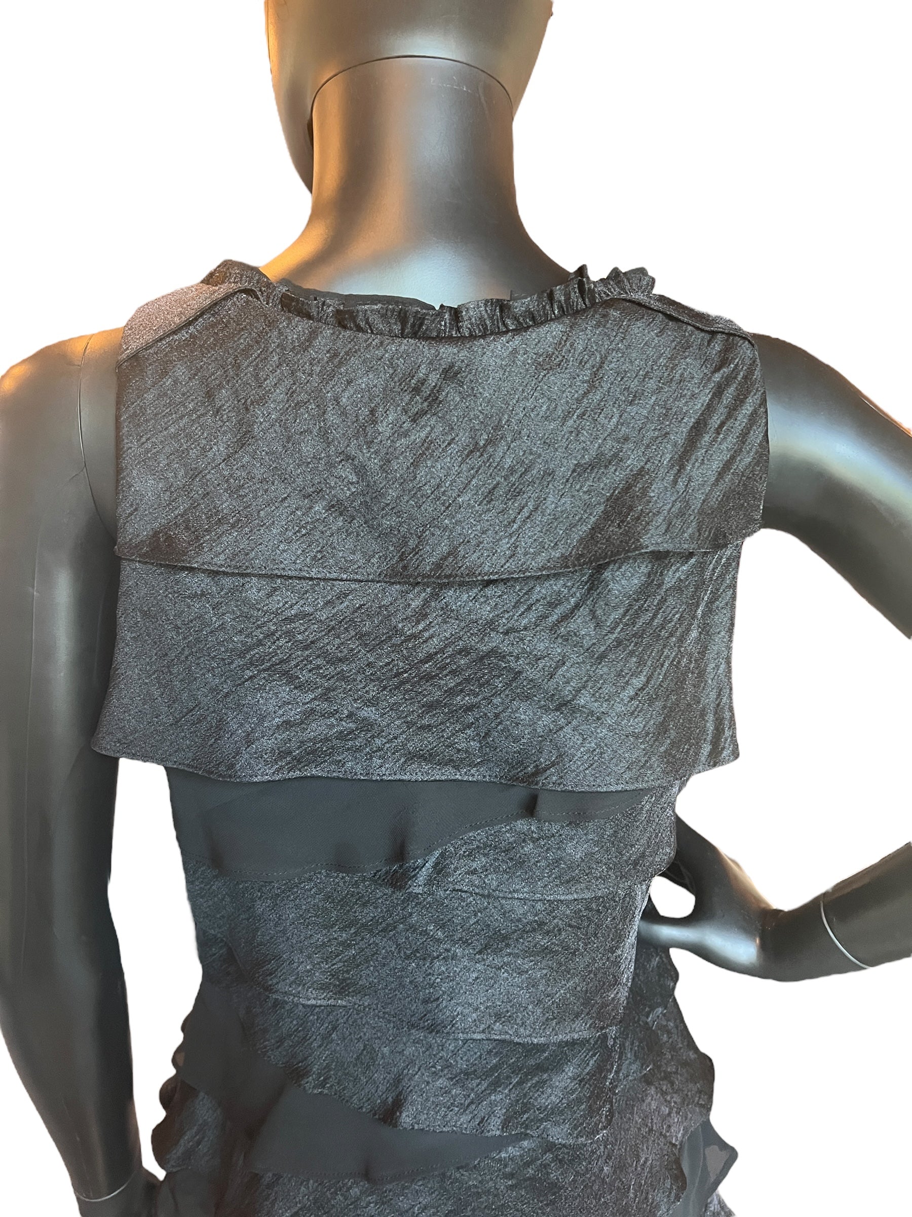 This beautiful black cocktail dress is perfect for everyday looks or a special occasion. The ruffled sleek fabric flutters in the wind and catches the light. Meanwhile the beaded collar is elegant and bright for a more formal look.