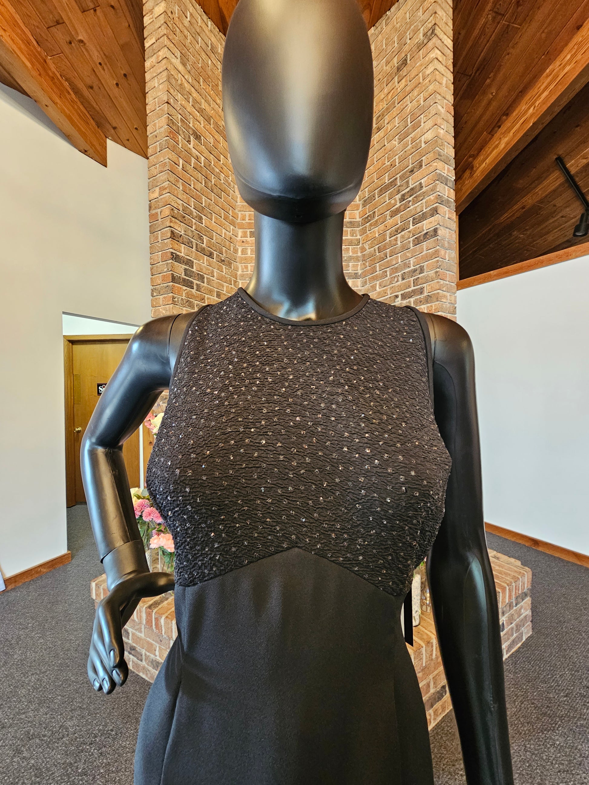 This stunning floor-length gown is perfect for any occasion. The slight sparkle in the bust gives this dress a unique flair while the skirt flows effortlessly. This gown is perfect for any formal event or an evening out.