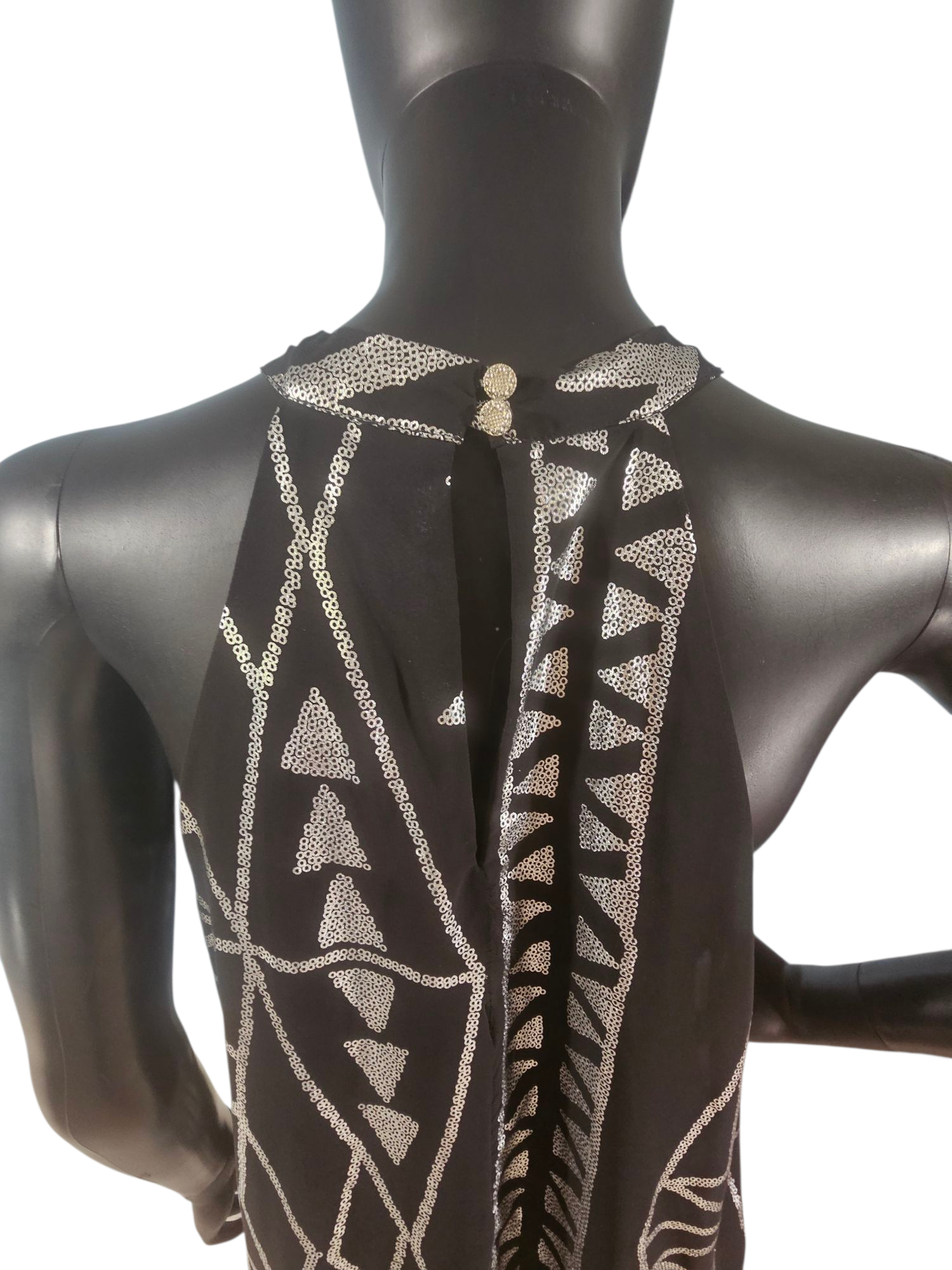 This Black/Silver Abstract Halter is perfect for a night out with its unique silver abstract print and flowing chiffon fabric. Its racer halter style and button closure add a touch of elegance. Short length provides comfort without sacrificing style.