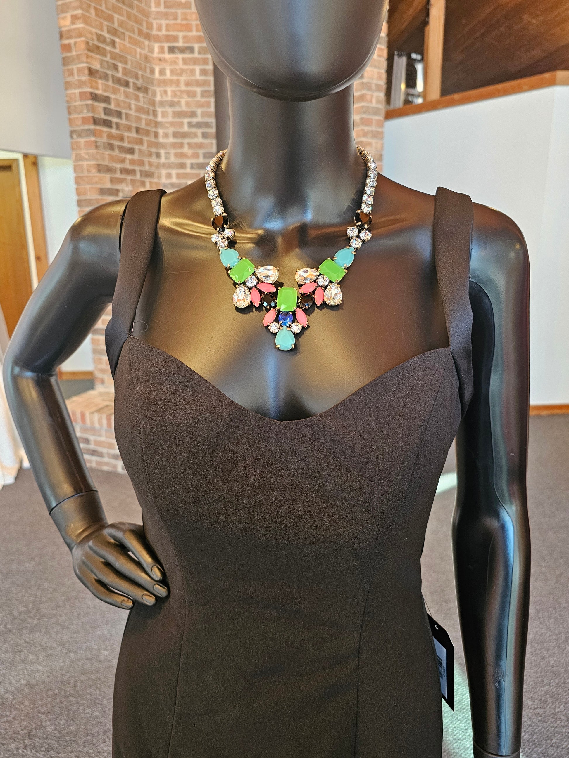 This Black Tux Stripe Mori Lee dress is perfect to accentuate a bright piece of jewelry or as a simple, glamorous outfit. The calm black tone creates a thinning effect and creates an air of luxury. The open back allows for a sexy, sleek look while the wide straps offer support and comfort for an entire night out. This dress is a beautiful addition to any wardrobe as a functional and versatile piece.