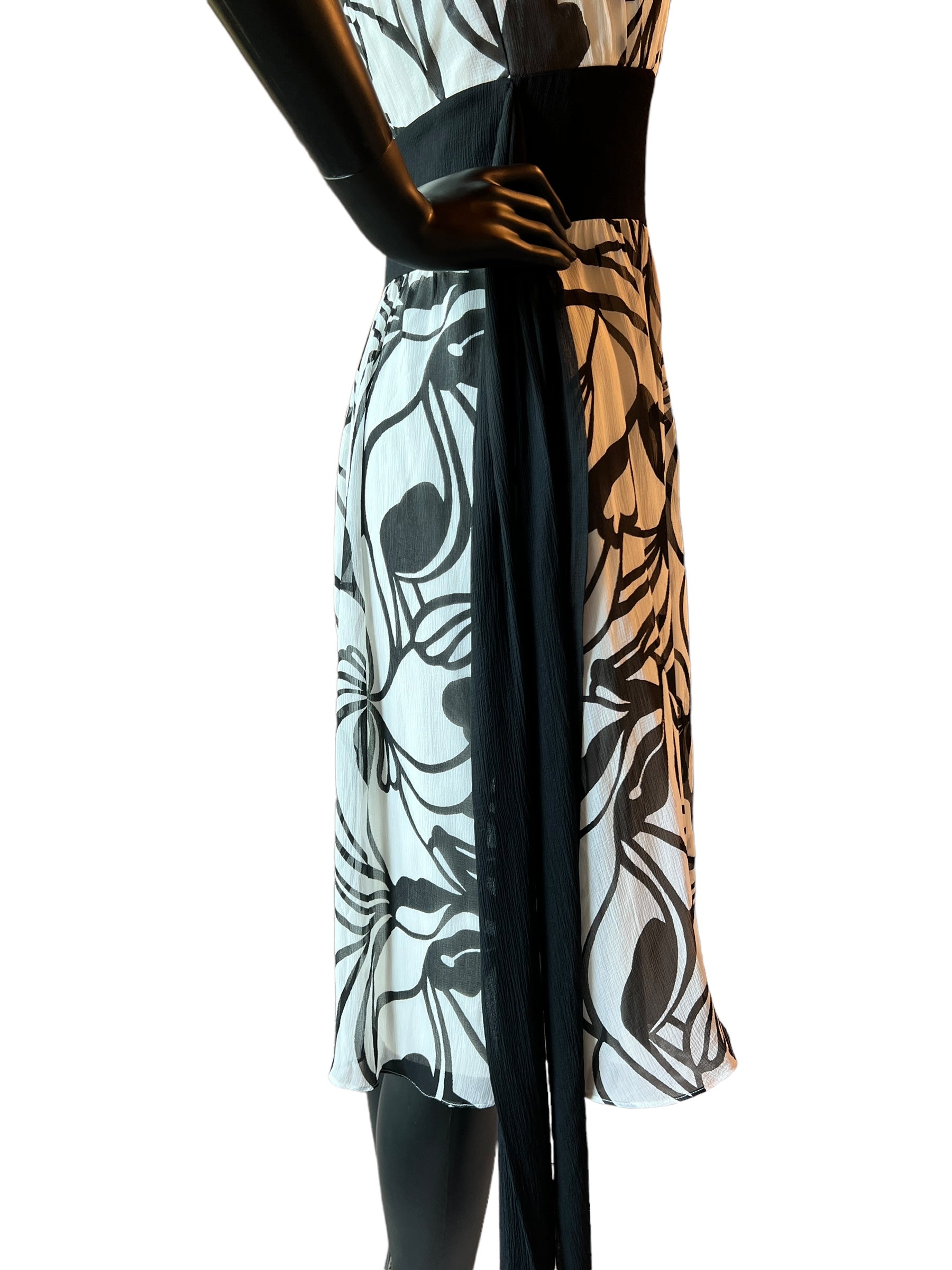 This beautiful and traditional gown is comfortable and stylish. The black and white pattern draws in floral designs while the wrap belt draws the eye in and accentuates the waist. Make a statement at prom or a summer party!