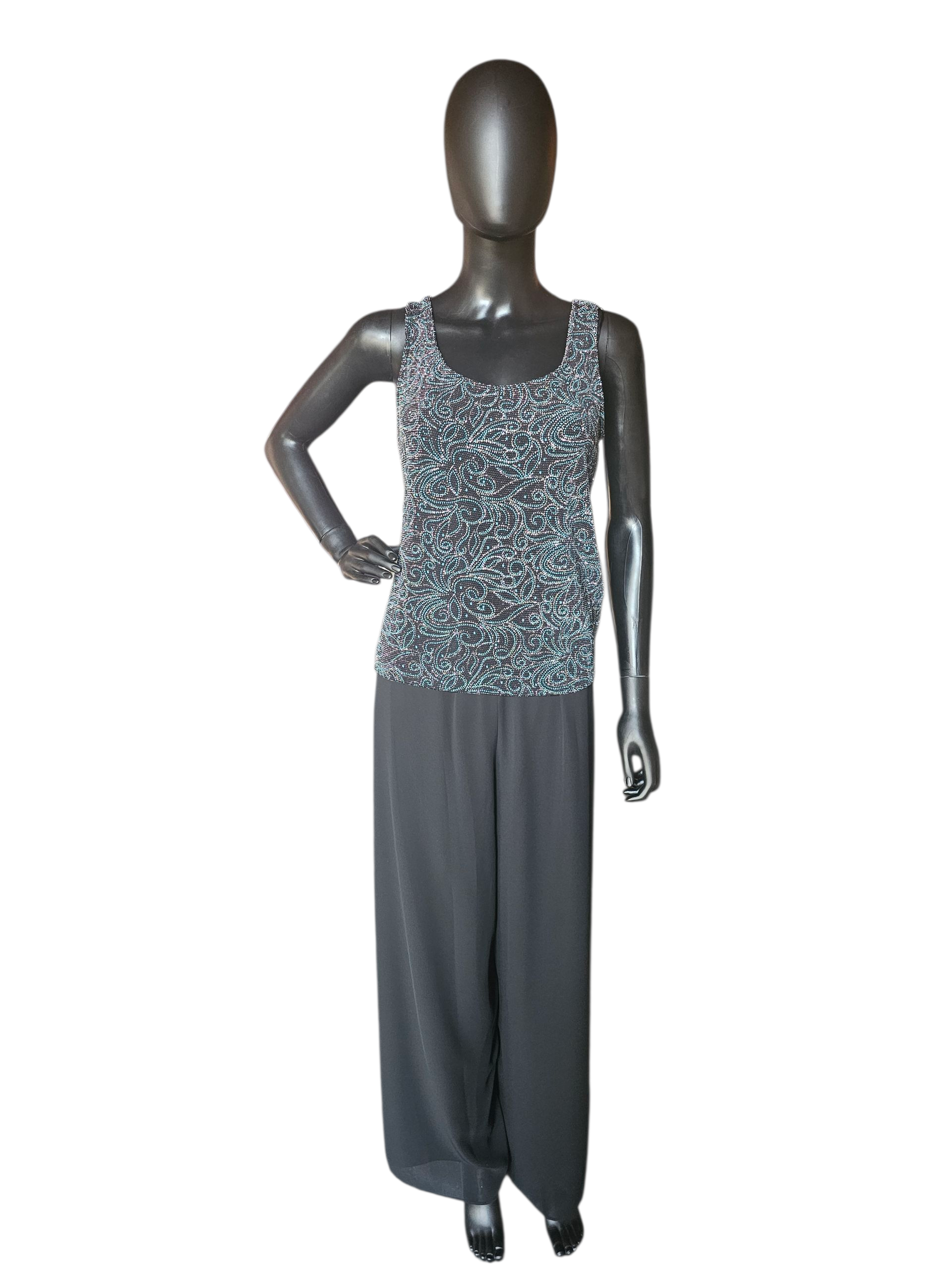 Flowy chiffon wide leg pant, sleeveless scoop top tank camisole, 3/4 sleeve jewel neck open jacket.