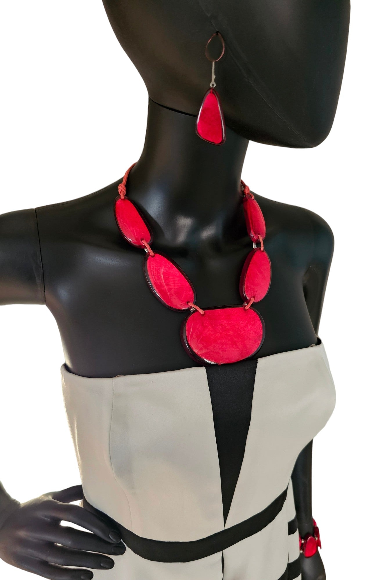 This black and white geometric dress is fun and spunky. The stripes and cutouts with black fabric sewn in catches the eye. Meanwhile the strapless design is modern and sexy. This dress offers a great way to introduce a bright piece of jewelry or colorful pumps.