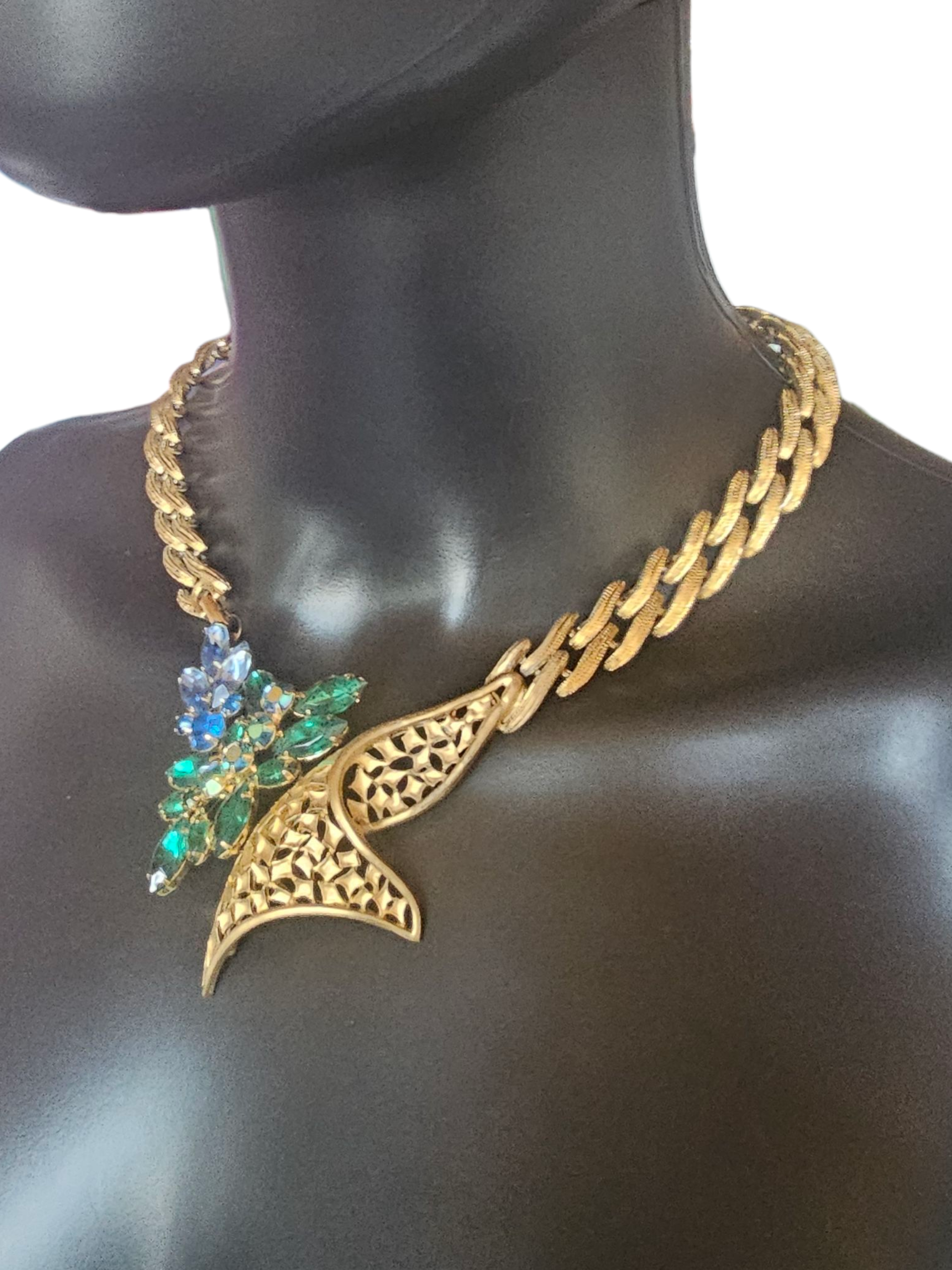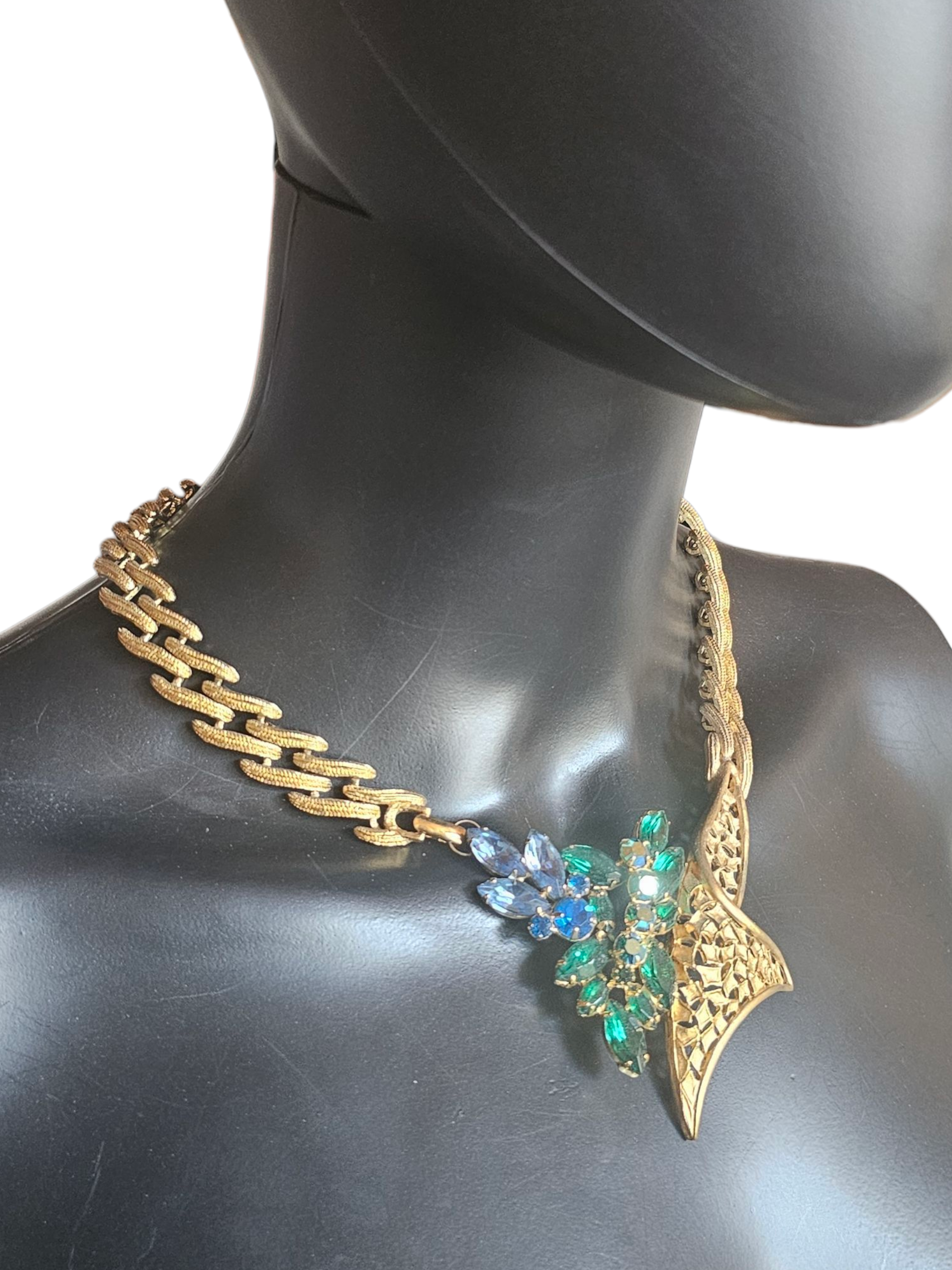 Vintage Bespoke/Remade Gold/Blue/Green Crystal Collar Necklace