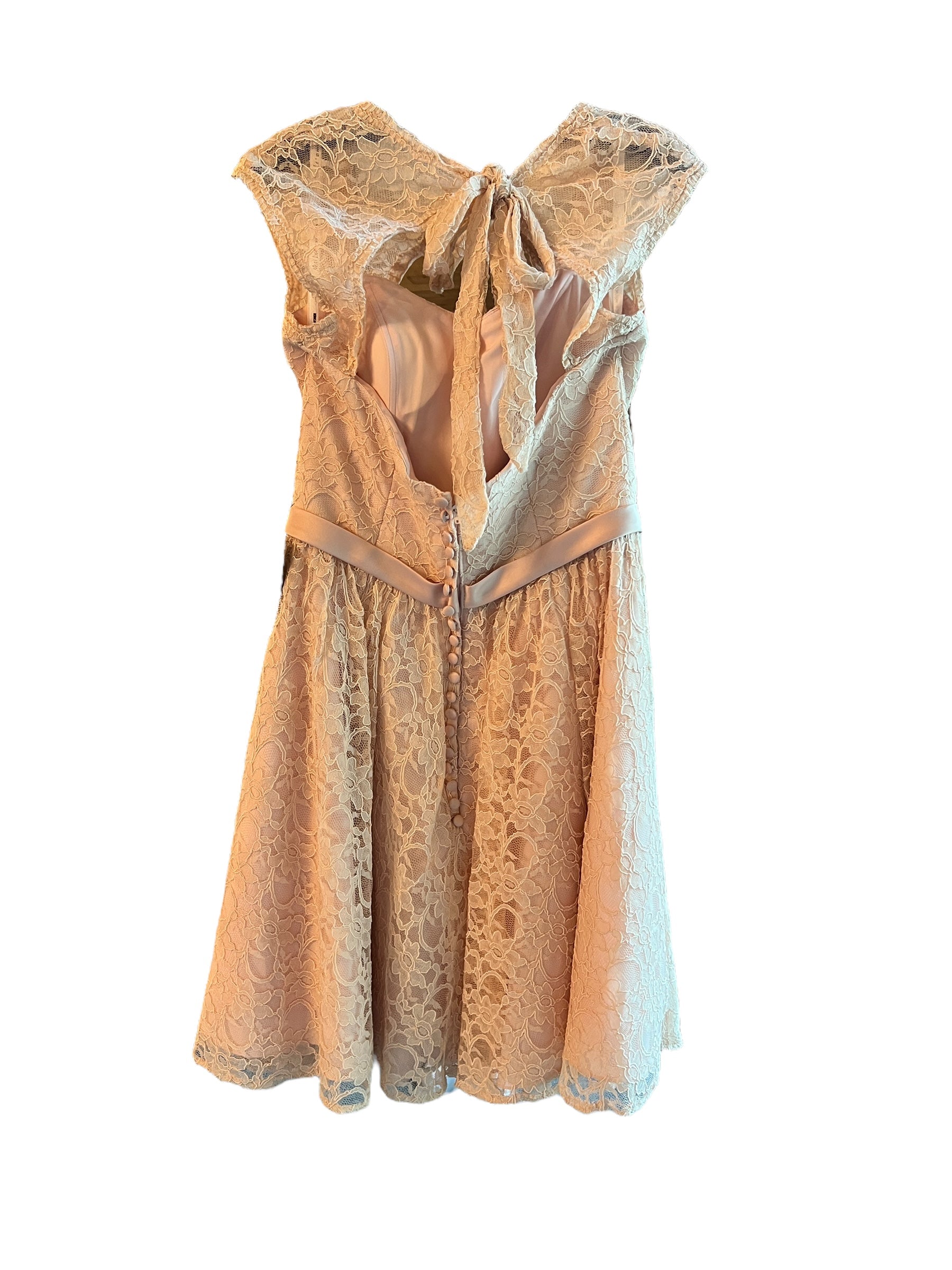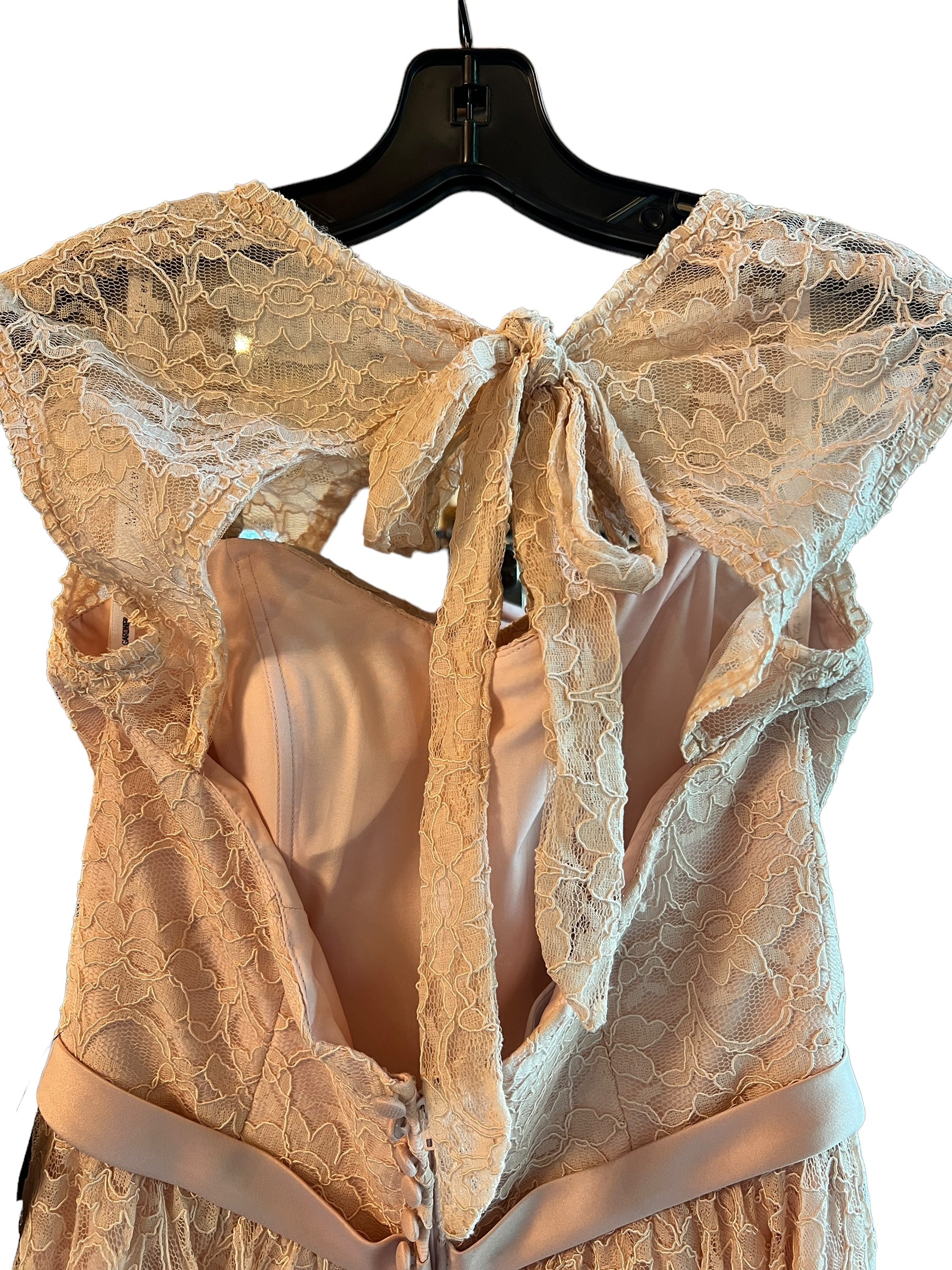 This blush dress is the perfect spring or summer outfit for any occasion. Whether it's a garden party or school dance, this dress fits the part! Intricate lace covers the entirety of the dress all the way to the capped sleeves. A simple belt crosses the midsection to create natural curves.
