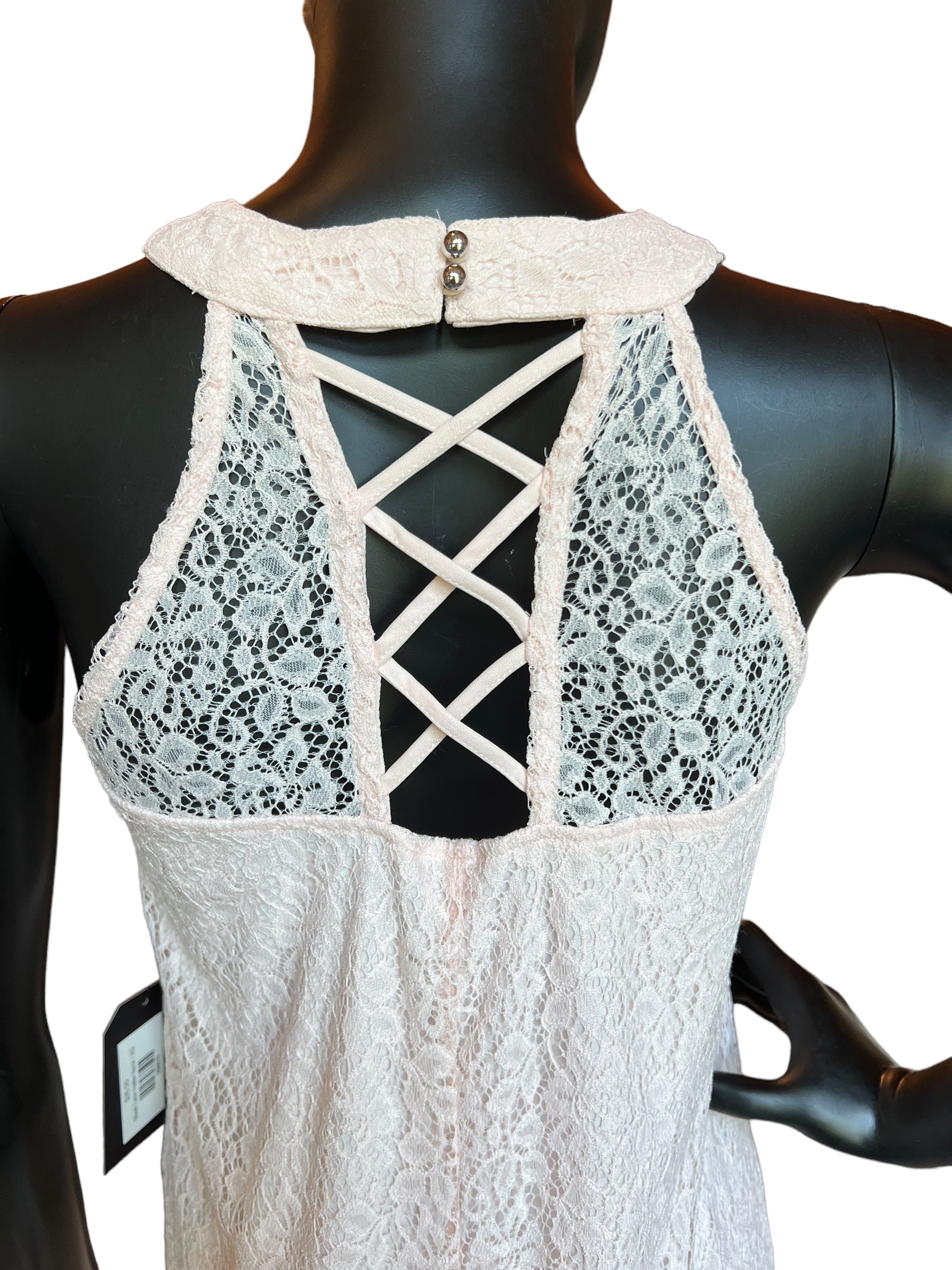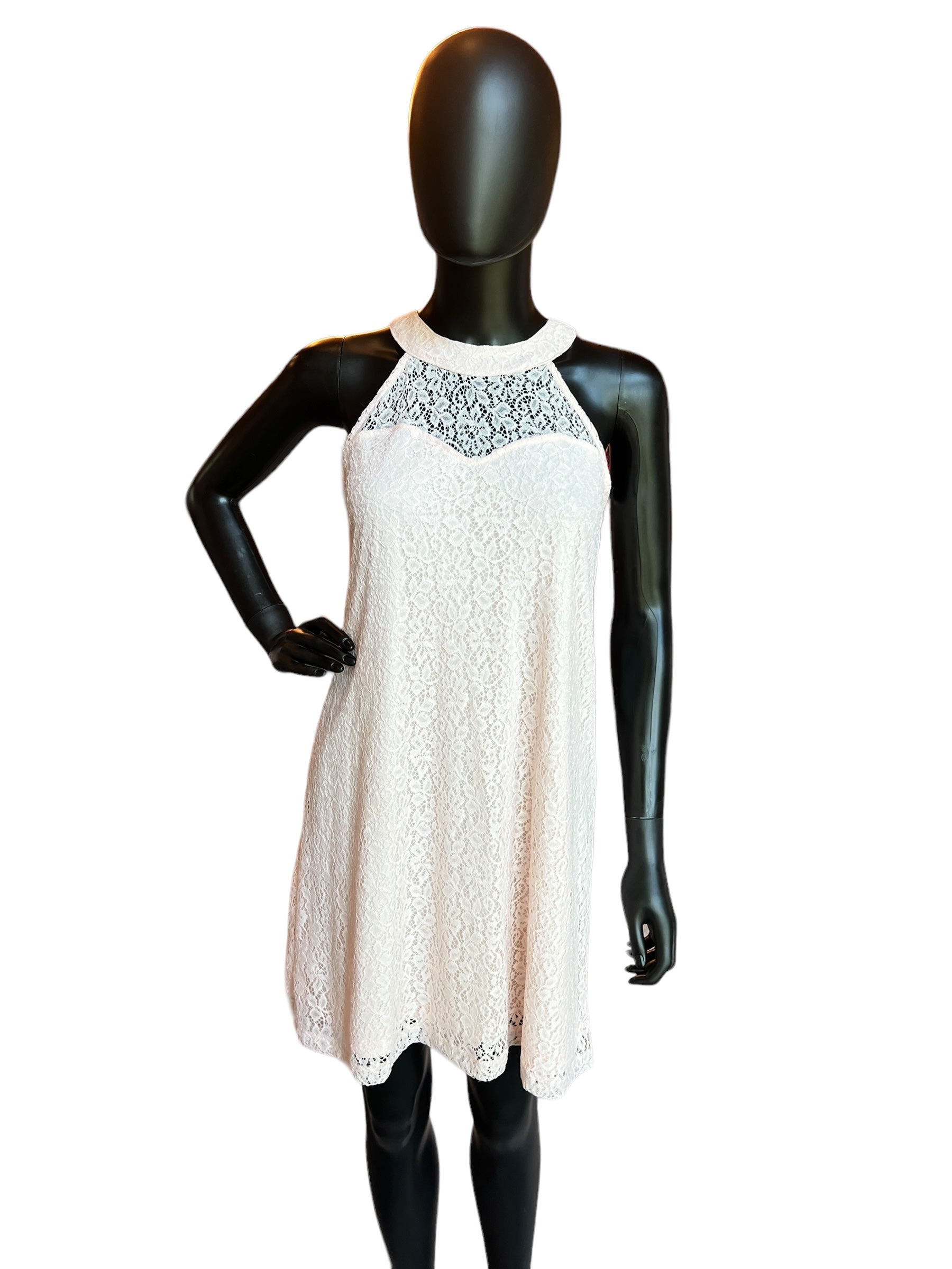 This blush dress is airy and stunning. The illusion halter neckline is timeless and comfortable. The lace overlay elevates your look and makes this gown perfect for prom or another formal event.