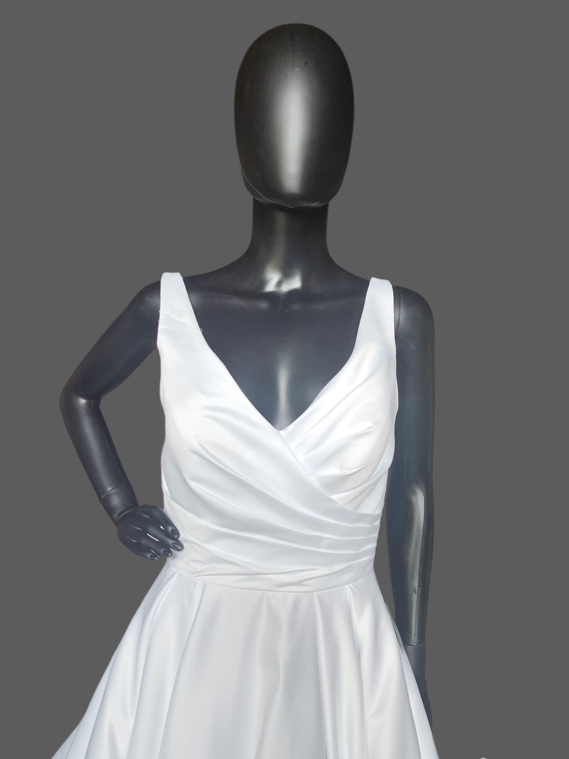 The Da Vinci White Satin V-Neck Wedding Gown boasts a sleek and minimalist design, featuring wide straps, a flattering v-neckline, and a stunning plunge open back. The pleated full a-line skirt adds volume and movement, while pockets and side ruching at the waist provide both practicality and a flattering silhouette. Complete with a cathedral train, this gown is the epitome of timeless elegance.