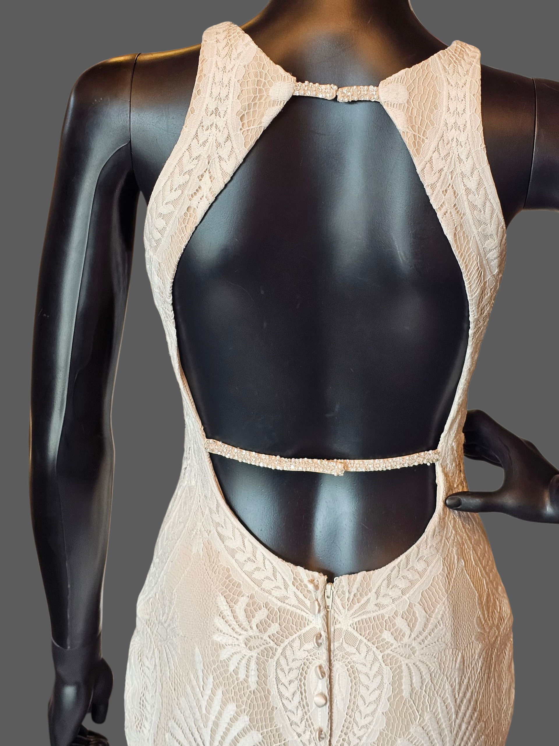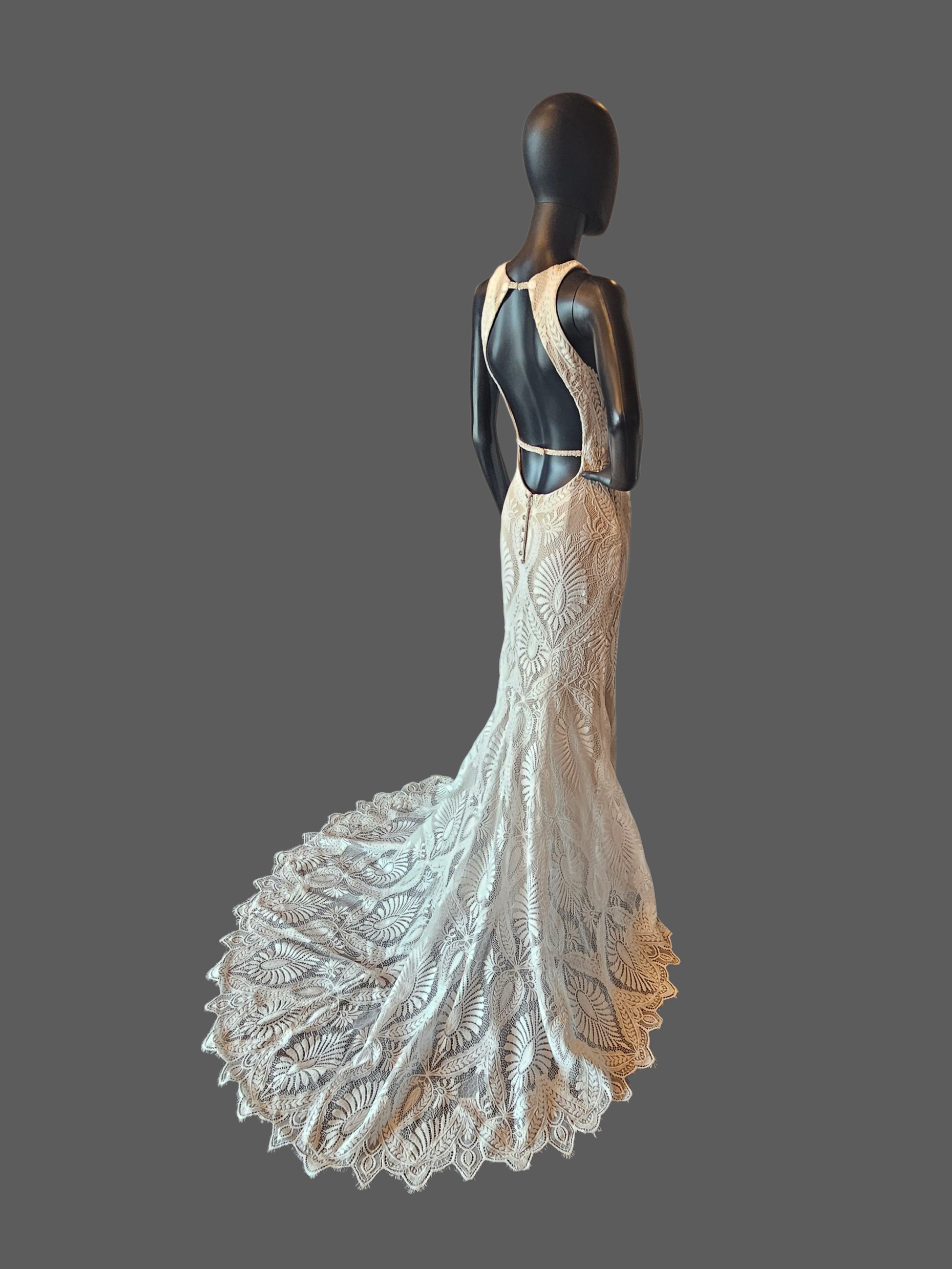 Boho Open Weave Lace Racer Halter Open Back Fitted Wedding Gown - Wilderly Bride