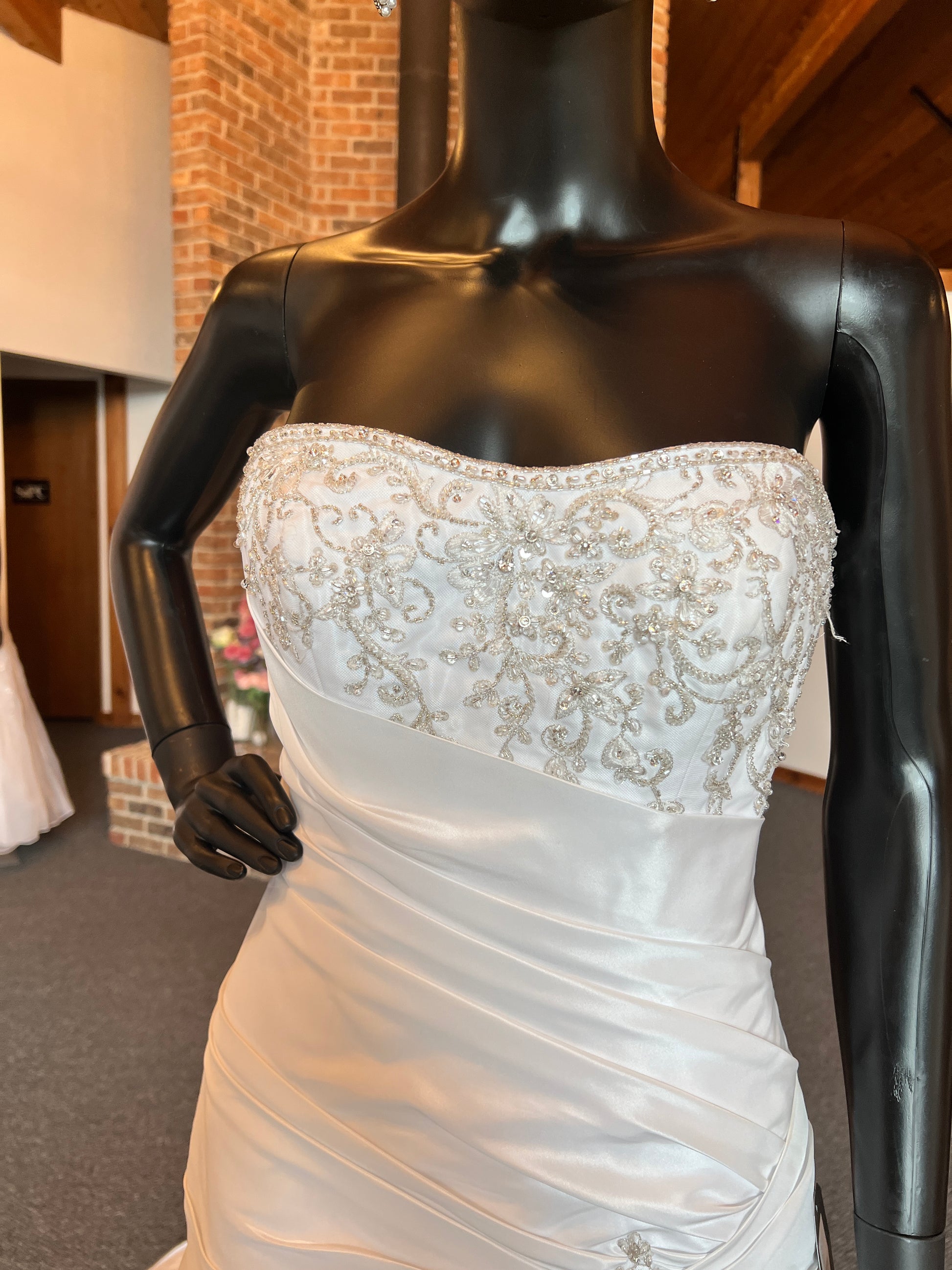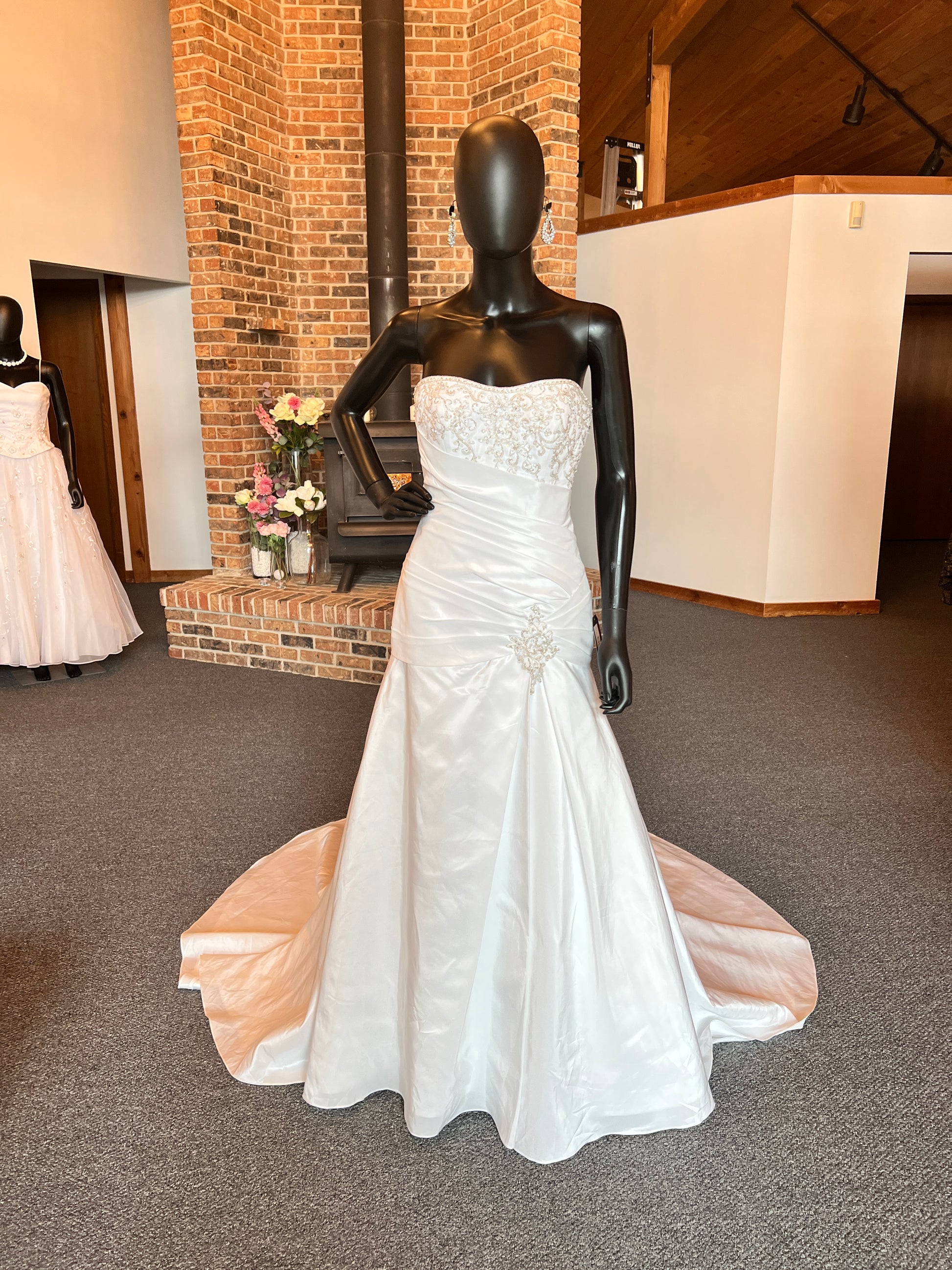 This gown is part of our store sample collection. It has never been worn for a wedding or altered in any way. Many will still have the original store tags on them. They may show some slight sights of wear from being tried on in the store. All prices reflect the condition of the gown.