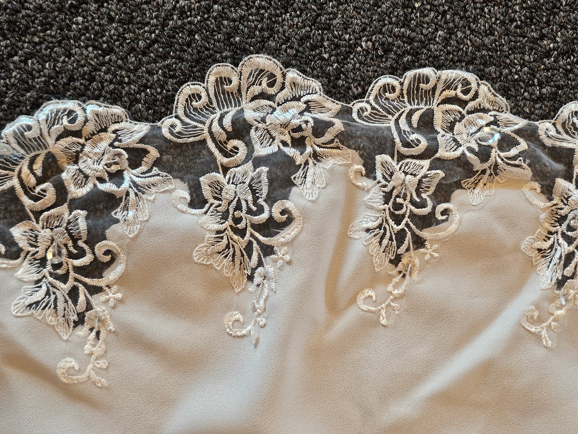 This lovely vintage wedding gown features a sleek ivory crepe and lace applique. The illusion neckline highlights the sweetheart shape beneath in the front and the deep v in the back. The short sleeves are lacy and delicate. The a-line skirt has a chapel length train and is edged entirely with scalloped lace.