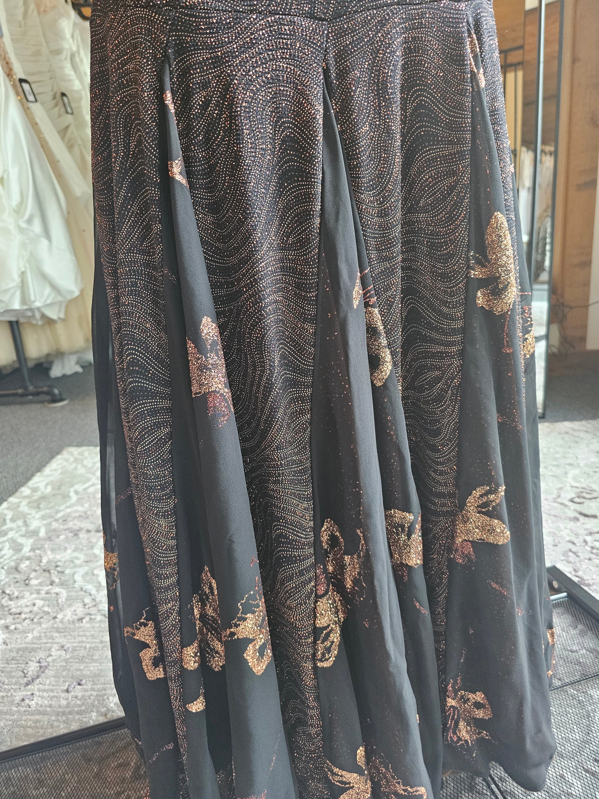 This dark brown gown is perfect for a subtle yet timeless outfit. The halter neck is supportive while leaving the back open for a sexy design. The skirt is what makes this dress unique! The gold detailing is stunning and vintage-looking for a gorgeous look overall.