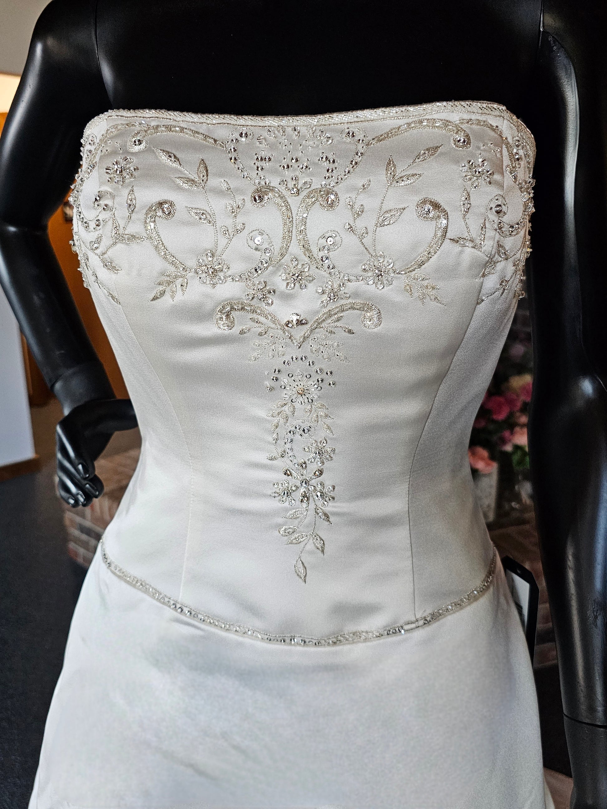 This lovely classic Casablanca wedding gown features a soft buttery satin, strapless bodice with a fitted dropped waistline. The bust, waist and hemline have lovely gold embroidered and beaded details that make this gown special.