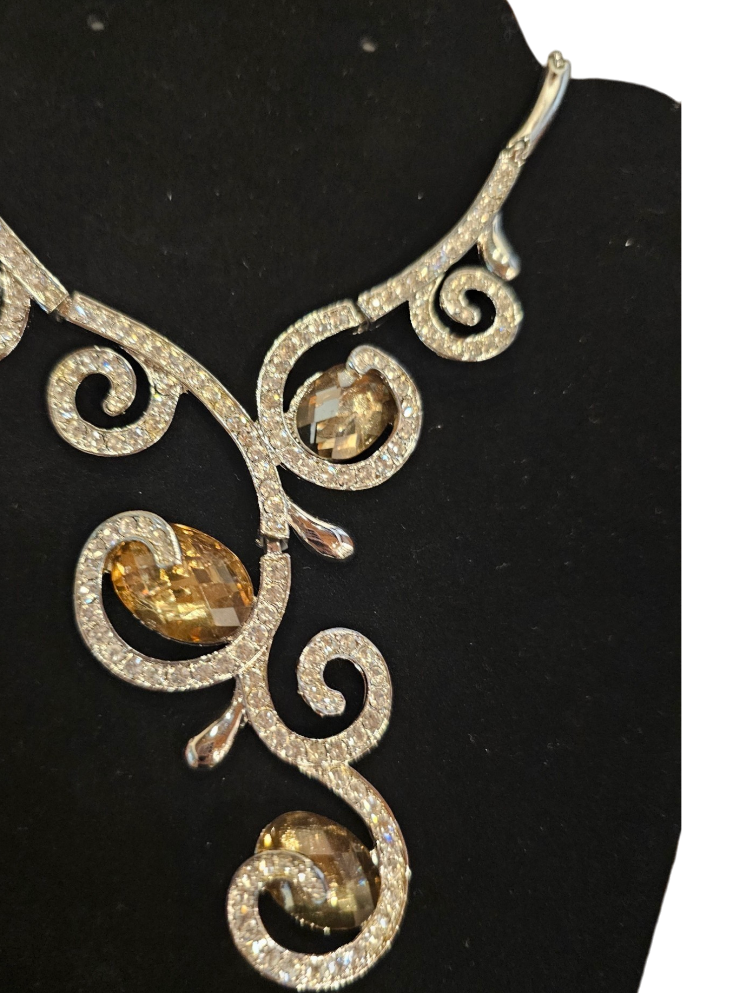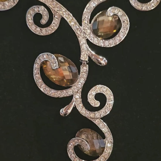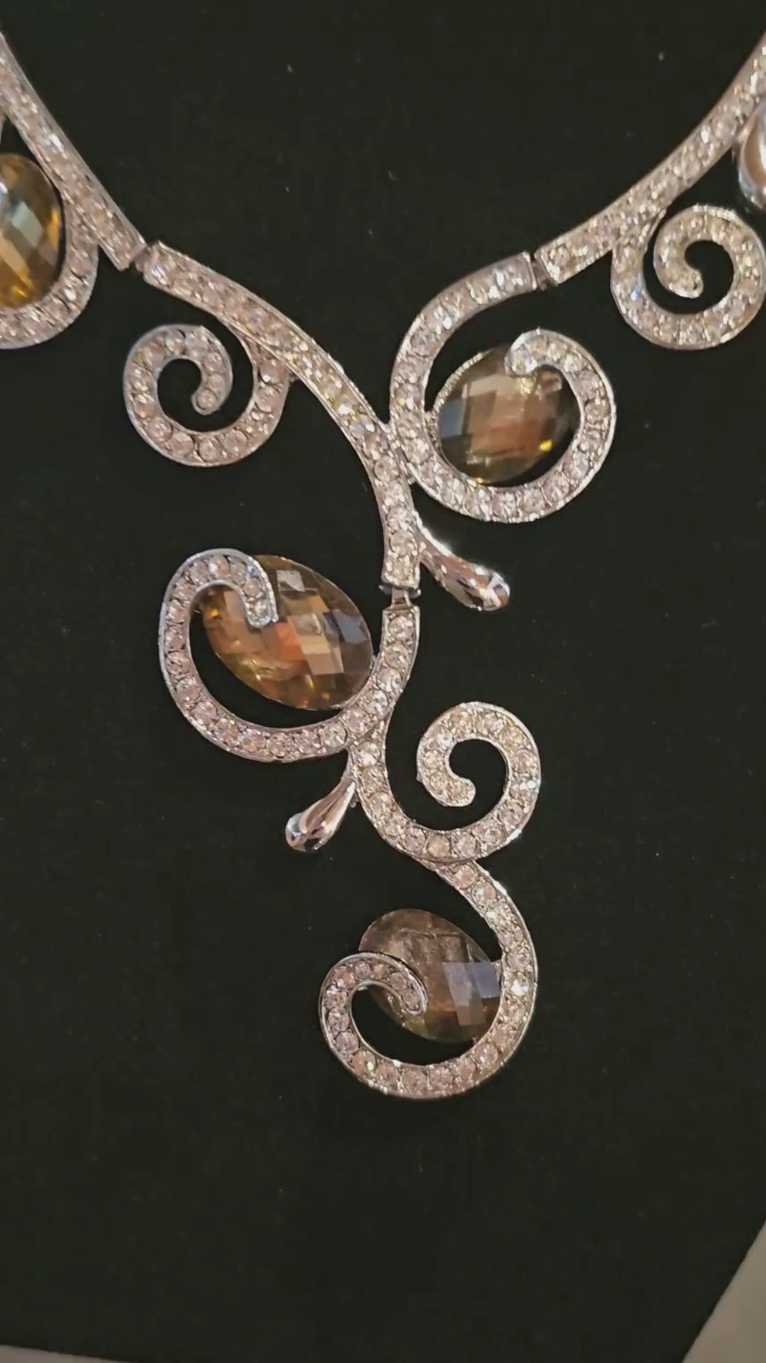 This unique necklace is sure to be the star of the show! The intricate swirls are all decorated with small crystals that catch the light with any movement. The celadon crystals are placed within the swirls for a put together look that is perfect for a special occasion.