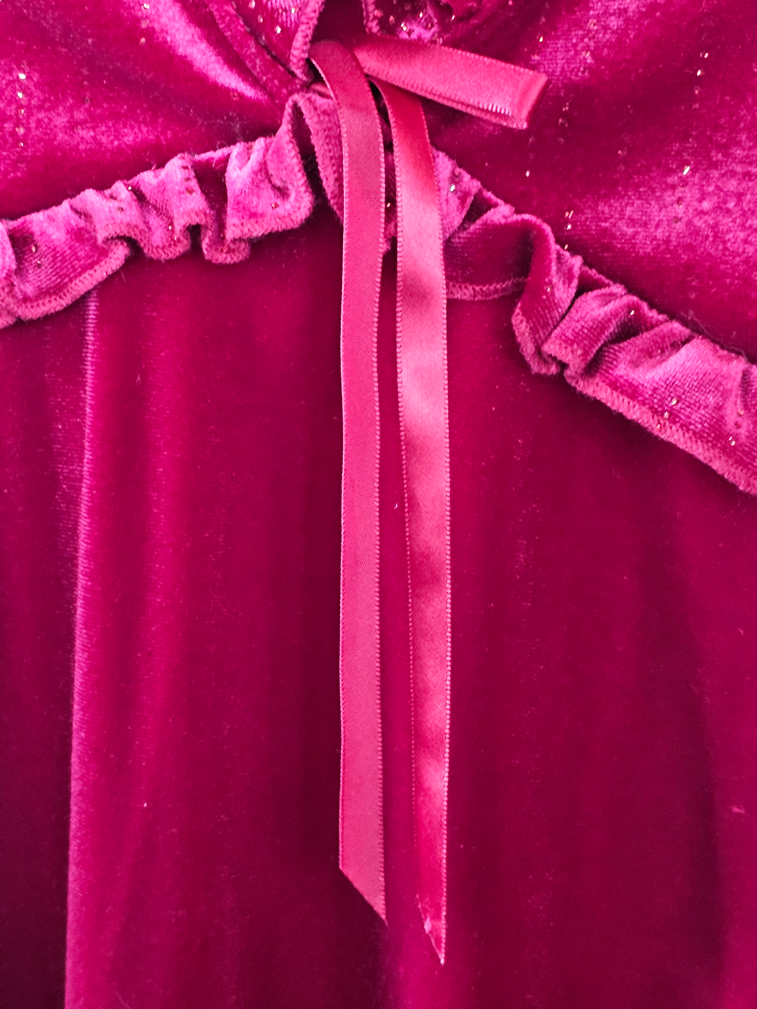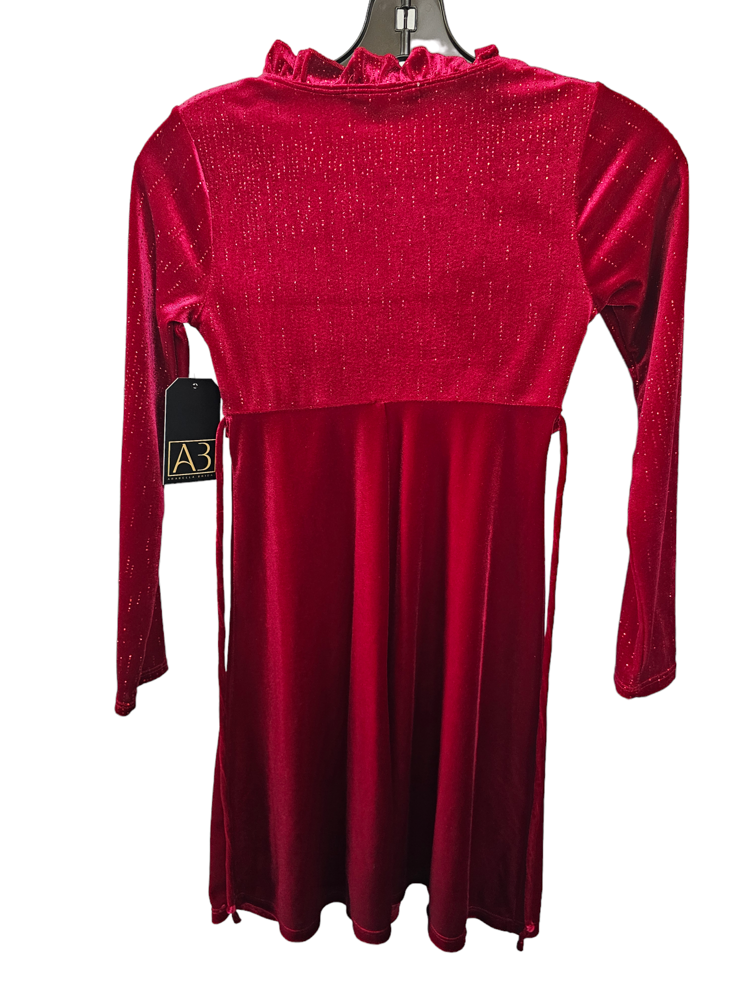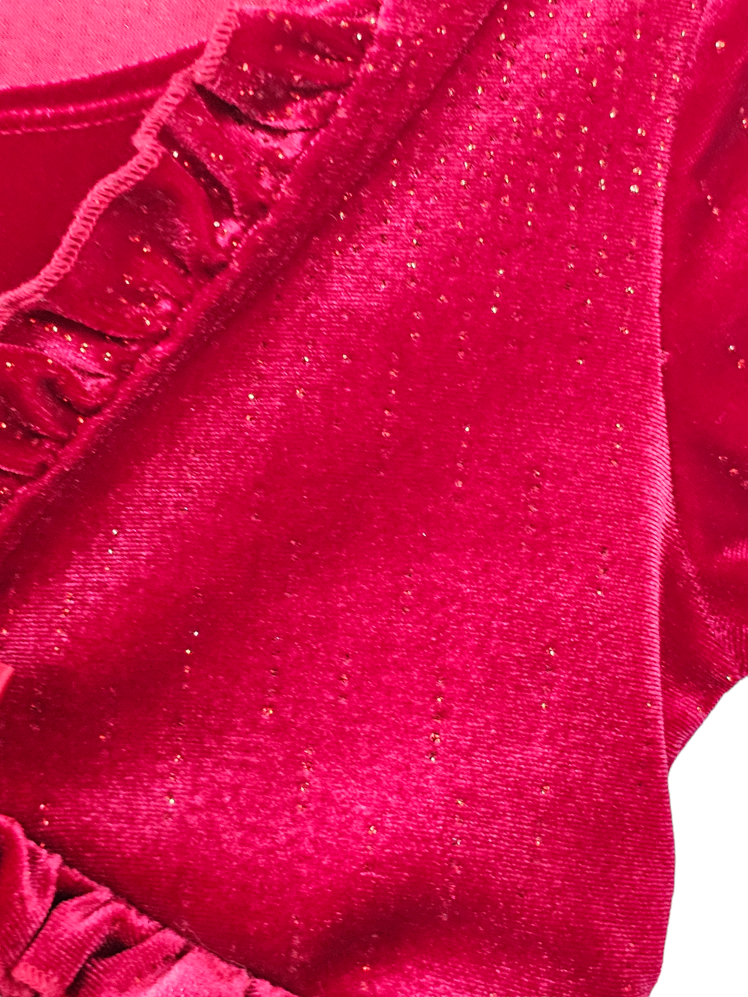Indulge your little one in luxury with this sumptuous red velvet dress. This elegant piece features a cropped longsleeve jacket with a tie front, adding a touch of sophistication to the mid length design. Perfect for special occasions and holiday parties.