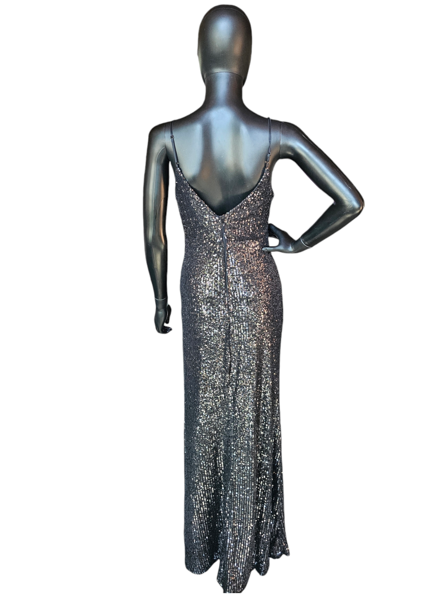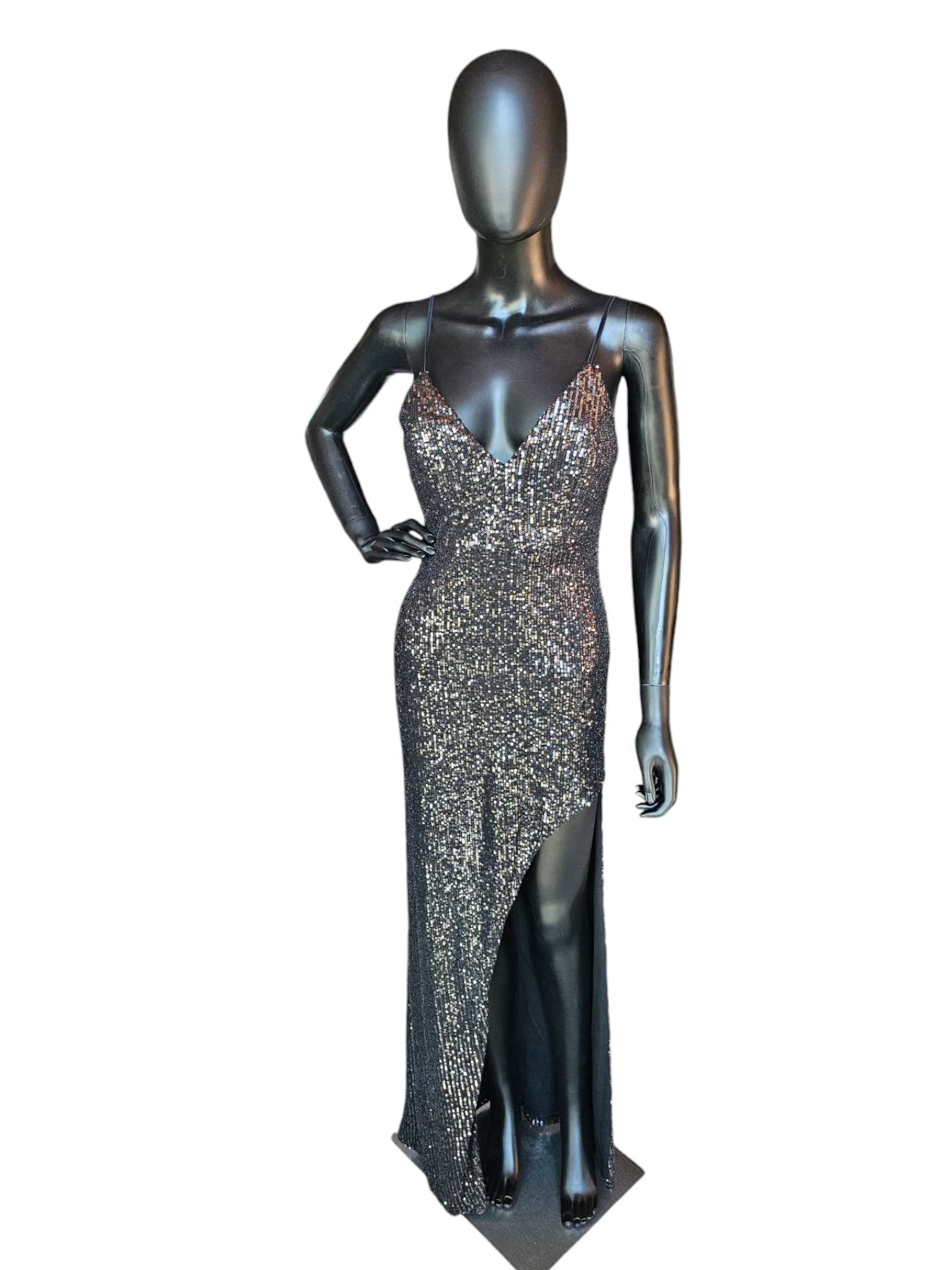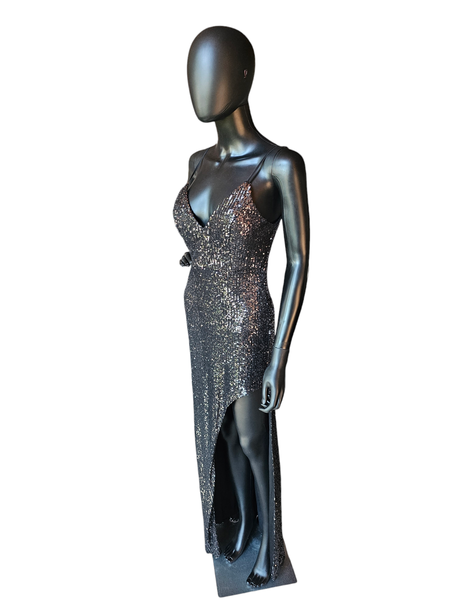 Crystal Doll Black Sequin Thigh Slit Formal Gown