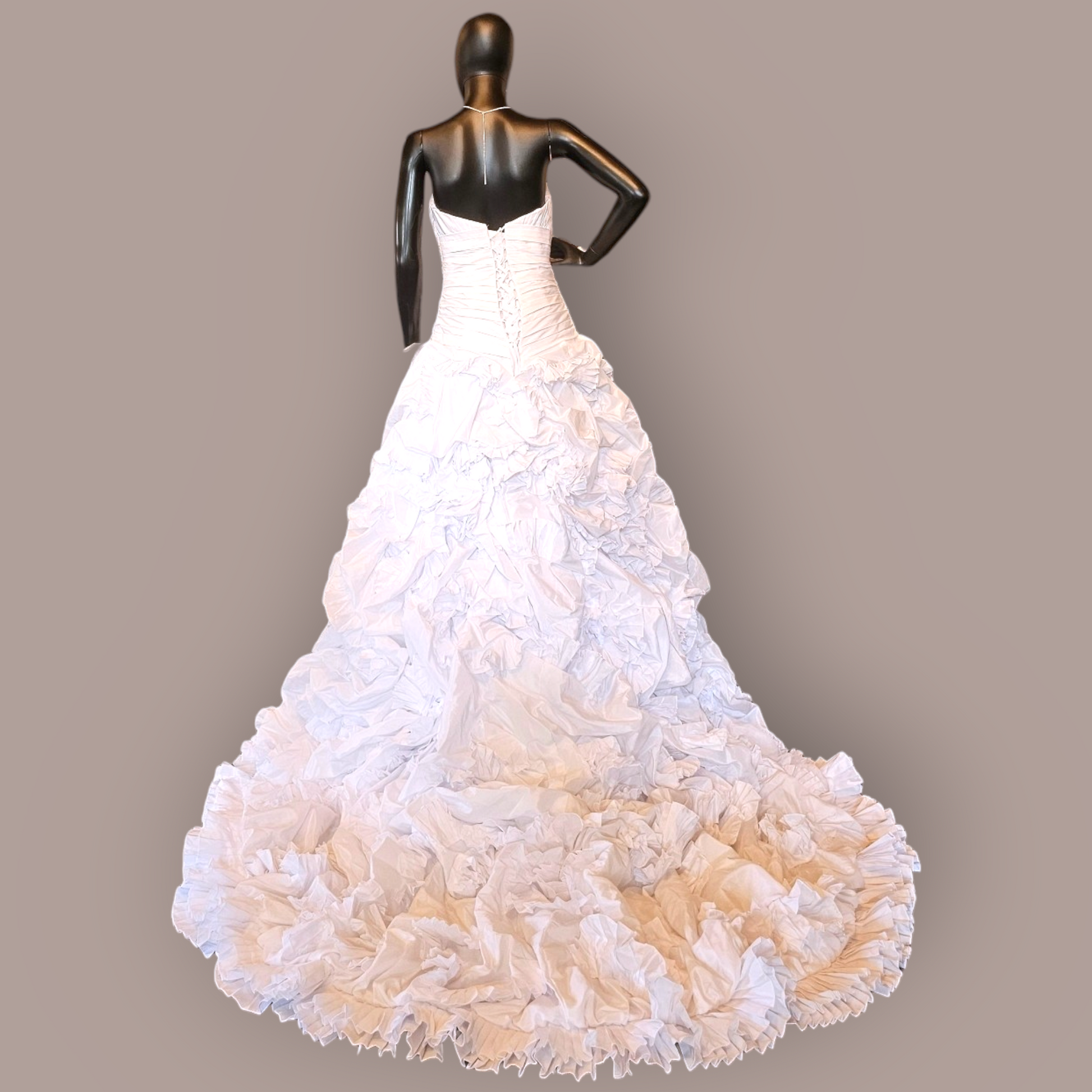 This interesting wedding gown has so much designer detail and fun fashionista vibes! The white taffeta of this gown is folded and pleated in such a way that every inch of the bodice and skirt has something to look at. The fitted bodice features a deep sweetheart neckline and crisscross pleating. The dropped waistline shows off your curves and then explodes into a kaleidoscope of manipulated fabric throughout the whole skirt and long chapel train. Stunning!
