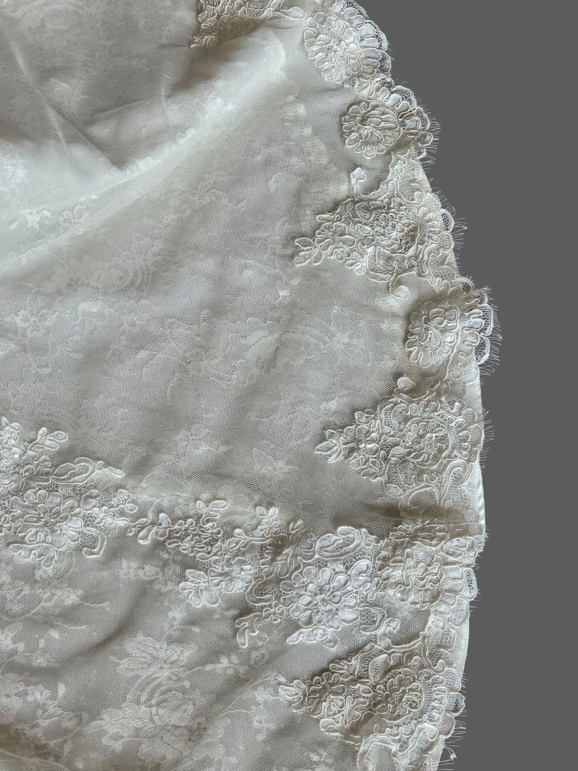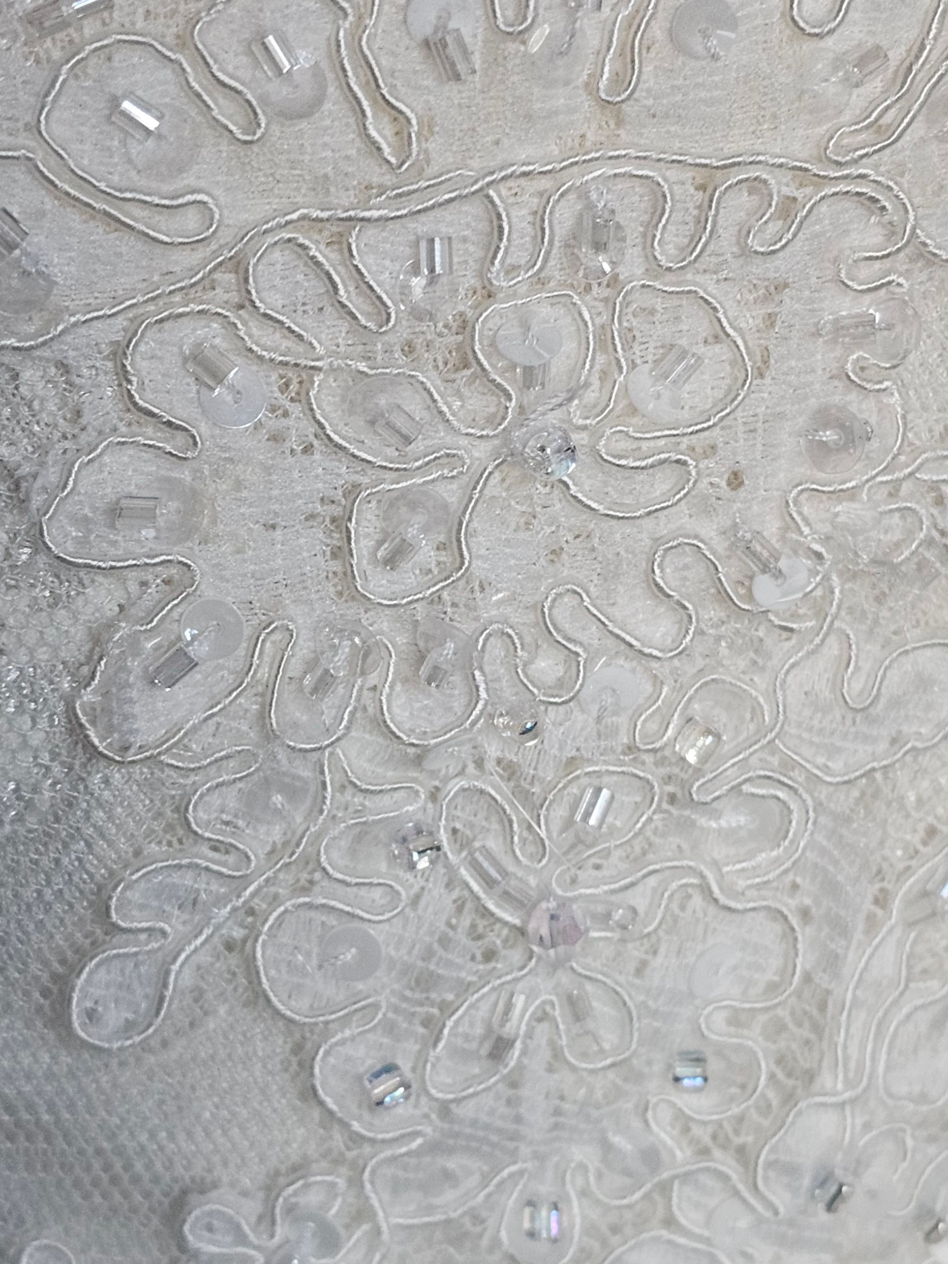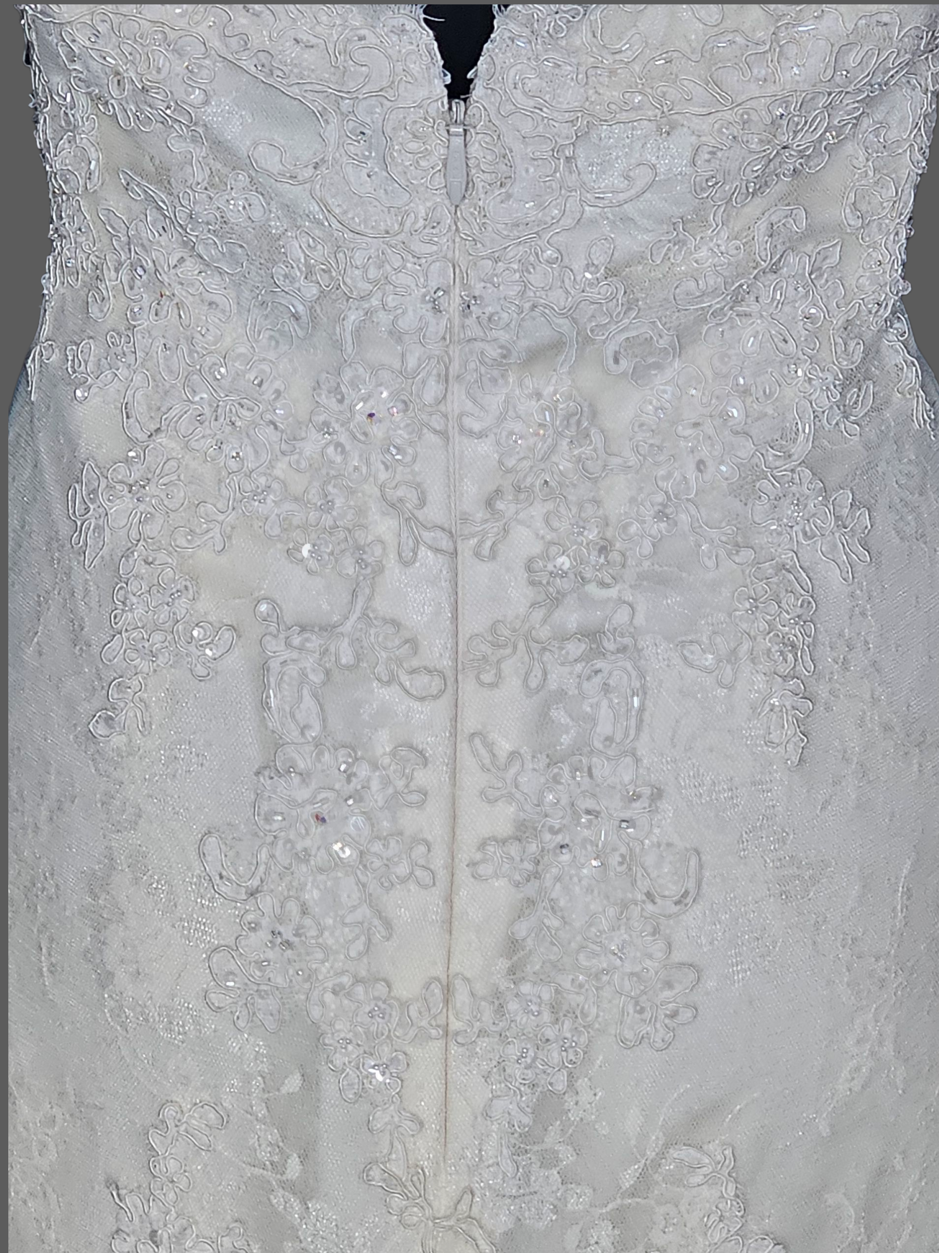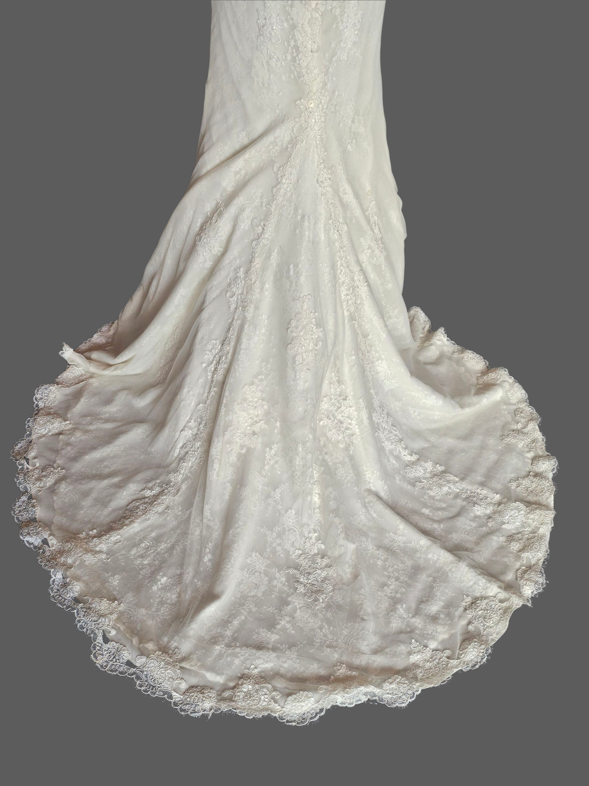 This is a designer label wedding gown that was specially ordered to a specific length from Spain. It has been worn before and cleaned. Minimal alterations. A bustle is already in place. It is in excellent overall condition. The price reflects the condition and pricepoint of the original purchase.