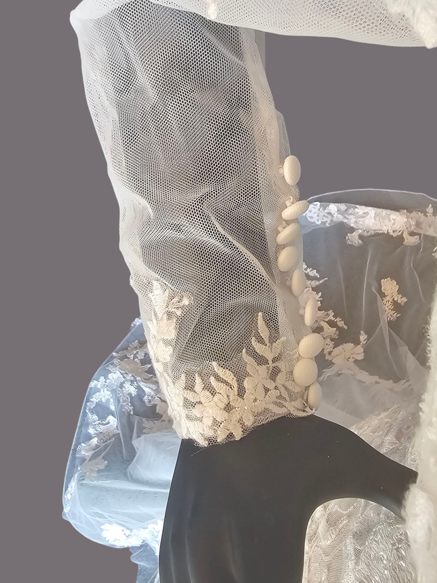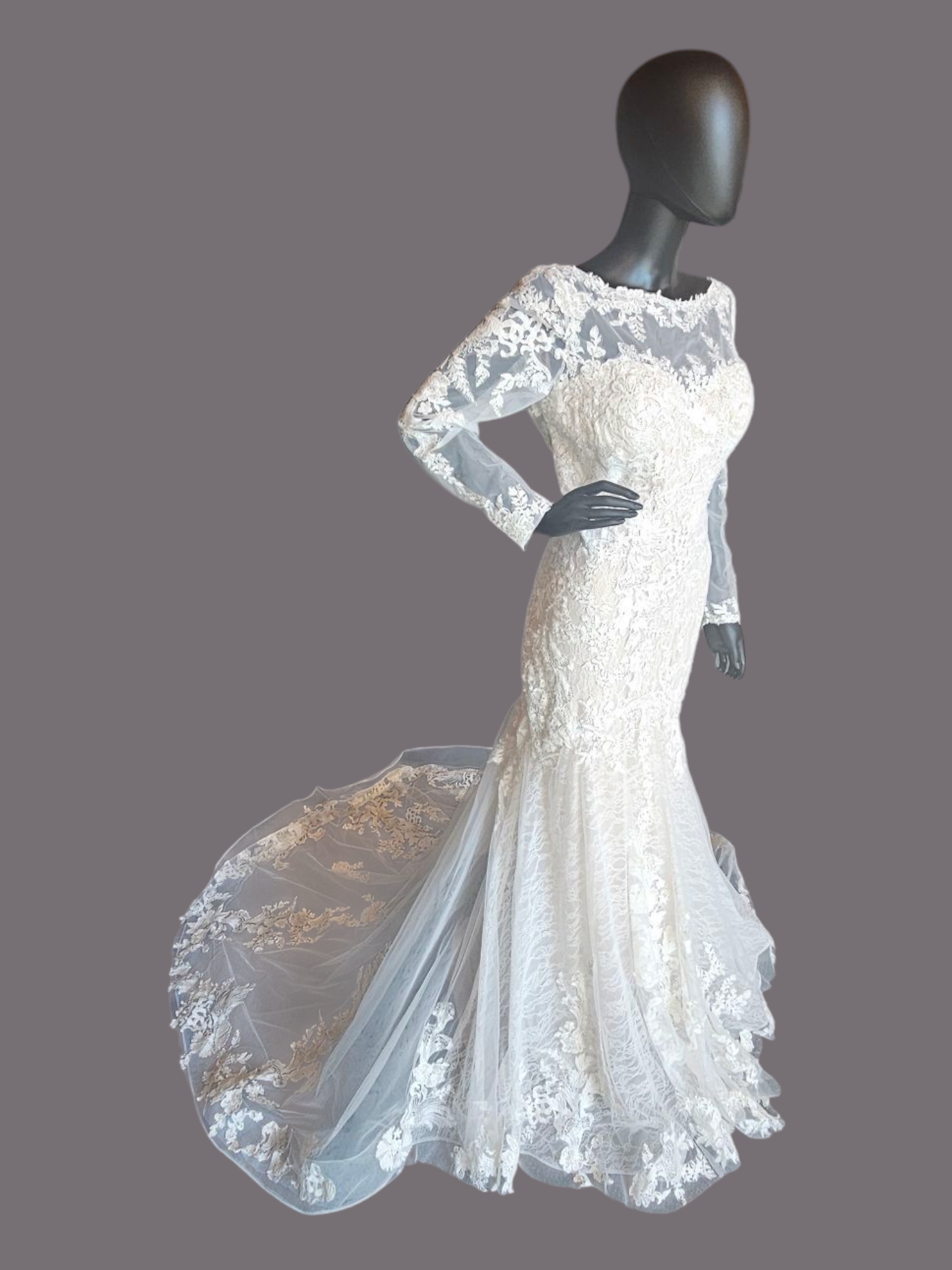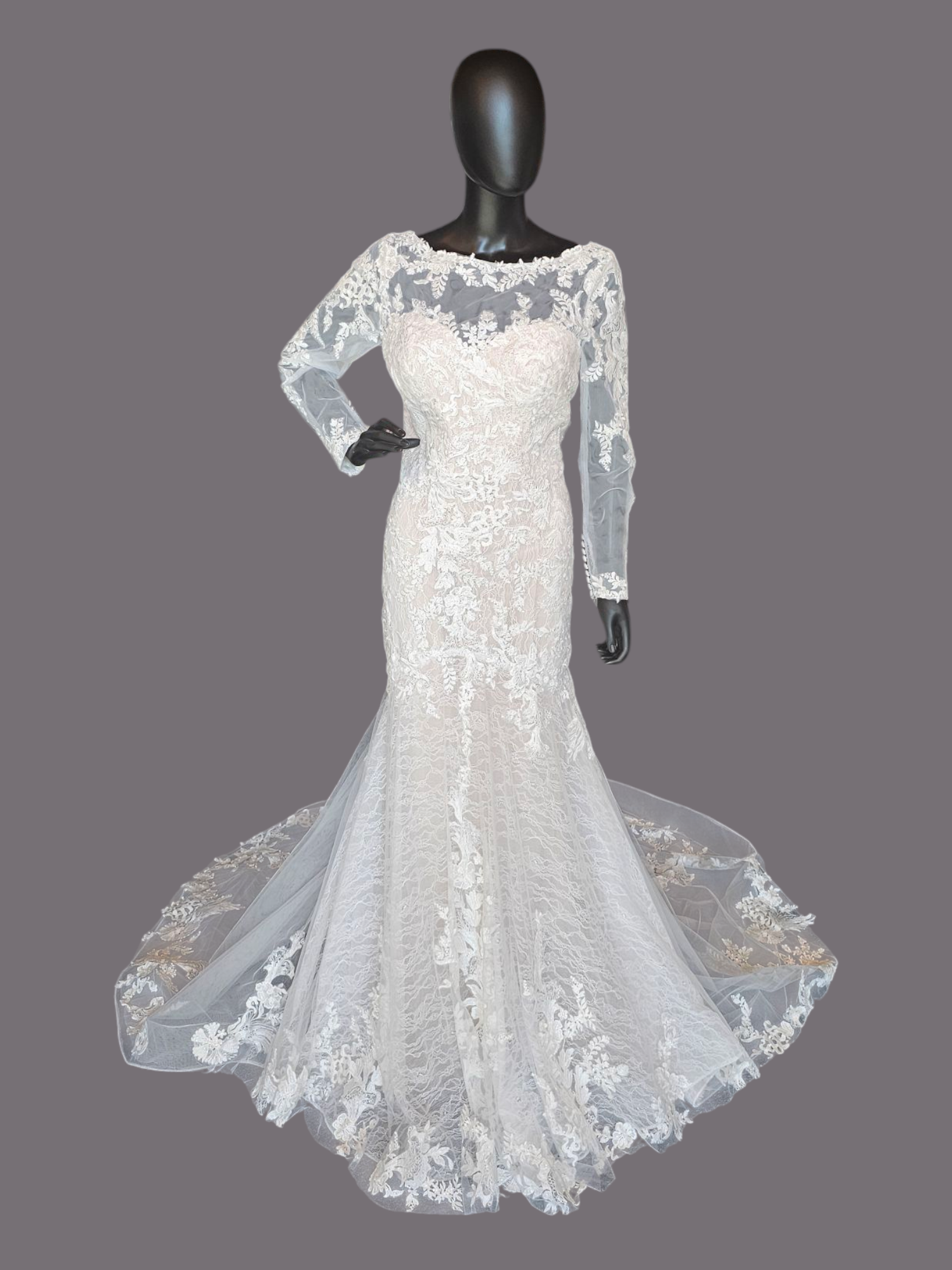 Indulge in luxury with our Blush Illusion Boat Neck Long Sleeve Fit & Flare Lace Wedding GOwn by Stella Couture. Adorned with stunning lace appliques and lace overlay that creates an illusion of depth. With a pop of blush lining and intricate details throughout, this dress exudes sophistication. Long illusion sleeves with buttoned wrists, a demure neckline and an open scoop back complete the dreamy, chapel train silhouette.