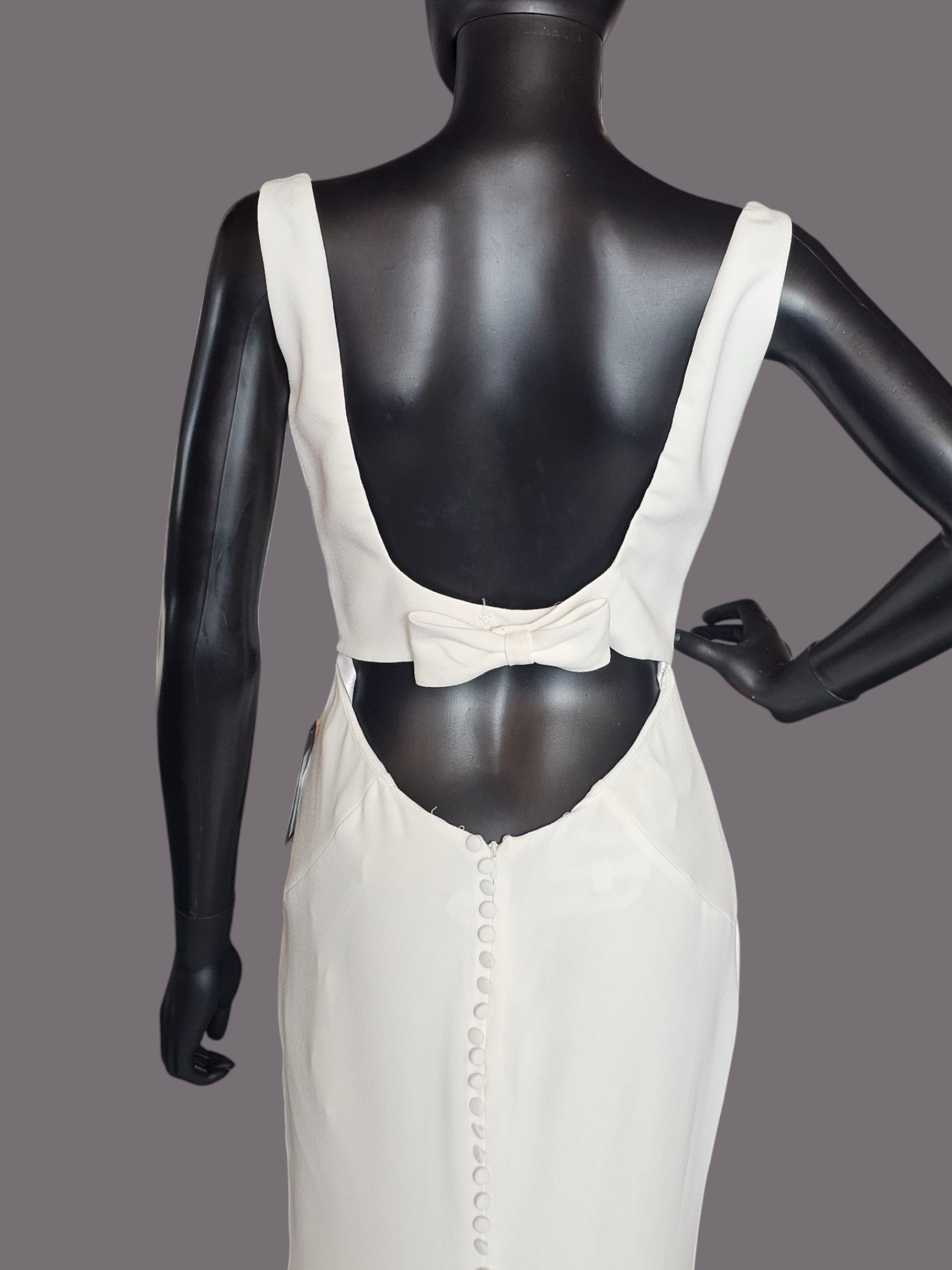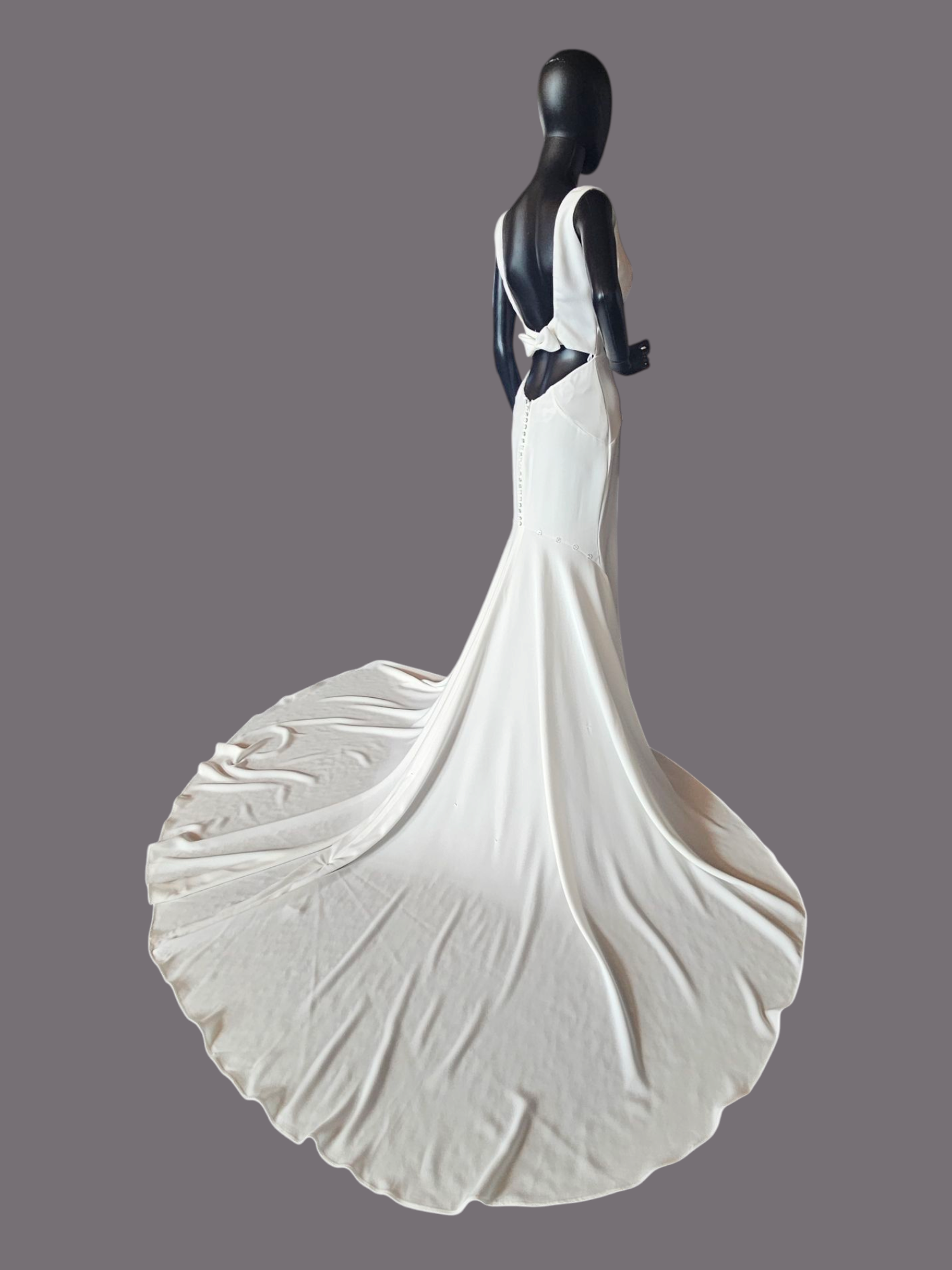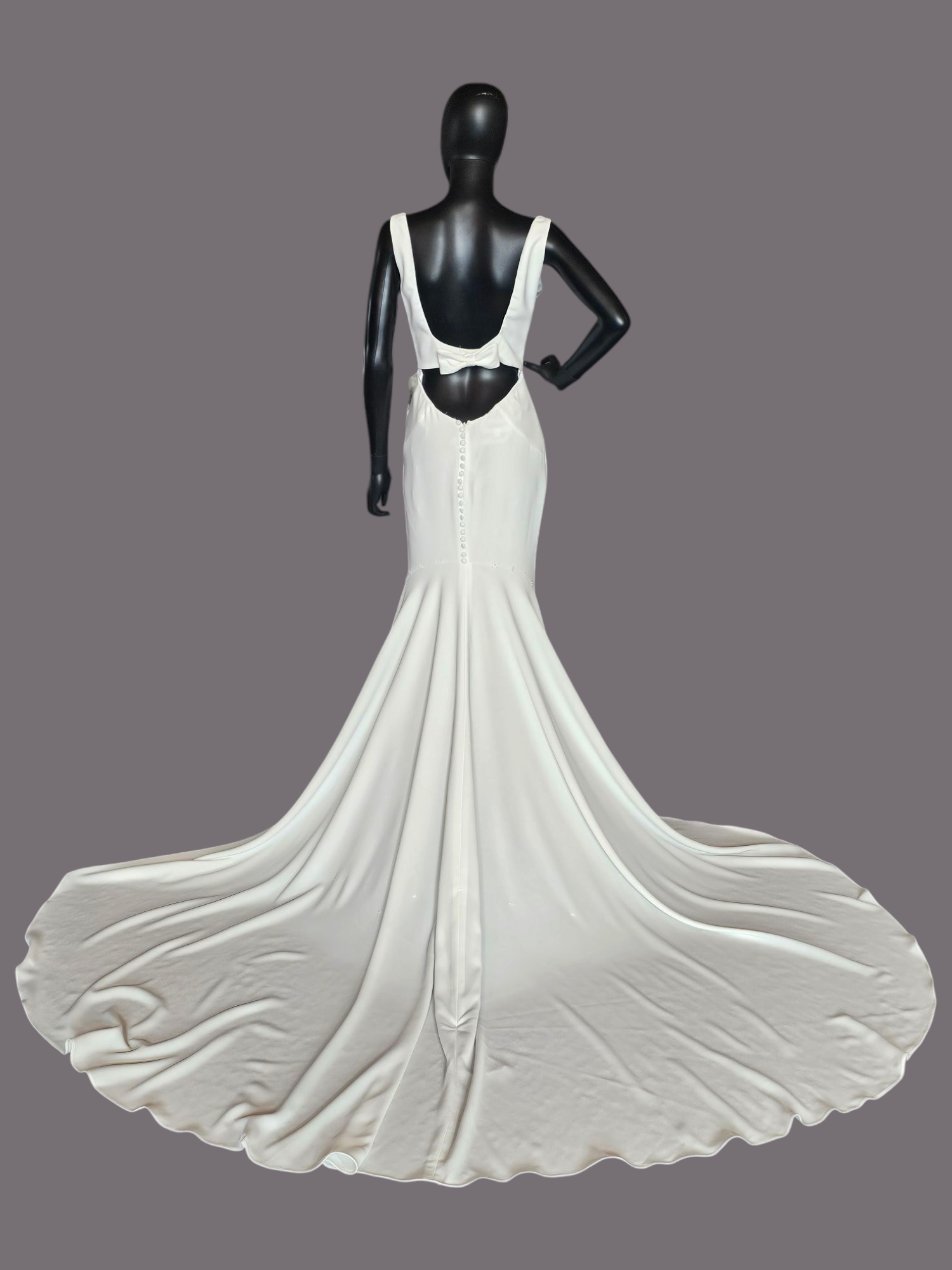 This ivory crepe fit and flare wedding gown from Mori Lee is the epitome of elegance. The heavy stretch crepe fabric drapes beautifully, while the fitted bodice and square neckline offer a stunning silhouette. The open cutout back with a large central bow adds the perfect touch of detail, and the large godet flare cathedral train adds a touch of drama. Crafted with precision and an eye for detail, this gown is perfect for the fashion-forward bride.