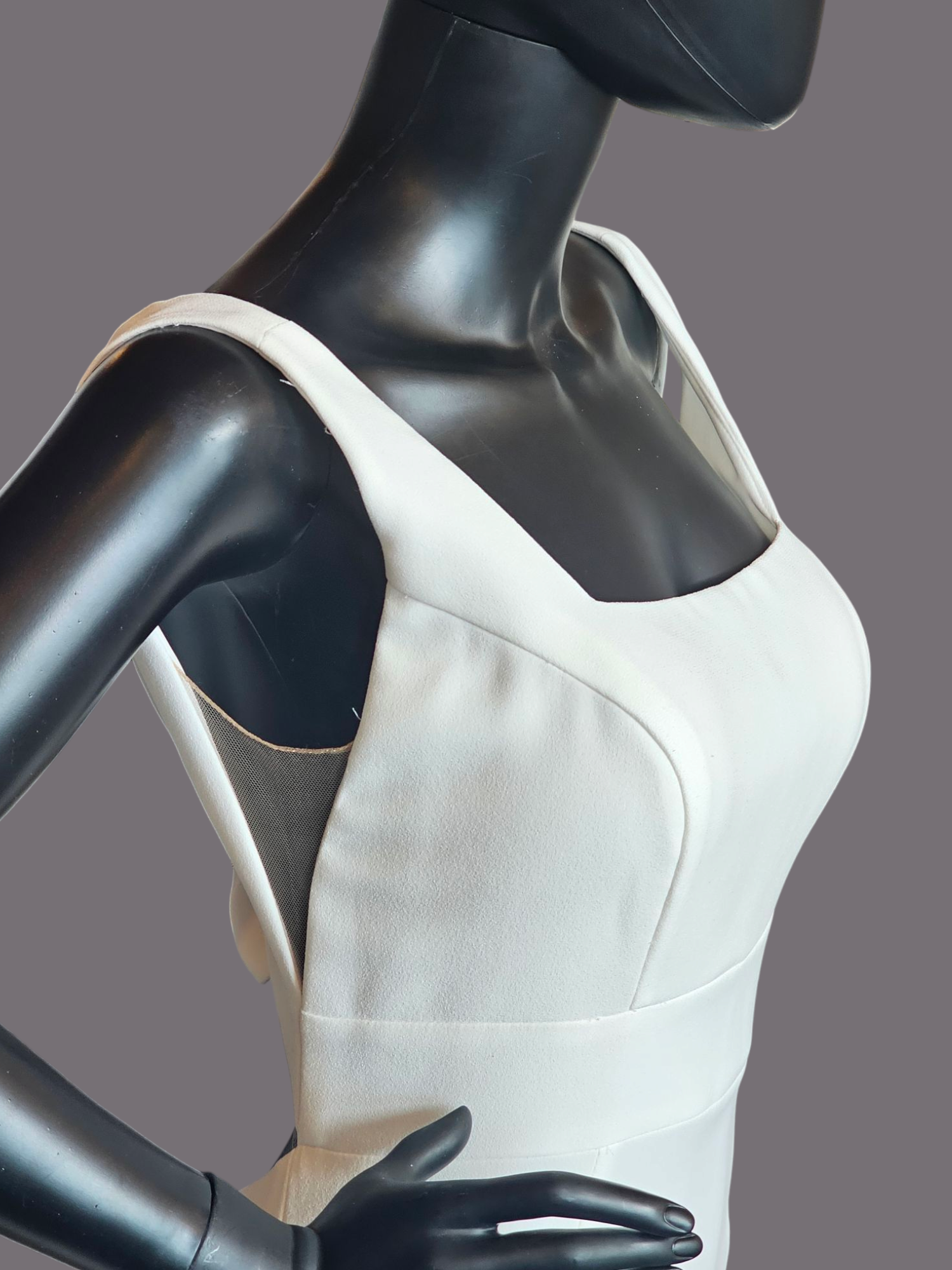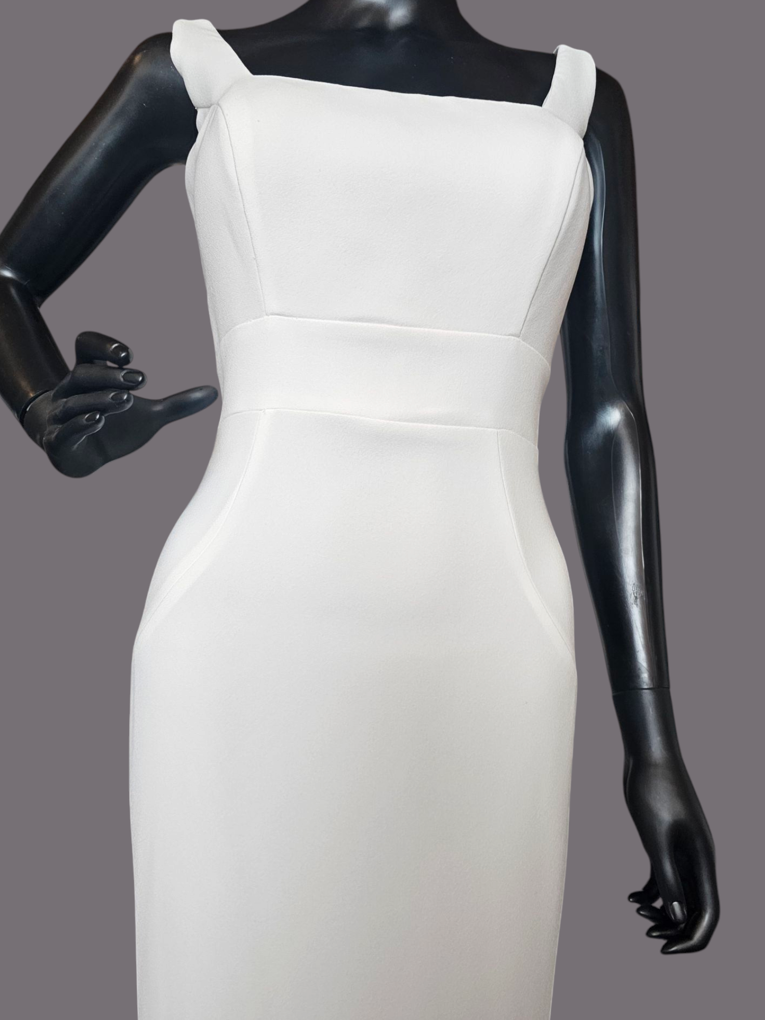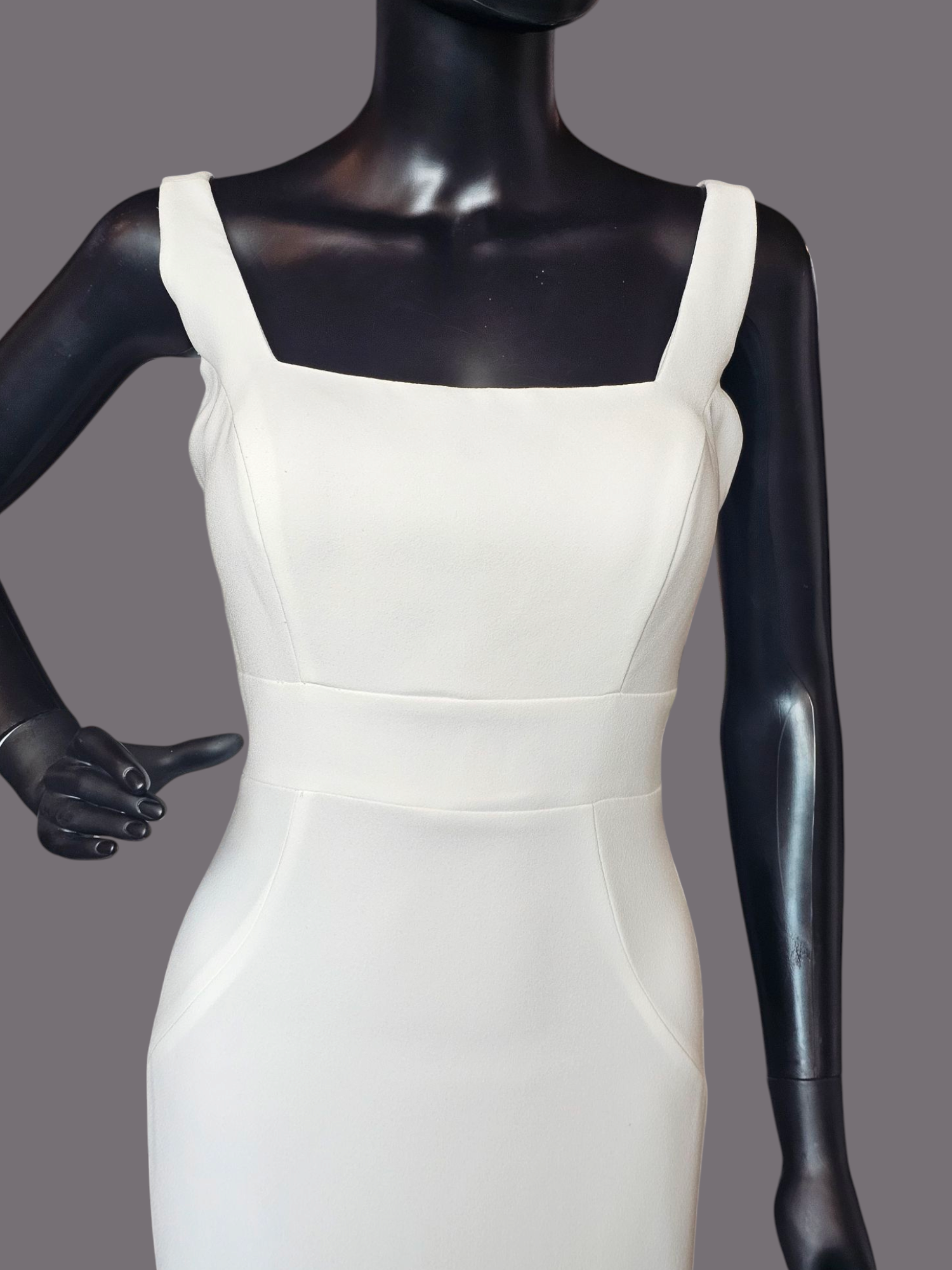 This ivory crepe fit and flare wedding gown from Mori Lee is the epitome of elegance. The heavy stretch crepe fabric drapes beautifully, while the fitted bodice and square neckline offer a stunning silhouette. The open cutout back with a large central bow adds the perfect touch of detail, and the large godet flare cathedral train adds a touch of drama. Crafted with precision and an eye for detail, this gown is perfect for the fashion-forward bride.
