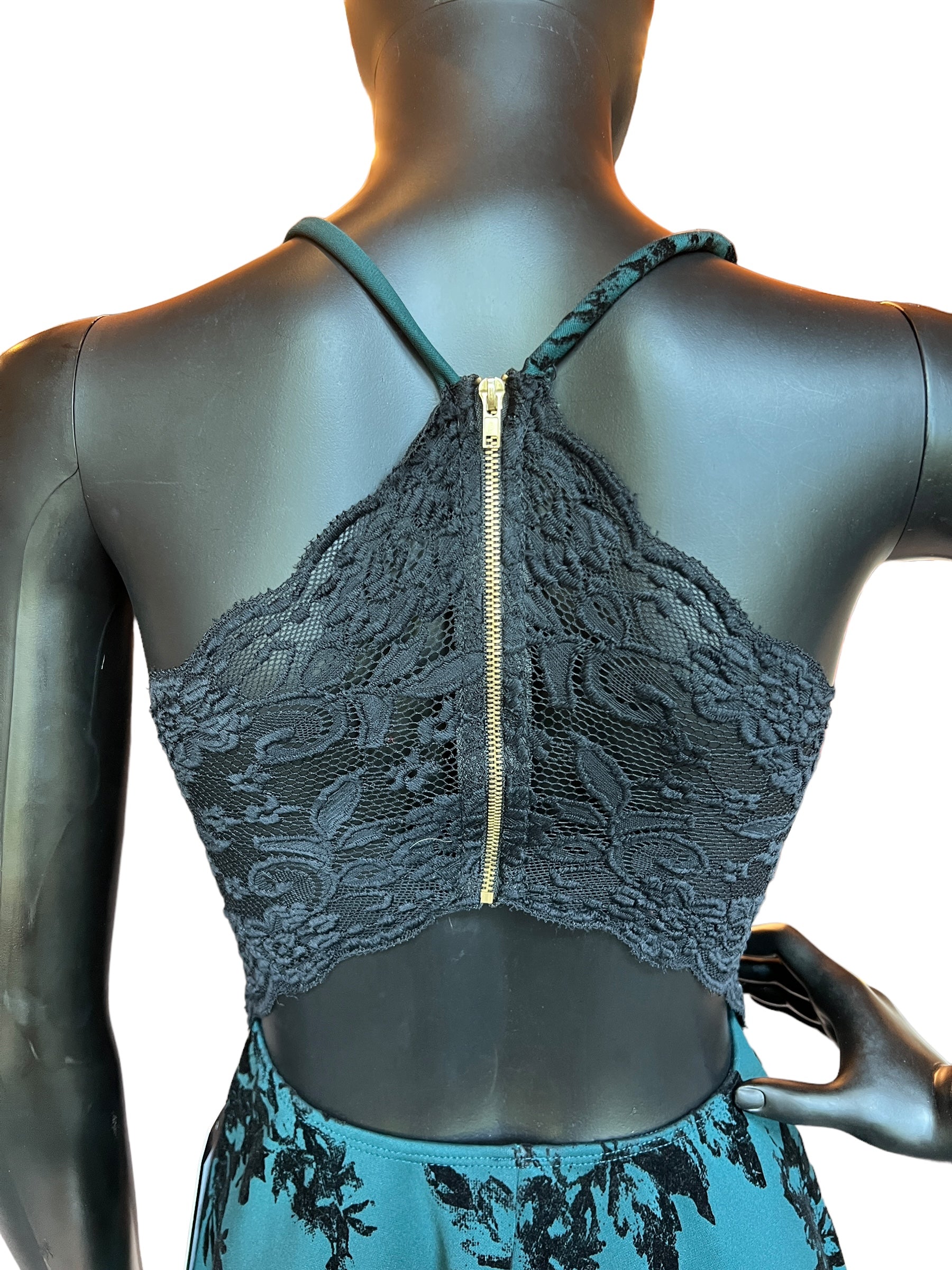 This stunning dress is perfect for prom, a summer wedding, or a garden party! The rich forest green is layered with black floral patterns for a majestic look. The spaghetti straps meet into an intricate illusion open back for that touch of elegance.