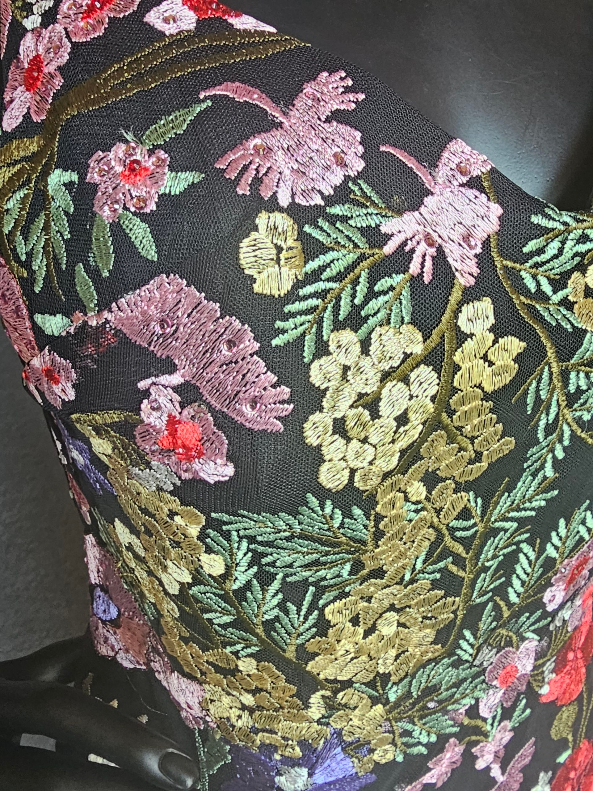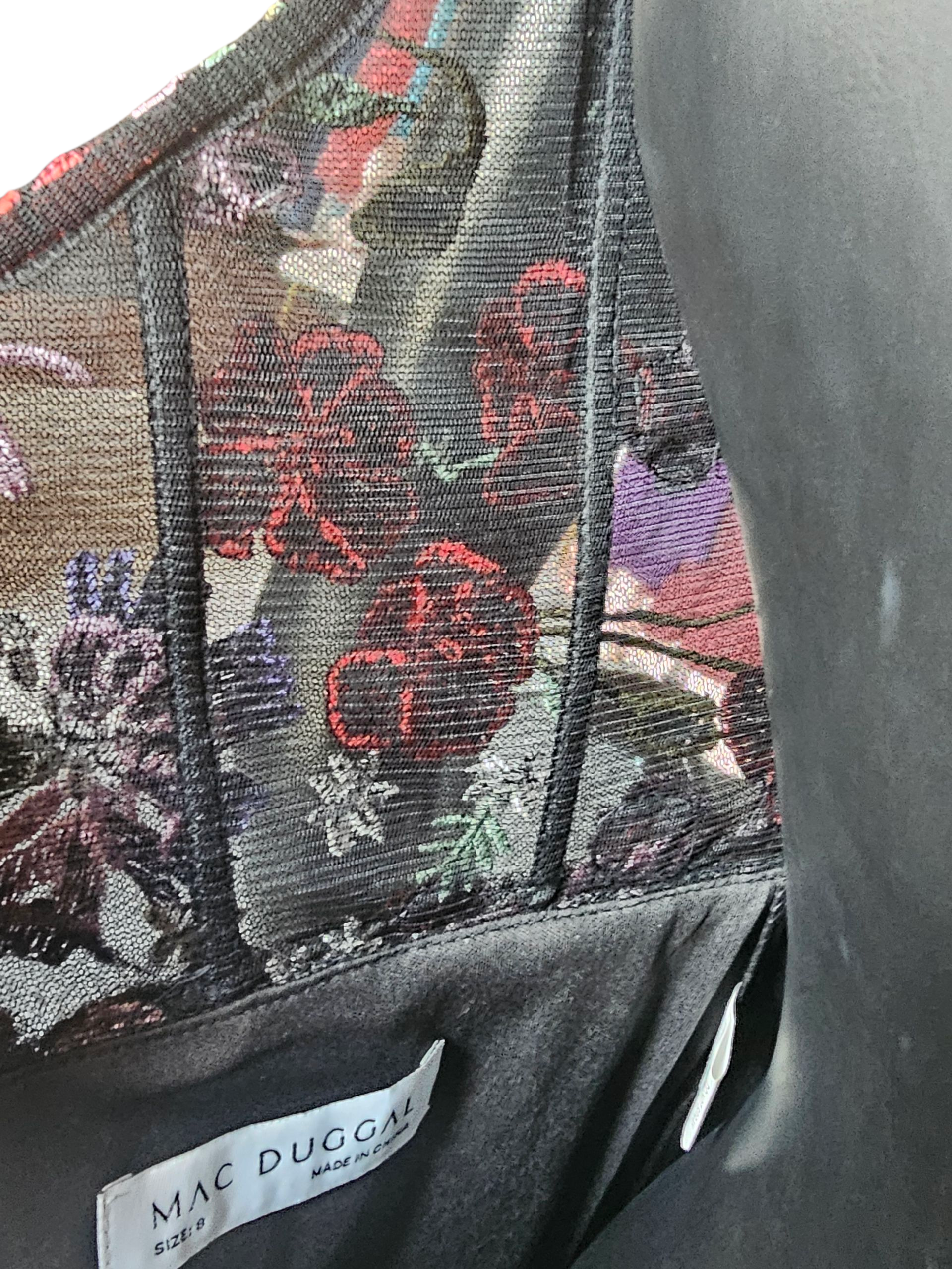 Floral Embroidered Cocktail - Mac DuggalElevate your style with the Mac Duggal Floral Embroidered Cocktail Dress. This stunning black dress features a pop of vibrant colored embroidered flowers and intricate beaded detail on the spaghetti straps. With its fitted silhouette, v neck, and scoop back, this dress will make you stand out at any event.