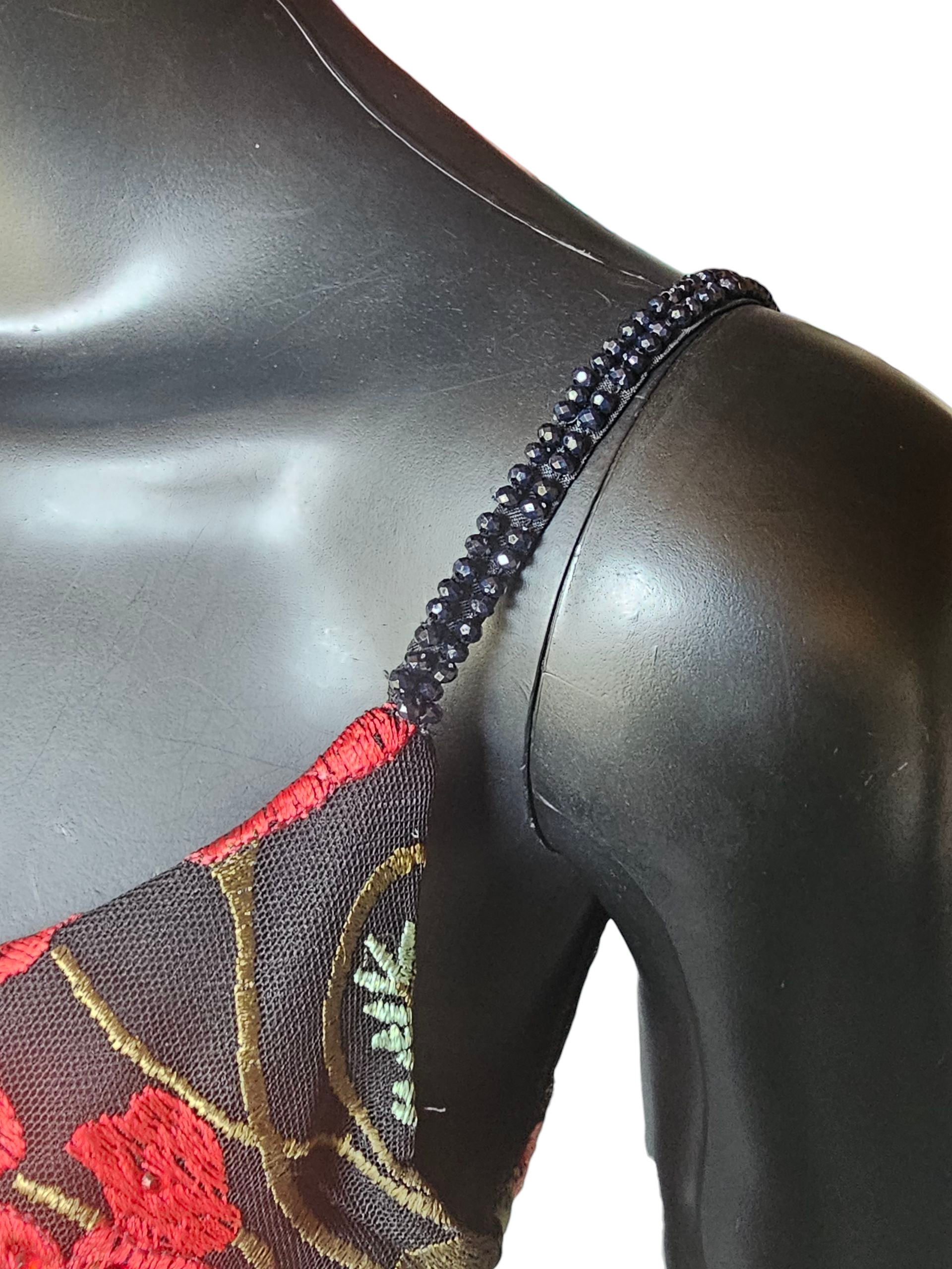 Please note that this dress is part of our pre-loved collection.  This is a highly sought designer label. It has been altered from a full length to a short/knee length dress, but the gorgeous extra fabric come with the dress to add a Bolero Jacket or revised full length.