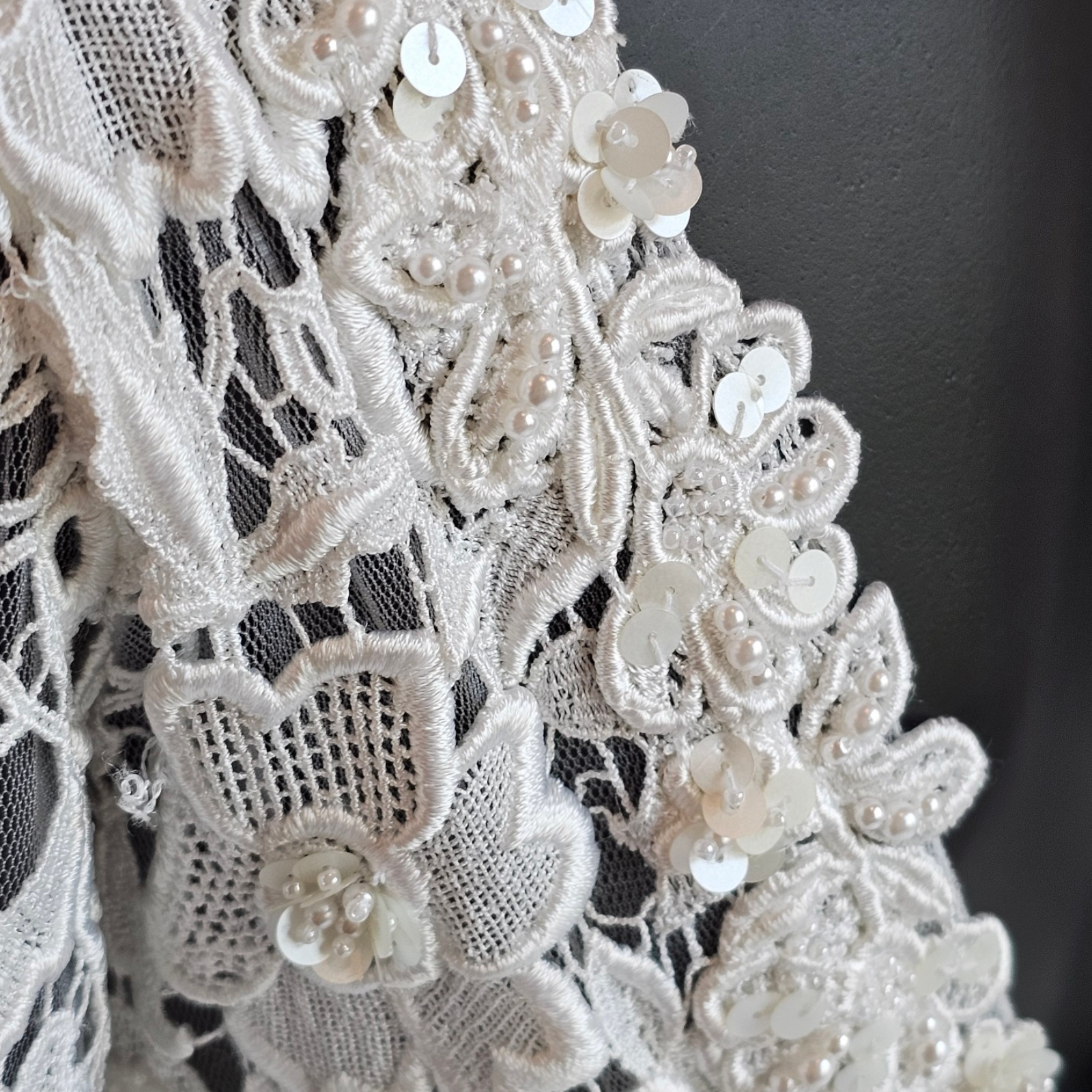 Elevate your wedding style without sacrificing modesty with our Floral Lace Bodice Long Sleeve Wedding Gown. The white satin and elegant lace bodice exude sophistication, while the basque waistline flatters your figure. The illusion sleeve and v-neckline add a touch of romance, while the open weave floral lace with bead and sequin accent adds a subtle sparkle. Finished with a gorgeous cathedral train and delicate lace details along the hem.