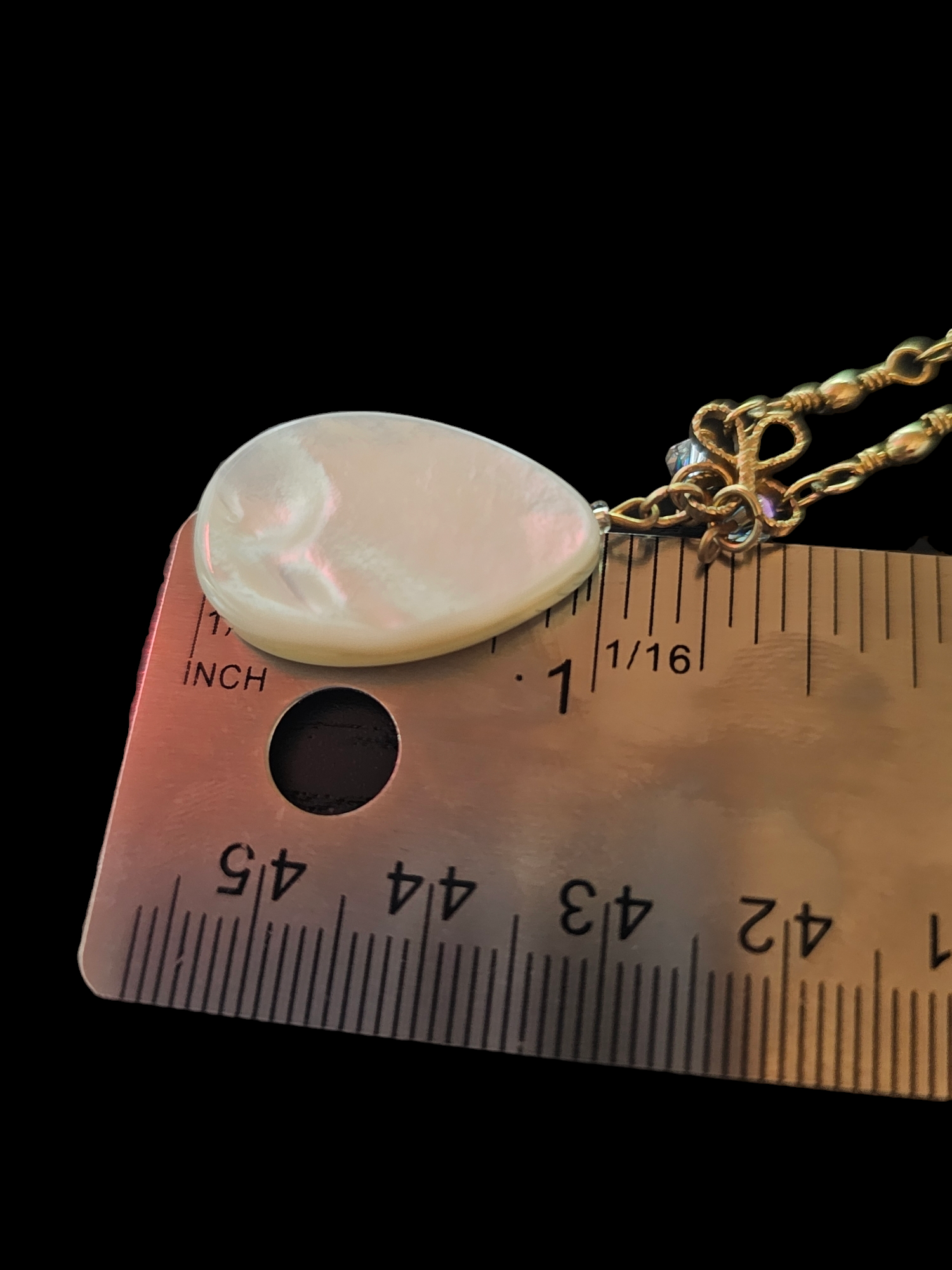 This exquisite set features a beautiful and delicate necklace, crafted with an aged gold chain embellished with twists and knot details. Adorned with iridescent Swarovski crystals, the necklace showcases medium freshwater pearls and a large teardrop mother of pearl dangles. The matching hook clasp earrings add a luxurious touch to this elegant piece. Perfect for the sophisticated and exclusive fashionista.