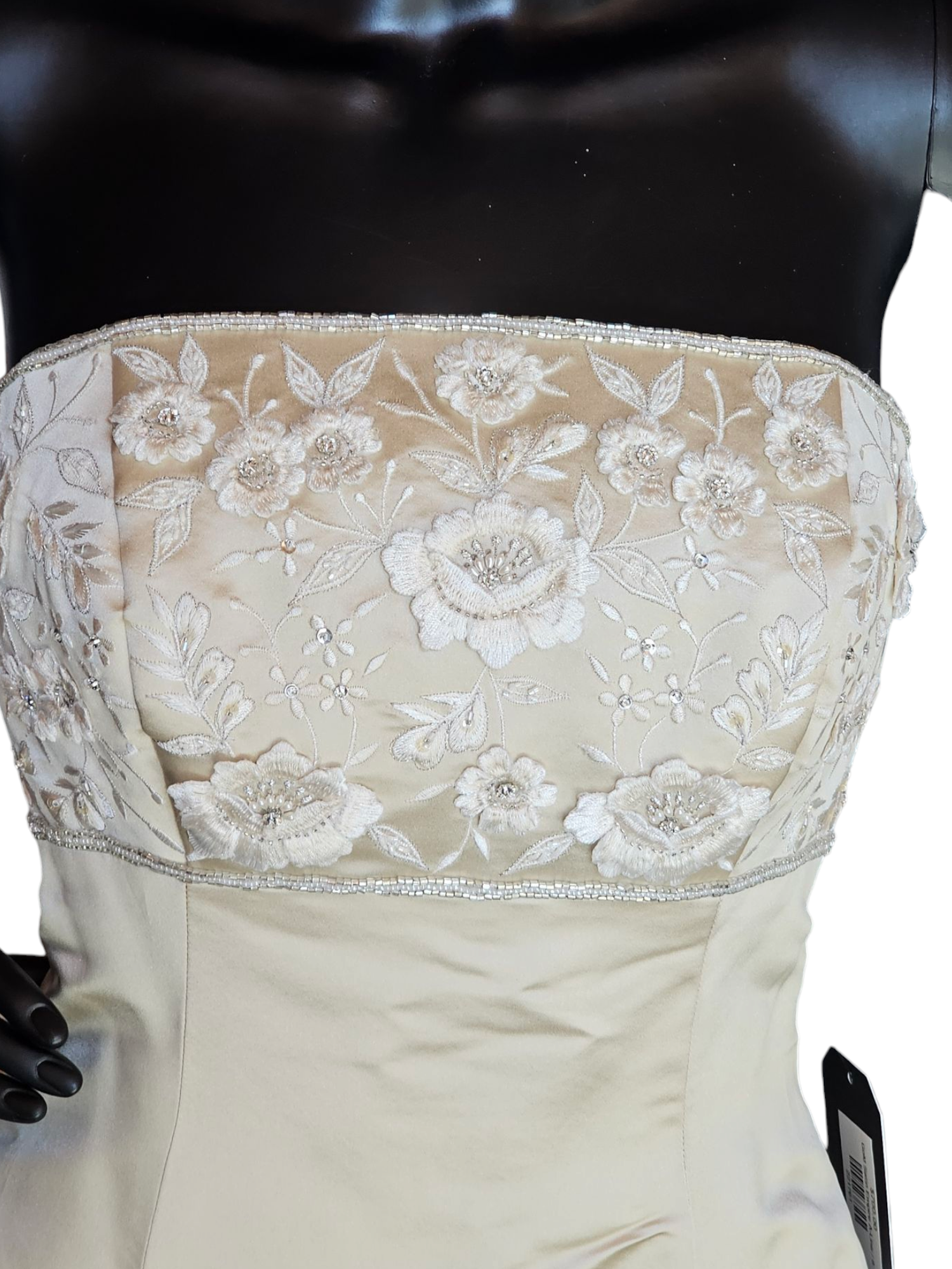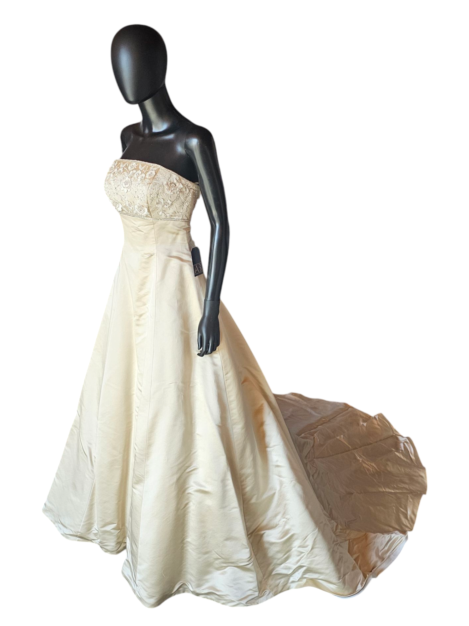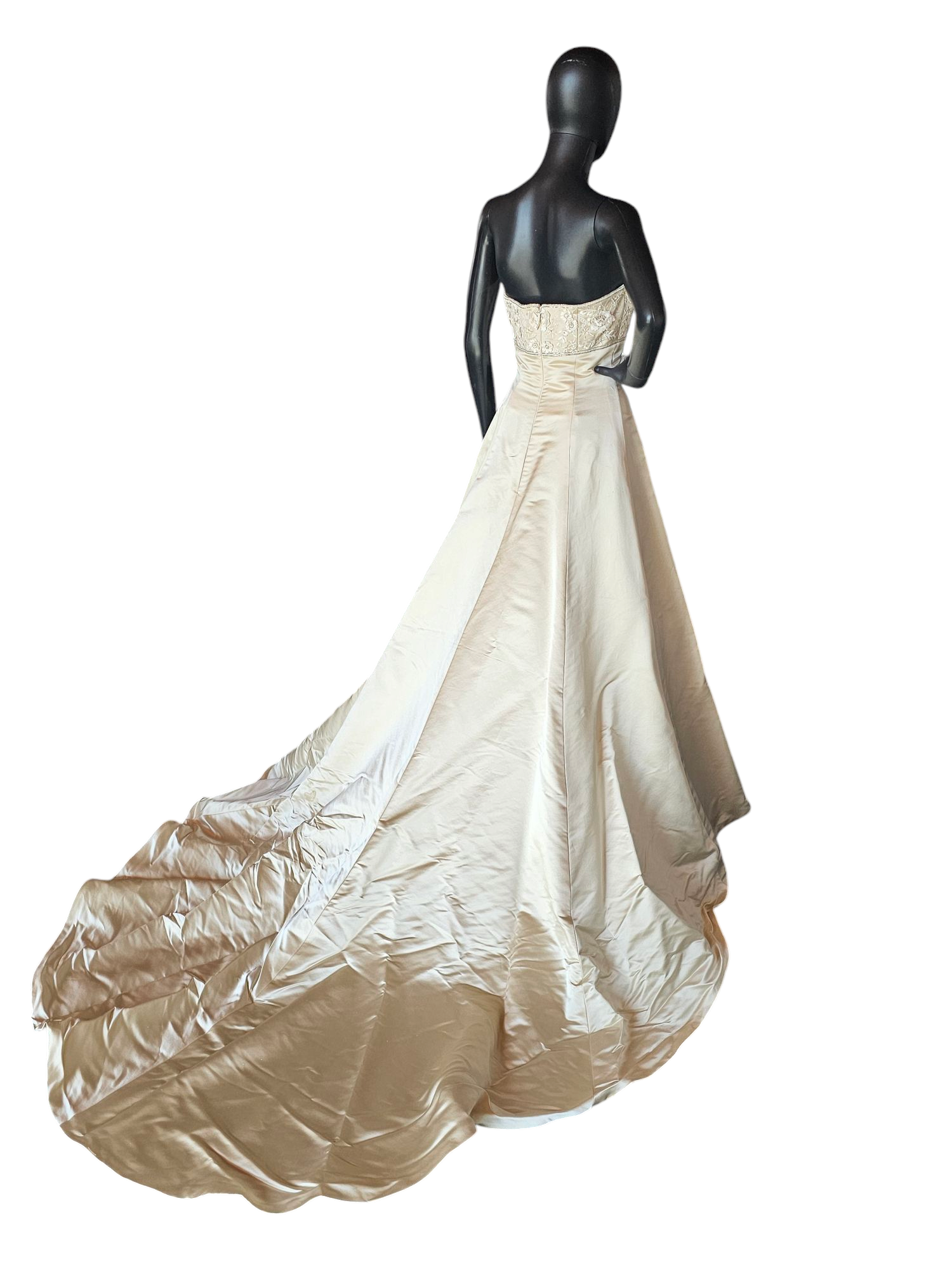 Elevate your bridal elegance with our Gold Satin Empire A-Line Wedding Gown. The rich golden satin fabric and A-line silhouette with empire details exude luxury, while the delicate floral appliques along the straight bustline add a touch of artistry. A sleek and simple design is elevated with a stunning chapel train. Perfect for a bride who desires sophistication and unique detail on her special day.