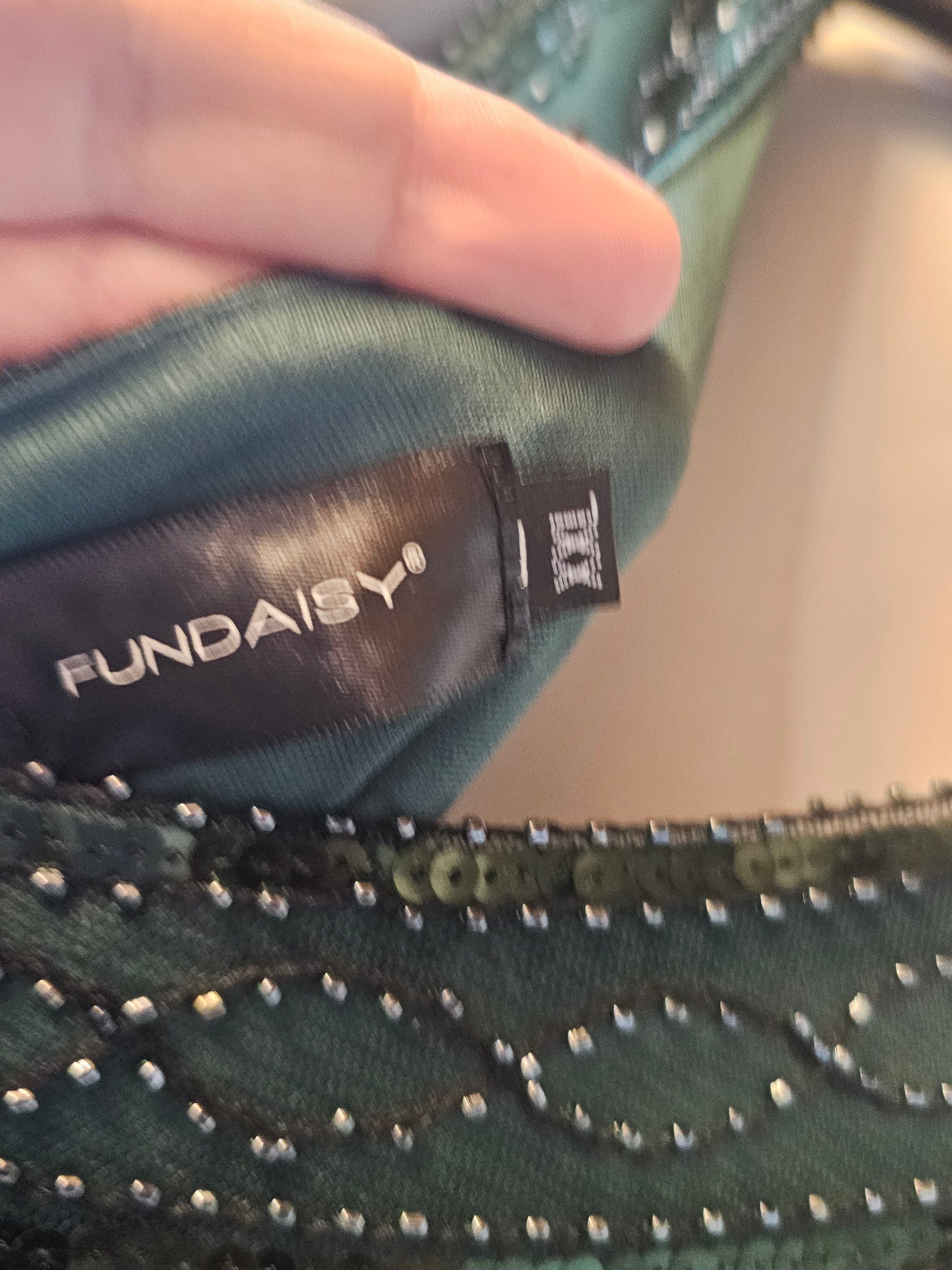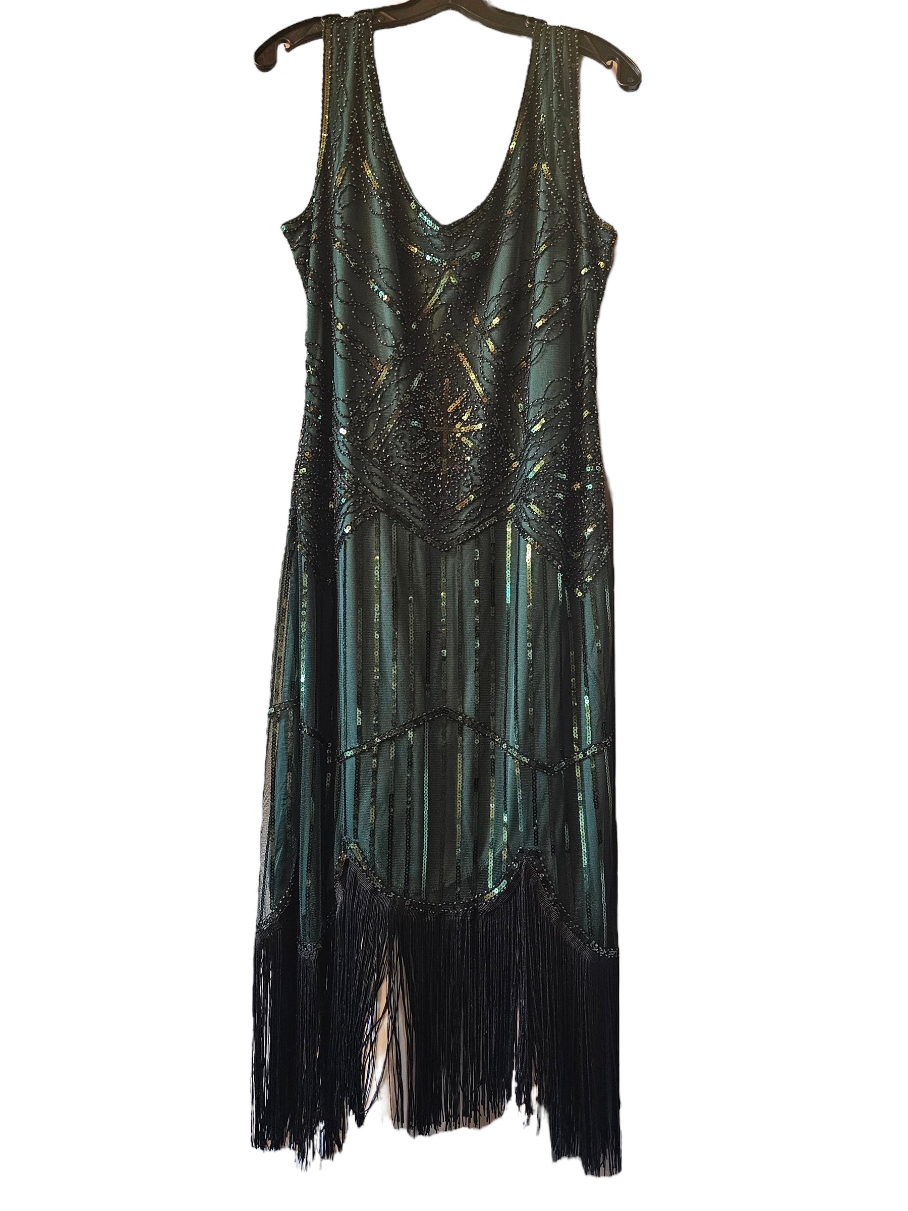 So much fun! This amazingly detailed little dress is a show-stopper. The rich green color is off-set with the black beaded details and fringe. This dress is perfect to make a statement at prom, a holiday event, or just for fun!