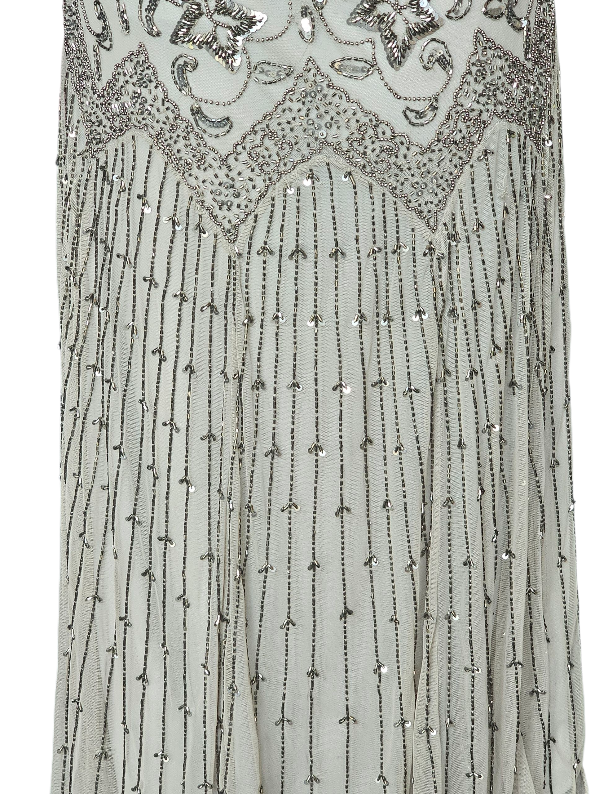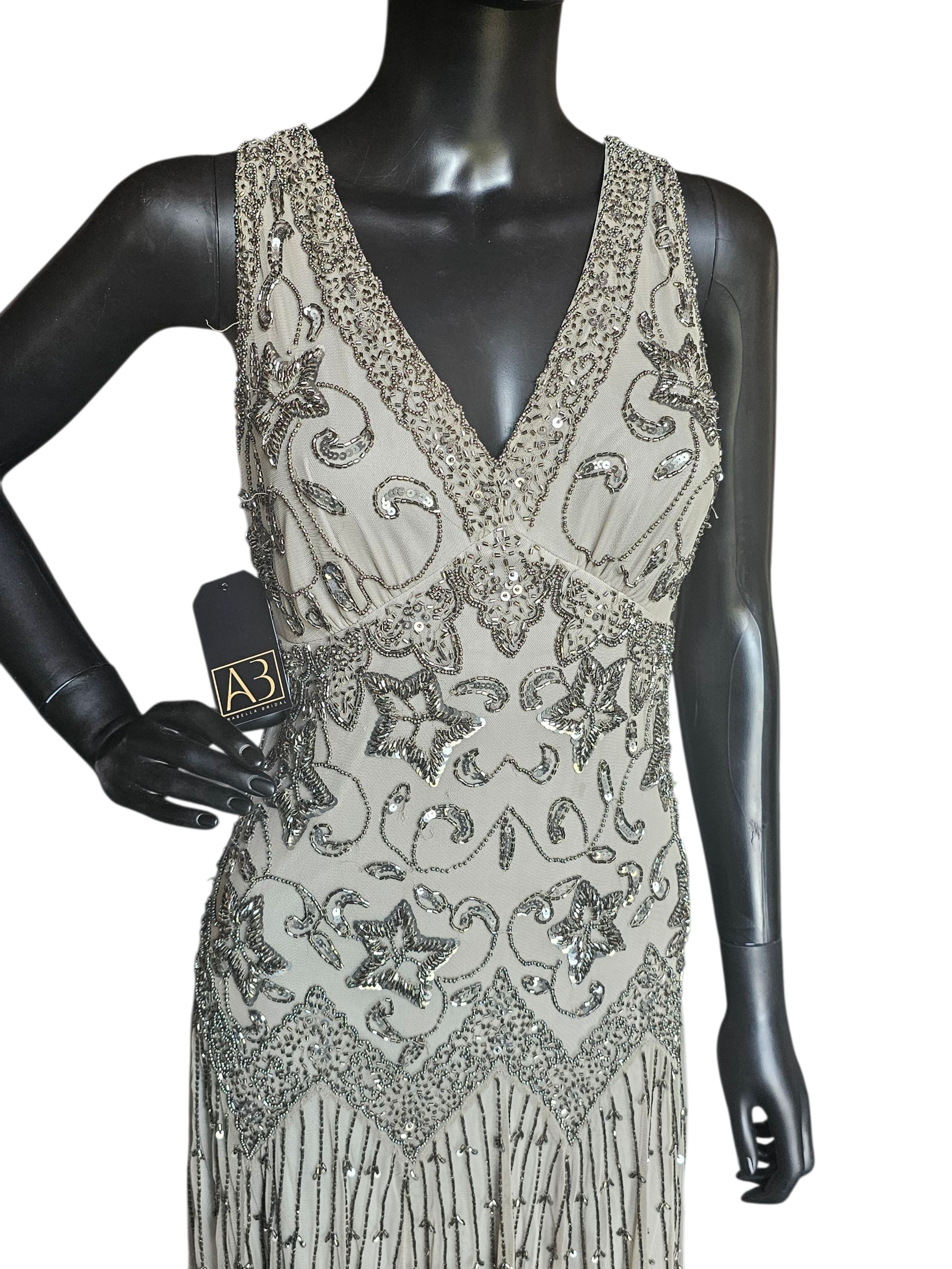 This Sage Green/Metallic Beaded Drop Waist Party Dress from Pissaro Nights boasts stunning art deco beading details, a flattering drop waist, and a flowy swing skirt that falls mid calf. The v-neckline and side zip add an elegant touch to this bias cut dress. Perfect for any special occasion.