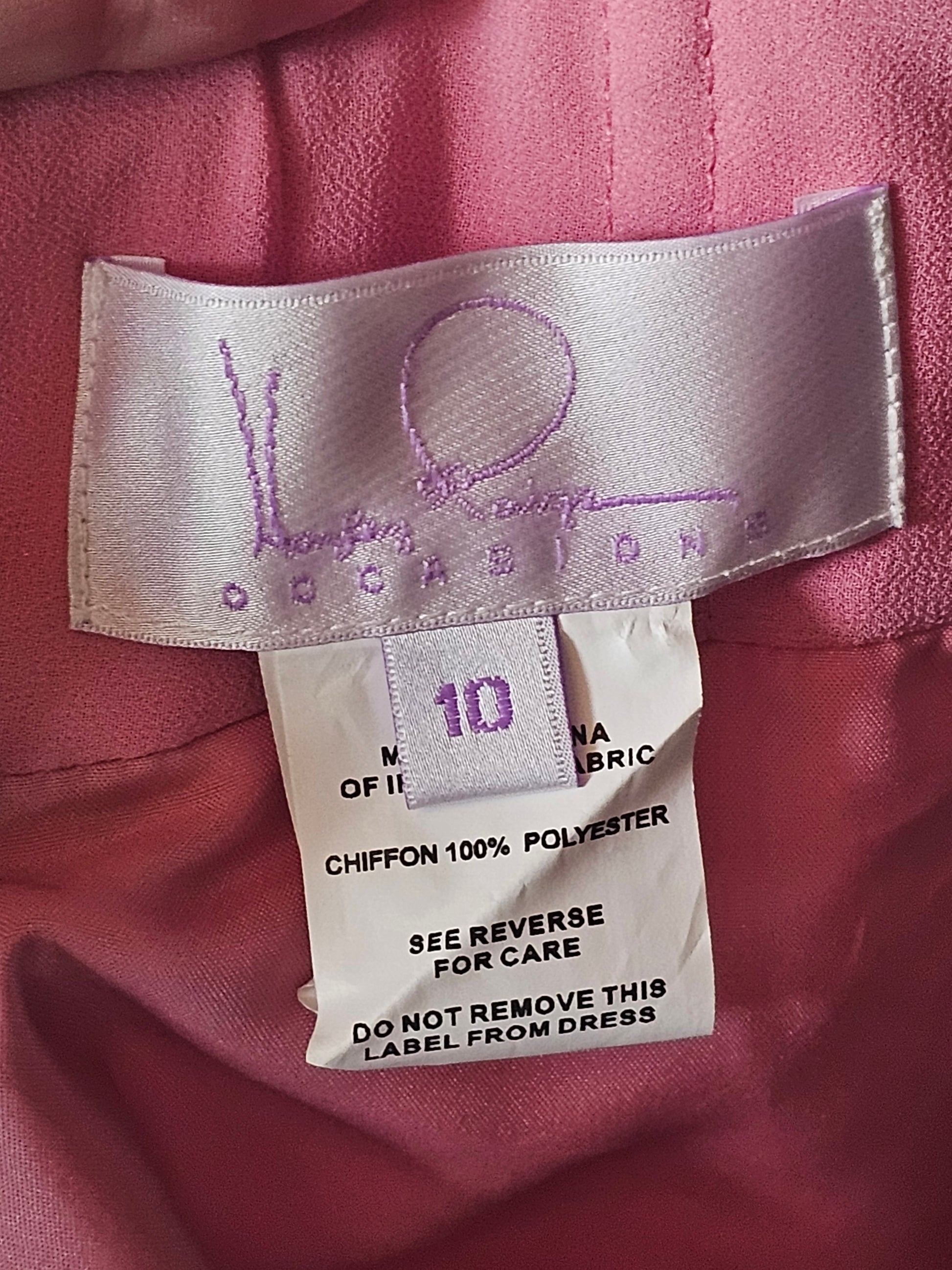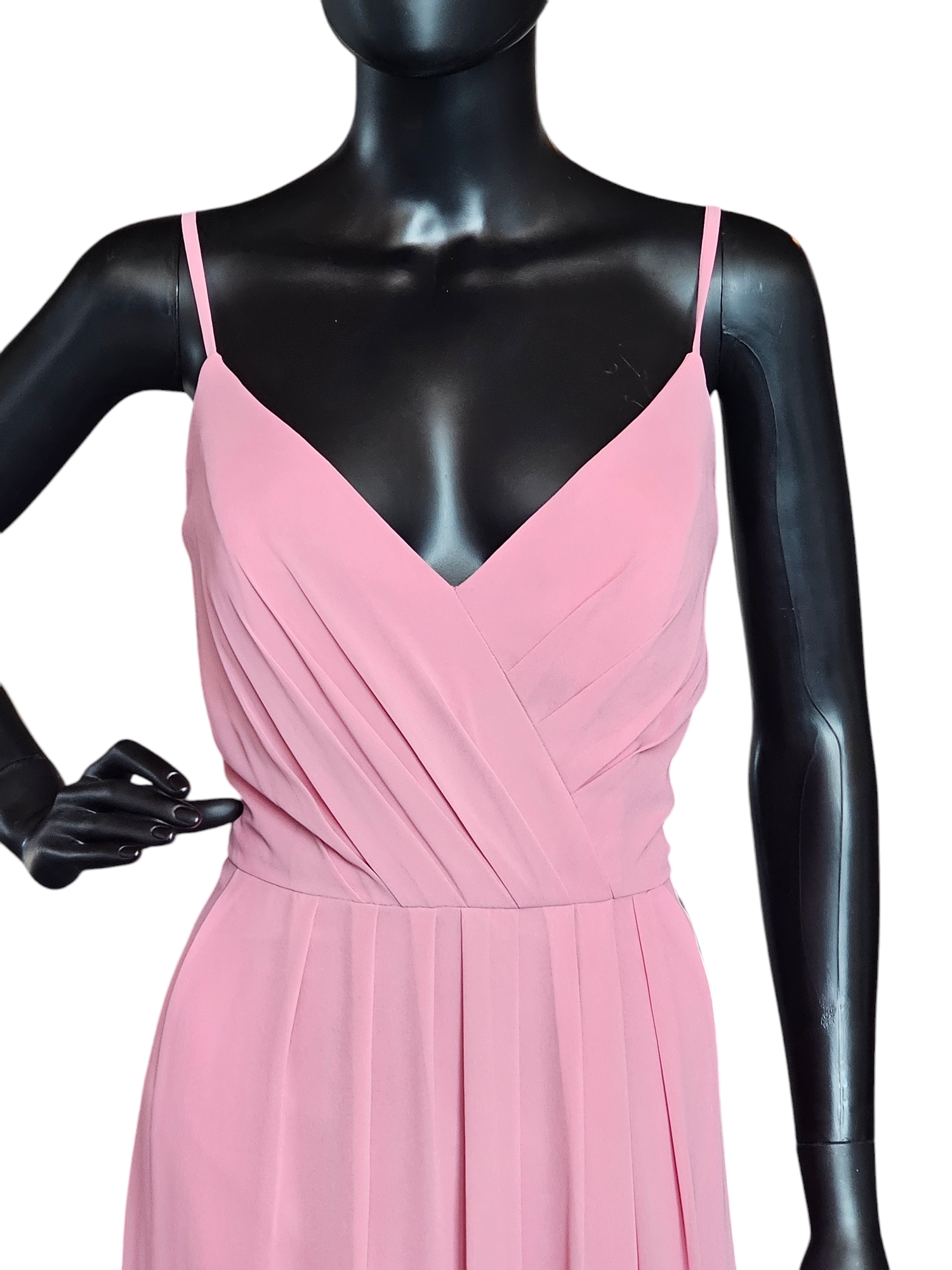 This Hayley Paige formal dress features a fun pop of bright cherry blossom pink. The soft folds of Chiffon beautifully accent the bodice and skirt, while providing a great movement. The spaghetti straps and sweetheart neckline create an elegant silhouette. A perfect choice for any formal occasion.Hayley Paige Cherry Blossom Chiffon