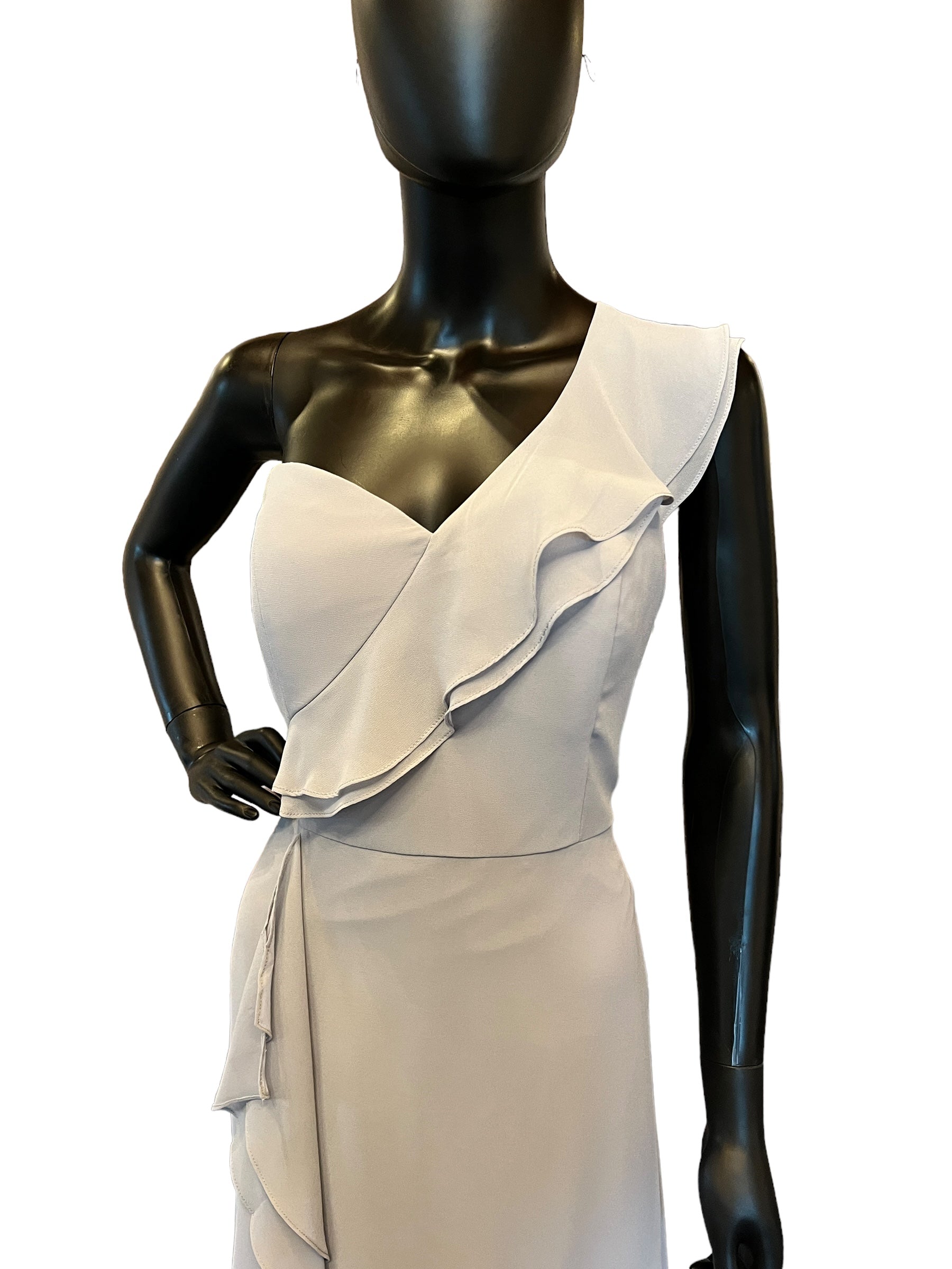 Special Attributes: Flutter one shoulder that drapes along the side to the floor