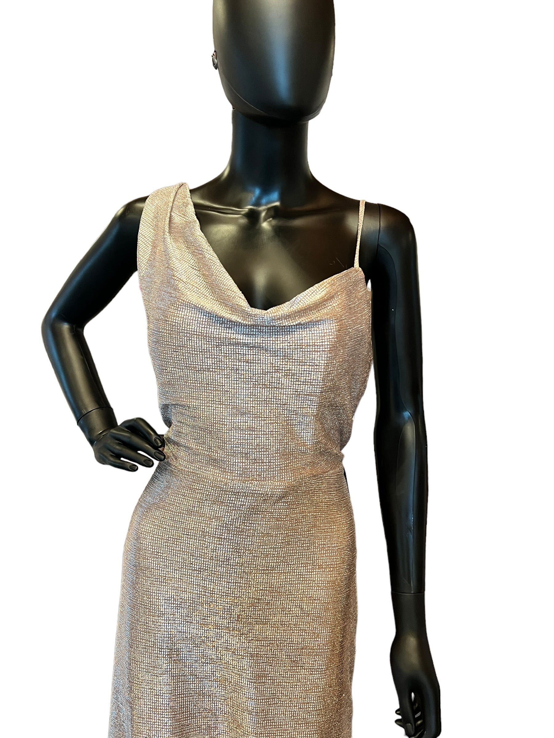 Hayley Paige Metallic Rose One Shoulder Maxi Formal Dress